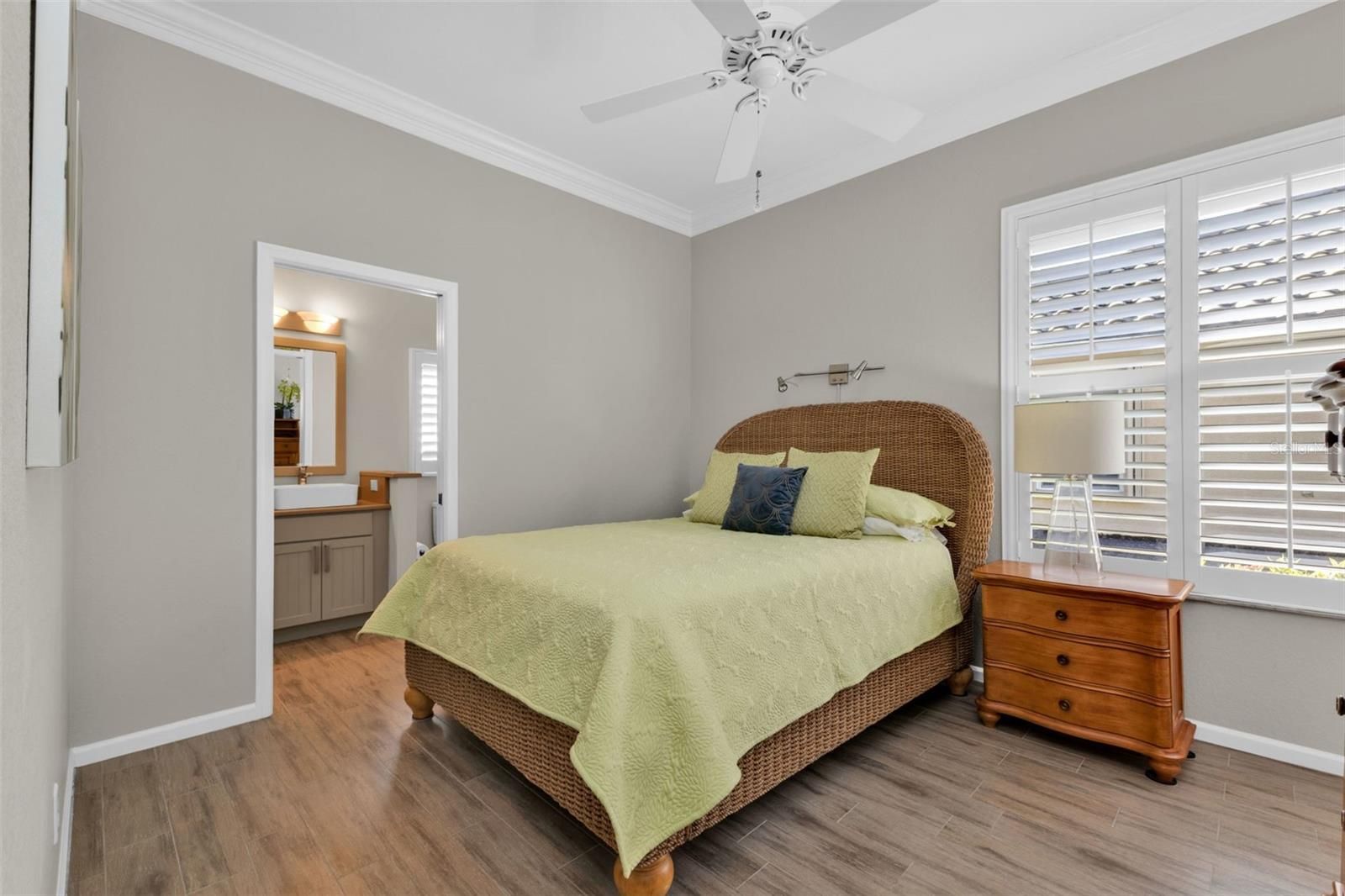 Located in the Royal Oaks subdivision of Riverwood, this beautifully updated 2-bed, 2 ½ bath home with a den or study offers peace of mind with major updates already completed, including a new roof in 2024, hot water heater in 2023, HVAC in 2021, and fresh exterior paint in 2025. Clean lines, tray ceilings, crown molding, and plantation shutters throughout create an open, polished feel. French doors lead to a flexible den or study that allows for a variety of uses. A split floor plan provides privacy for the guest suite with an ensuite bath, along with a nearby laundry room with additional storage and a new washer and dryer. Sliding doors from the main living space lead to the paver lanai, while the kitchen and custom-built-in workspace remain open to the living room for a cohesive flow. Soft taupe quartz countertops, a stainless-steel tile backsplash, solid-wood soft-close cabinetry with oversized storage, a breakfast bar, and an adjacent breakfast nook define the kitchen, while the striking built-in workspace features rich solid-wood cabinetry, generous quartz countertop space, and a beverage refrigerator. The primary suite provides a calm retreat with a spacious walk-in closet and an ensuite bath featuring dual sinks, a walk-in shower, a spa tub, a private water closet, and extensive cabinet space. The spacious lanai includes a covered area and ample room to lounge poolside, surrounded by mature landscaping that creates a private, peaceful backdrop. The refurbished heated pool features a gentle water feature, LED lighting, and a new variable-speed pool pump. Additional features include a central vacuum, Storm Smart shutters installed in 2020 with powered roll-down protection on the lanai and front door, a 2-car garage with racking and cabinetry and new gutters and downspouts. Riverwood offers an active, social lifestyle with miles of walking paths, a 24-hour fitness center, a resort-style pool with lap lanes, and a welcoming activity center. Residents enjoy tennis, pickleball, bocce, croquet, a dog park, and a full calendar of clubs, events, and entertainment. The semi-private Riverwood Golf Club is consistently rated among the top courses in the U.S. and Florida, with social memberships and pay-to-play options available. Ideally located between Sarasota and Fort Myers, residents also enjoy easy access to major highways, shopping, dining, world-class fishing, boating, waterfront dining, and the beautiful sandy beaches of the Gulf. With the beautiful furnishings negotiable outside of the contract and the important updates already completed, you can move right in and start enjoying the relaxed Florida lifestyle you’ve been dreaming of!