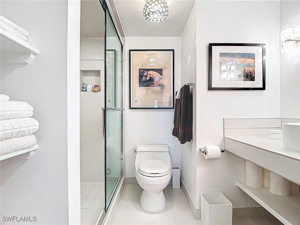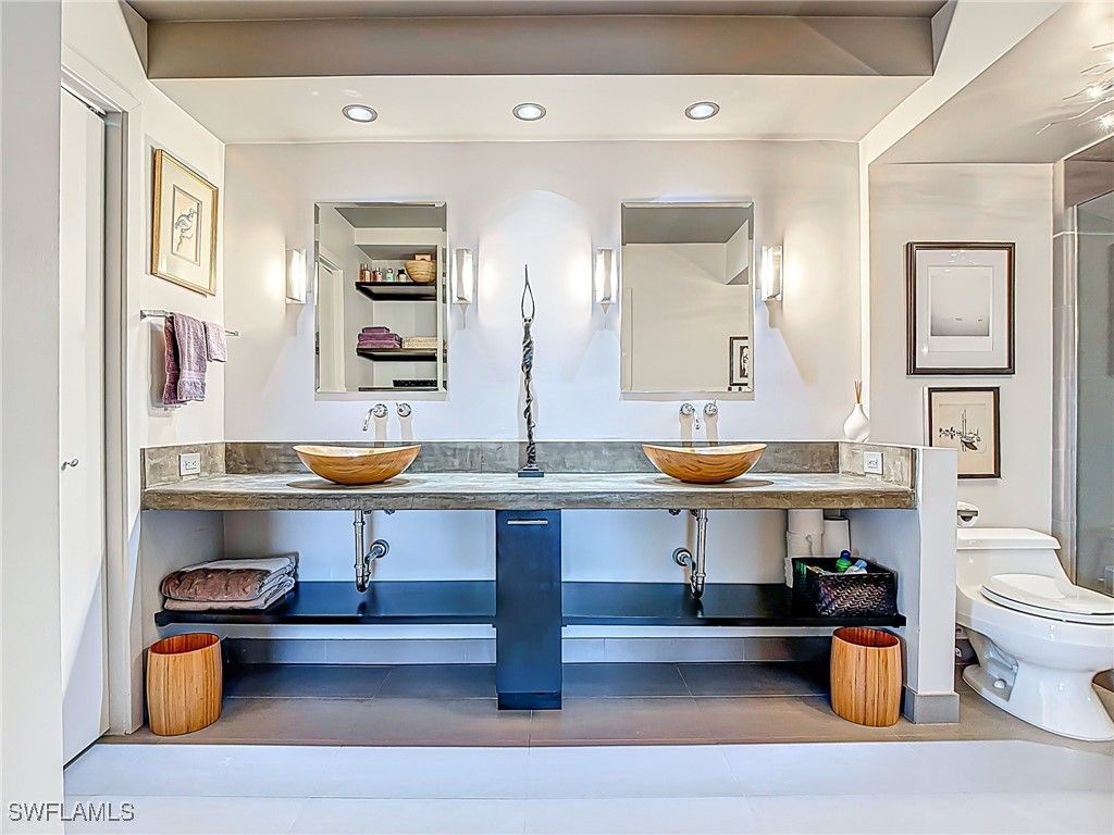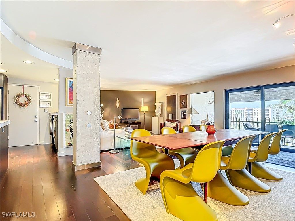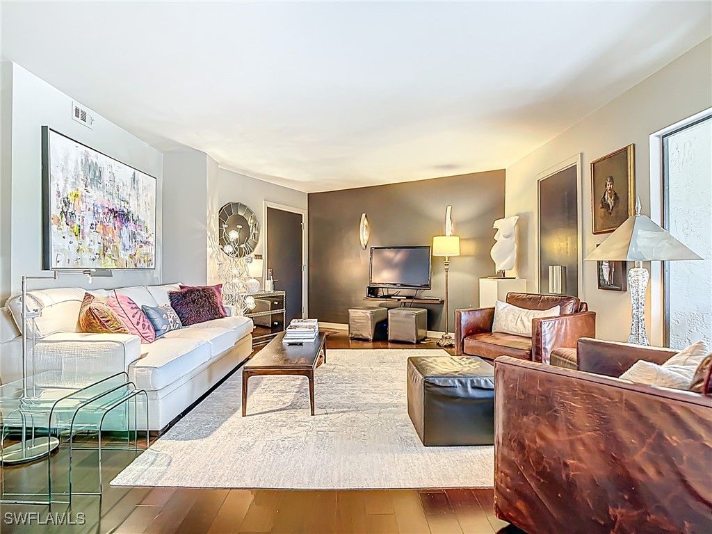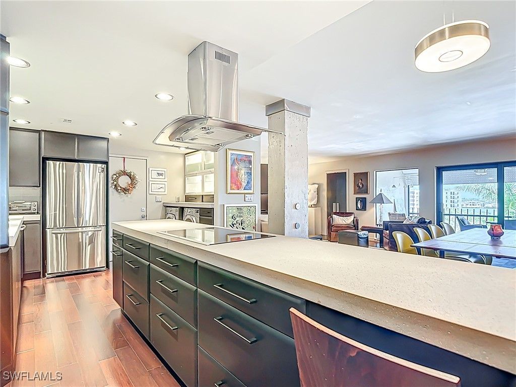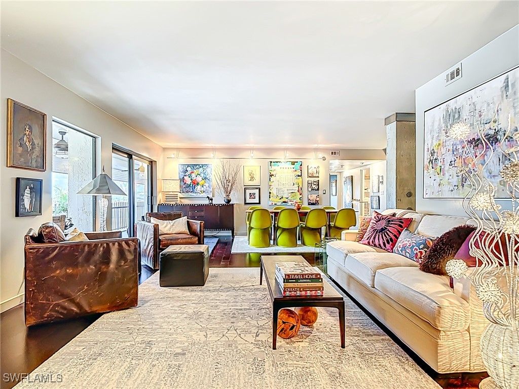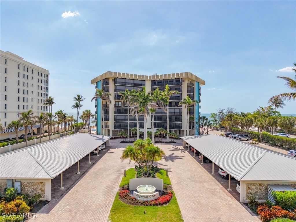 Extraordinary and stunning! No detail was overlooked in remodeling beachfront residence Imperial Club 605. An eclectic, mid-century modern 2 bedroom, 2 bath unit with gorgeous wood and tile floors. The living space features an exposed concrete column and stainless-steel finishes, adding a unique touch of modern interior design. The modern chef's kitchen is equipped with induction cooktop, custom hood range, wall oven, custom concrete countertops and cabinetry galore. A widened hallway, custom lighting and a smart, functional bathroom re-design ... a true decorator's triumph. Primary bathroom offers dual vanity, solid maple cabinetry and an enjoyable, jetted shower. Enjoy partial Gulf views from the extra-long 38 ft balcony or private primary suite balcony. Unit has deeded carport. Come enjoy the upgraded pool Area, community social room, exercise room, car wash, 2-bedroom guest suite, grilling area and so much more. Best of all you are close to Venetian Village, Old Naples and a short drive to SWFL airport.