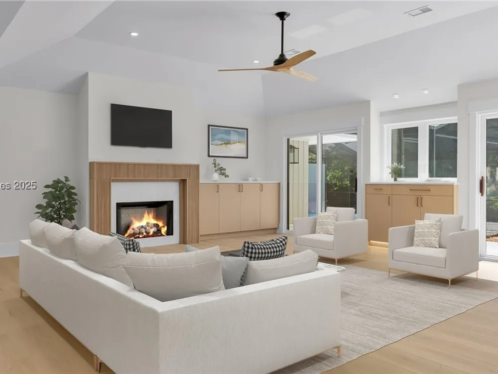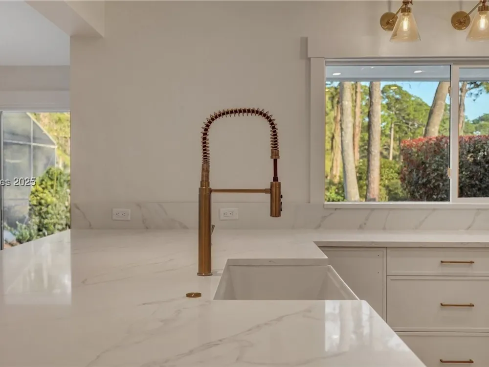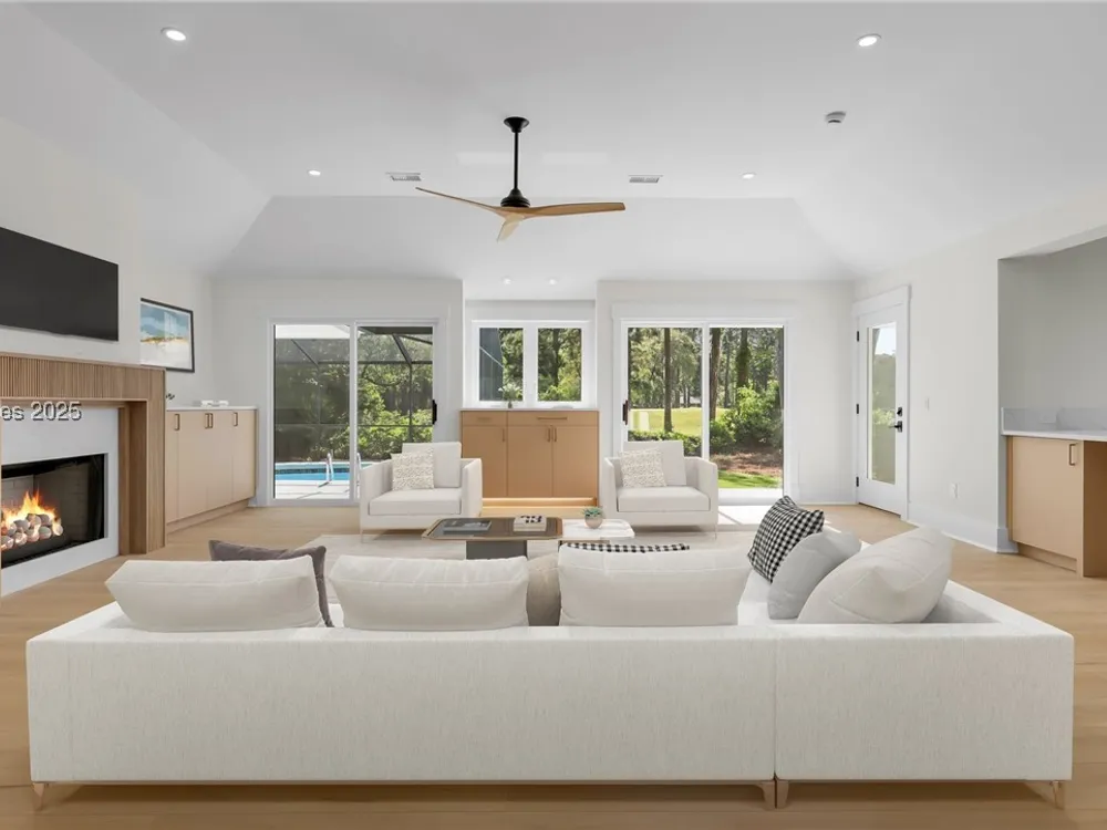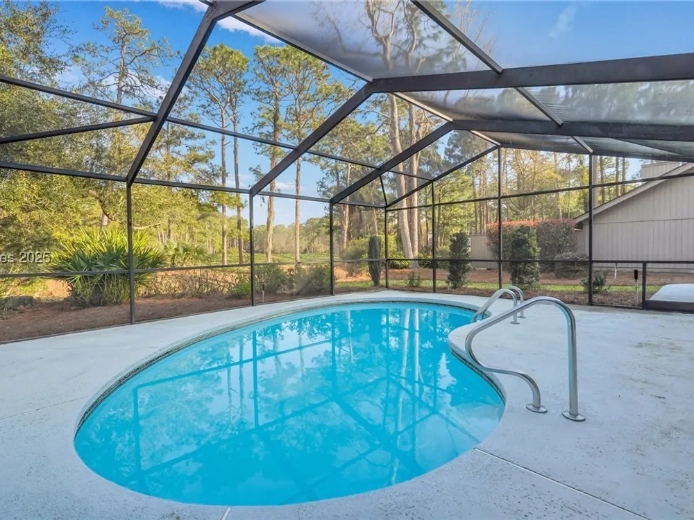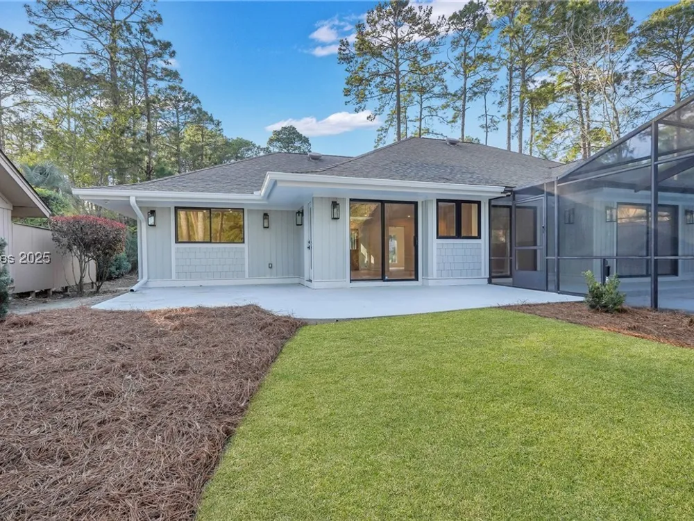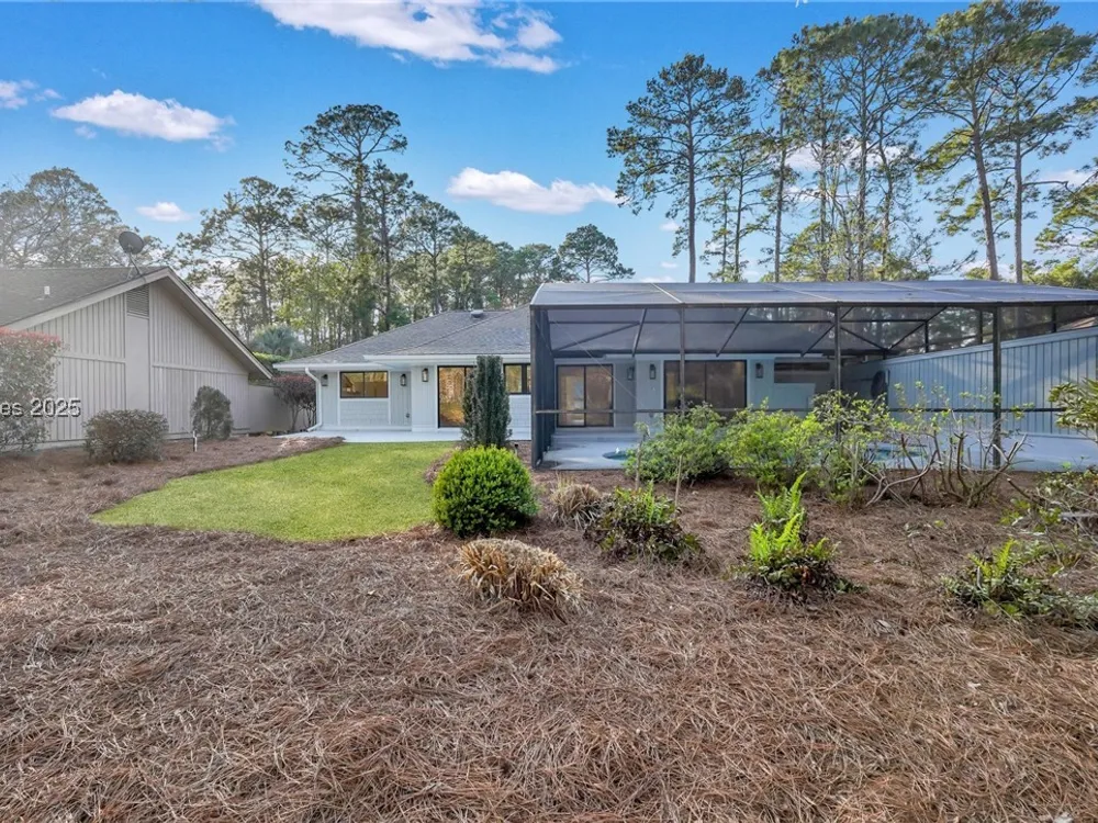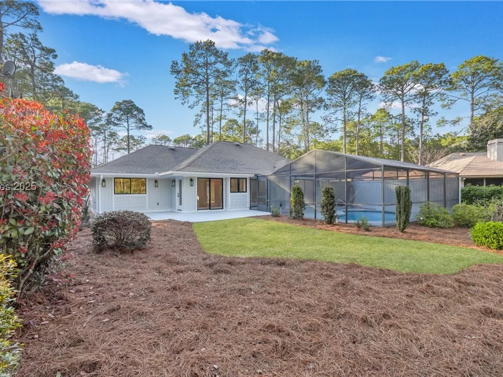 Exquisitely renovated with elegant appointments and elevated finishes, this Hilton Head Plantation home offers the best of island living in 2,623 square feet of sophistication with views out to the third green at Bear Creek Golf Club.This golf scenery entrances through wooded sightlines that provide incredible privacy to the back yards opulent outdoor spaces. Completely screened in for year-round enjoyment, the resort-style swimming pool sparkles beneath the shade of a high tree canopy. Encircling the home, a wide patio allows plenty of room for outdoor dining, grilling and entertaining while gazing out on the course.Within the home, renovations have lent an atmosphere of modern coastal flair to a gorgeous layout that puts a premium on lush natural light and open airiness. In the great room at the heart of the home, wide-plank hardwood flooring runs from custom built-in cabinetry and a wide gas fireplace at one end and into the gourmet kitchen. In between, a custom-built dry bar looks out on the outdoor living spaces.Beautifully opened to the main living space for effortless entertaining, the kitchen is a hosts dream, with its wide center island, plentiful counterspace, flat cooktop range beneath range hood, beverage fridge, panel refrigerator and expansive back kitchen in the nearby laundry room. And throughout, the space looks as well as it cooks, with marbled granite backsplashes and brushed metallic hardware that cut a modern profile.The single-story layout of the home spirals away from the main living spaces into quieter, more intimate corners for relaxation. A spacious office can also serve as a flex space, while a pair of bedrooms each enjoy spacious closets and full baths. The primary suite is a getaway unto itself, with its soaring tray ceiling guiding the eye toward private access to the screened lanai. At the far end of this generously sized suite, modern style and spaciousness combine for an en suite bath that could serve as a personal spa getaway. A massive walk-in shower with custom stone work and dual wall-mounted vanities exult in modern stye while indulging with sheer comfort. With golf living just around the bend and inspired renovations that create an atmosphere of modern sophistication, this property represents your chance to live the Hilton Head Island lifestyle of your dreams.