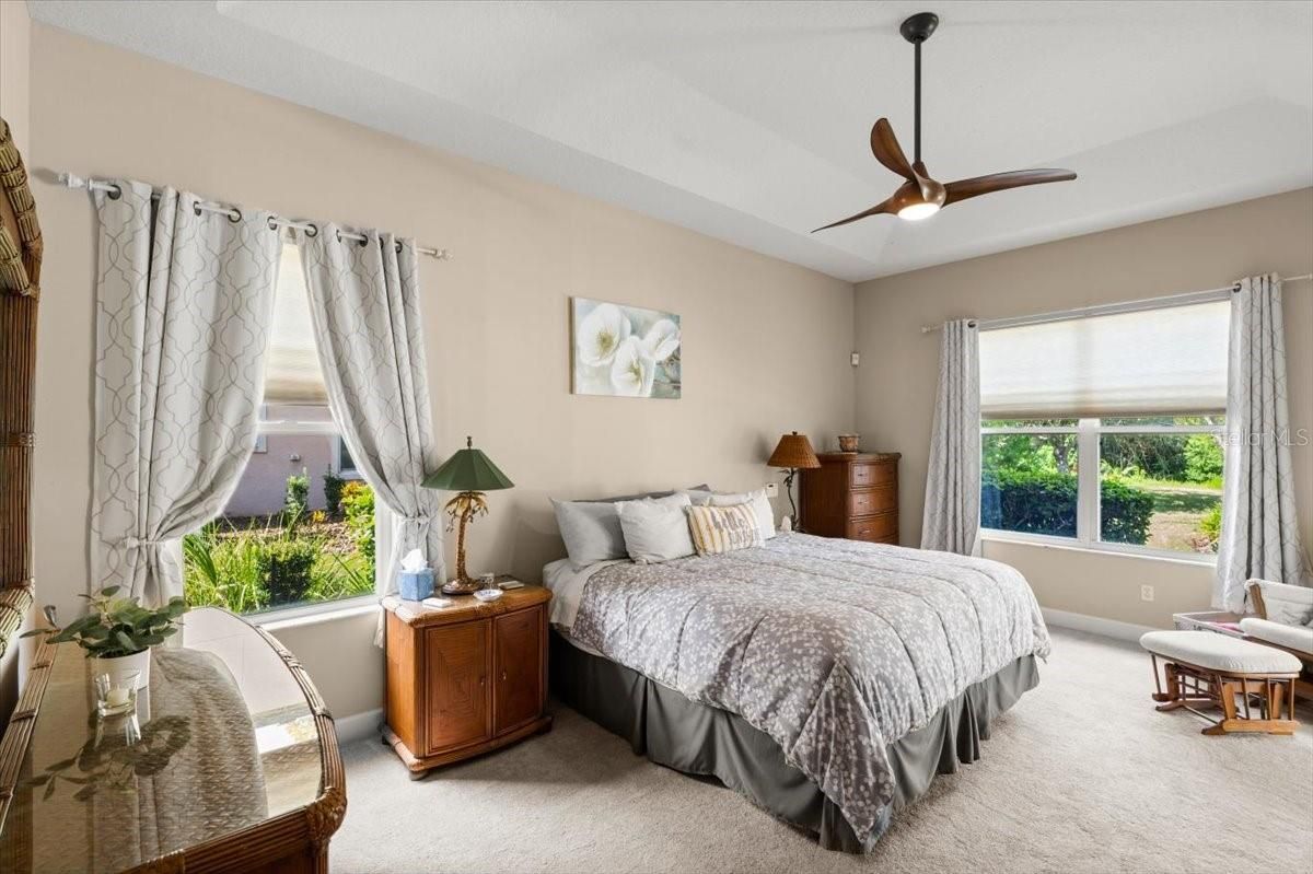 - Built-in Features, Ceiling Fan(s), Eat-in Kitchen, High Ceilings, Kitchen/Family Room Combo, Living/Dining Room, Open Floorplan, Main Level Primary, Solid Surface Counters, Split Bedrooms, Stone Counters, Tray Ceiling(s), Walk-In Closet(s)