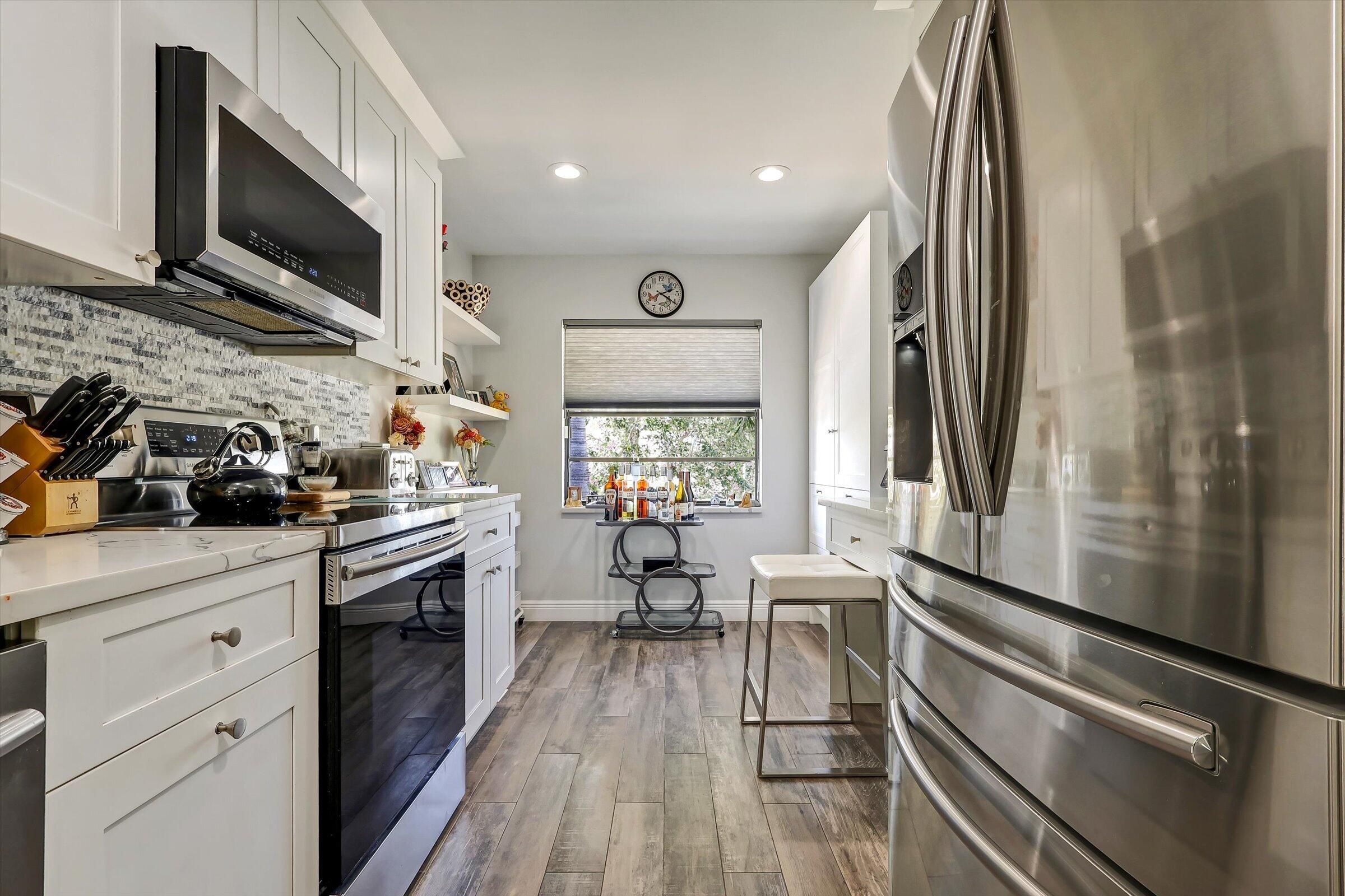 NEWLY RENOVATED top-floor condo with golf and water views, being sold FURNISHED!! This contemporary style unit features a spacious great room layout with 2 bedrooms and 2 baths, plus a screen-enclosed balcony perfect for enjoying Florida sunrises. High-end upgrades include LED lighting, wood-look tile flooring throughout the living spaces, premium carpet in the bedrooms, a gourmet kitchen with white shaker cabinetry, Carrera style quartz counters and Samsung stainless steel appliances. The large primary retreat offers multiple outfitted custom closets and a spa-style en-suite bathroom with dual-vanity, separate frameless shower, and soaker tub. HVAC and HW Heater have been recently replaced. Unit includes access to semi-private elevator