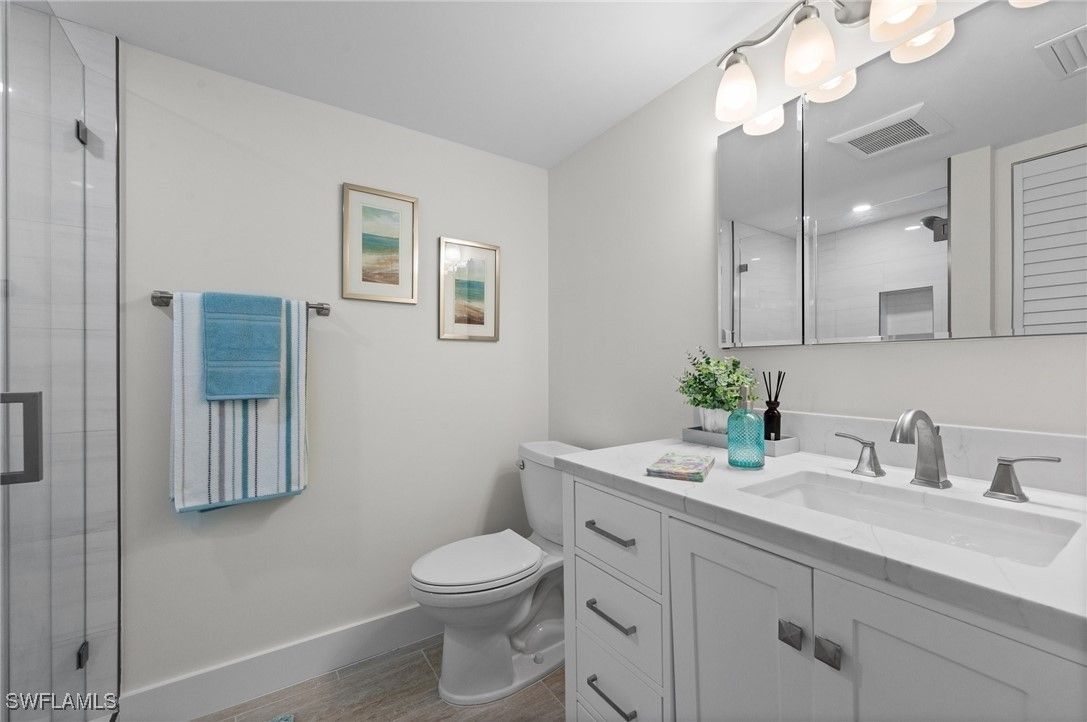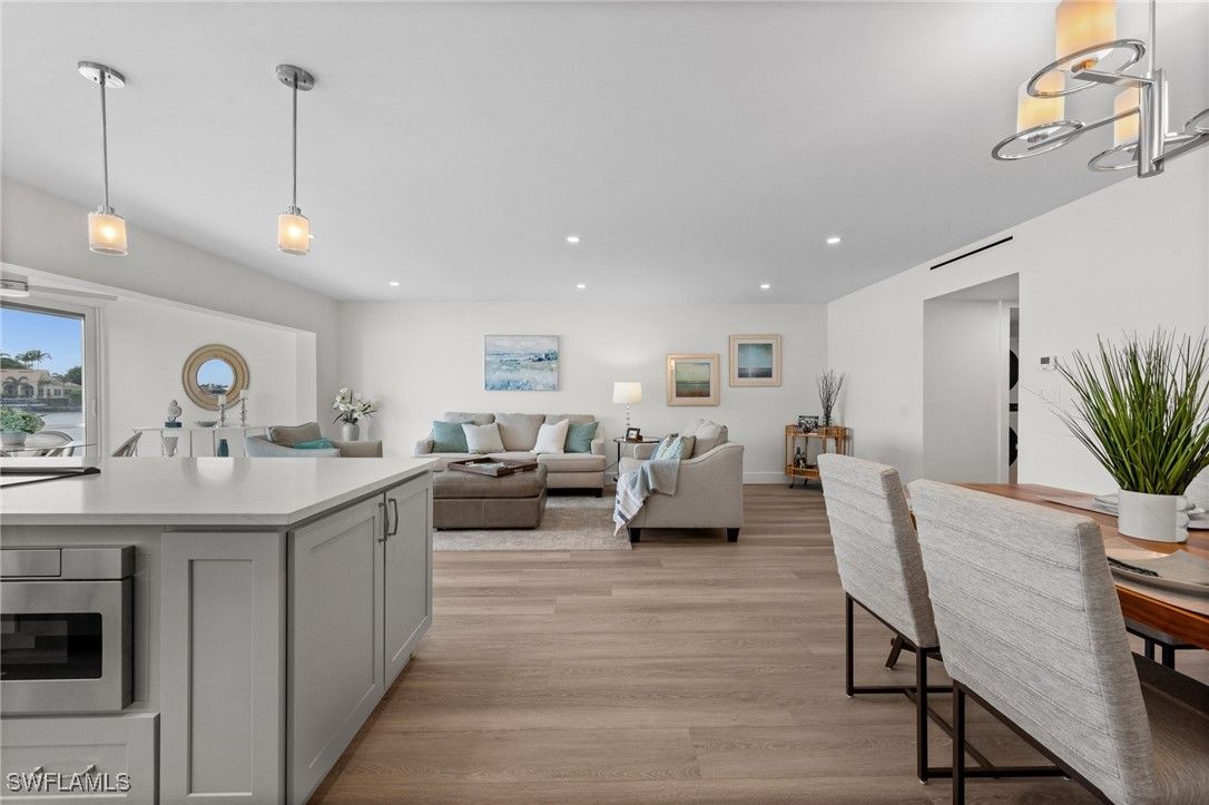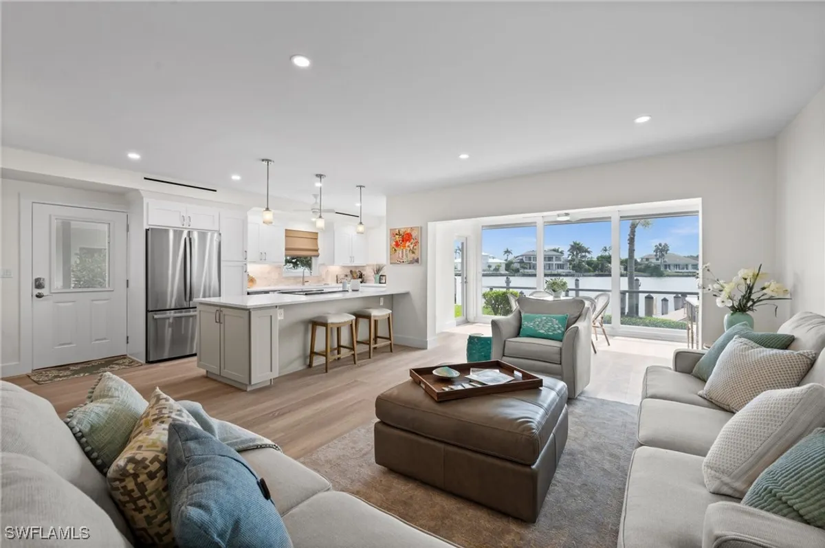 This rarely available, completely renovated 3-bedroom residence offers 1 covered parking space and the ease of a first-floor walk-out and the feel of a private single-family home. Every inch has been thoughtfully reimagined—from the concrete up—with sophisticated, coastal-inspired finishes throughout, giving it a charming coastal flare. This condo is perfect as a vacation getaway or a primary residence. Step inside to an open, light-filled layout that frames unobstructed views of Moorings Bay. The stunning kitchen features quartz countertops, a generous island with seating, top-tier stainless steel appliances, and custom cabinetry—perfect for entertaining or everyday living. The primary suite boasts dual closets and a beautifully appointed en-suite bath, while the additional bedrooms and bath provide comfort for guests. In unit laundry room adds convenience. Enjoy your morning coffee or host sunset gatherings at the waterfront pavilion just outside your door. Residents have access to Moorings Beach Park for a nominal annual fee, or you have beach access just across the street for a day on the sand, or explore the boutiques and dining at Venetian Village nearby. Located on the prestigious Gulf Shore Blvd, this is Naples waterfront living at its best—close to world-class shopping, dining, and the sparkling Gulf beaches.