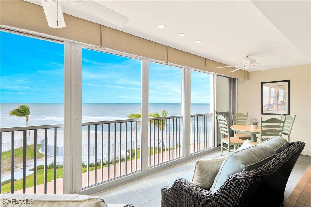 Welcome to Dolphin View ~ Sophisticated Boutique Beachfront Living. Wake up to the soothing sounds of the Gulf and take in breathtaking panoramic views from this tastefully updated beachfront residence. Nestled in the prestigious Moorings neighborhood, this rare gem offers an elevated coastal lifestyle just steps from the shore, with exclusive concierge services ensuring effortless luxury. Offered at pre-pandemic pricing, this home presents an exceptional value as the best-priced beachfront property on the market. From its beachside vantage, enjoy unobstructed views of the Gulf, creating a front-row seat to mesmerizing sunsets. Situated in an exclusive, low-density community, residents benefit from private beach access and on-site management, ensuring an intimate and tranquil retreat. Positioned in the coveted 3-stack location of the West Tower, this residence boasts one of the most sought-after floor plans, designed for seamless comfort while hosting and entertaining. The spacious and open layout flows effortlessly into an expansive lanai—an ideal setting for morning coffee or evening cocktails against a stunning coastal backdrop. Three luxurious master suites each feature en-suite bathrooms and custom-built designer closets, offering the ultimate in privacy and comfort. Resort-style boutique amenities enhance the experience, including a heated pool, spa, fitness center, and an elegant social lounge. Located just minutes from Venetian Village, 5th Avenue, and Waterside Shops, the home provides easy access to fine dining, upscale shopping, and luxury boutiques. Indulge in Naples’ renowned culinary scene, where exceptional restaurants offer everything from fresh seafood to gourmet international cuisine, all just moments from your doorstep. This rare end-unit combines elegance, comfort, and exclusivity with refined designer finishes, ample storage, and under-building parking—all completely move-in ready. Now available at an exceptional value, this is a rare opportunity to own a sophisticated beachfront residence in one of Naples’ most coveted coastal communities. Don’t miss your chance to experience the ultimate in beachfront luxury. The association owns the land.