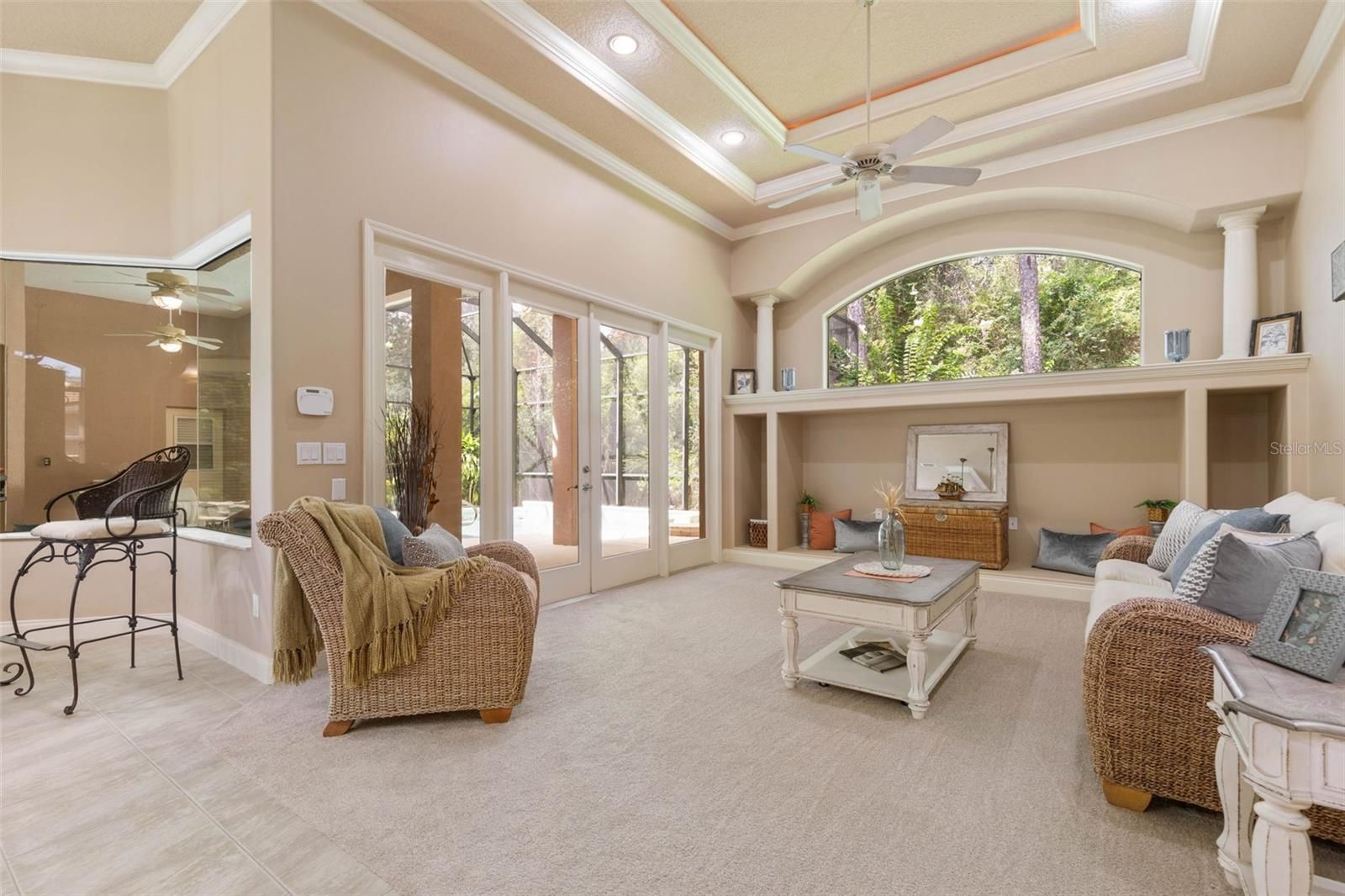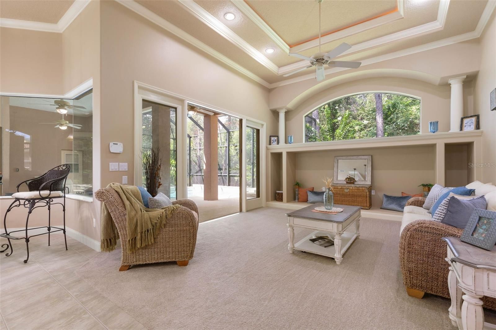 Luxury Home with pool & spa in Halifax Plantation. Welcome to this meticulously maintained Ruebel-built custom home in the prestigious Halifax Plantation golf course community. Just minutes from The Loop scenic drive and the beach, this property is the epitome of luxury and functionality, offering a host of high-end upgrades. Upon entering the tiled foyer, you will find Key Features such as brand new neutral carpet, paint and tile, a Heated Saltwater Pool & Spa where you can relax in your private pool with waterfall jets, lights, and a vacuum system. The pool pump is less than 2 years old, and a convenient pool bath is just off the patio. Stylish Interior Upgrades include a keyless entry for ease of access, custom built-ins and glass shelving in the kitchen, dining room and family room has a built in for TV and more. There is an entertainment stand in the garage that fits perfectly in this space that can convey with the sale. The laundry room off the kitchen is large with a window and a wash tub. The home has French doors leading to outdoor spaces, tray ceilings with rope lighting, crown moldings, large baseboards, upgraded cabinetry with granite countertops, under cabinet lighting, a moveable island and tile backsplash in the kitchen, also stainless steel appliances, surround sound wiring in the living room and lanai for seamless entertainment. The owner's suite is very private with French doors leading to the pool and a lovely en suite bath with large glass block shower with seat, private water closet, soaking tub, vanity makeup area and a walk in closet that could be its own room measuring 12.6 x 12. The pool screen was just Re-screened over the entire lanai (brand new) with updated ceiling fans for year-round enjoyment. Brand New AC, water heater, and fresh paint throughout for a move-in-ready feel. Hurricane-insulated garage door and pest control tubing for added safety and convenience. Outdoor Amenities include a deep water well irrigation system to maintain your lush landscaping. Spacious side-entry garage with natural light from additional window and storage (Florida Basement) above with wide pull down stairs. There is an extra deep parking pad to allow for more ease in backing out of the garage and more vehicle parking. A relaxing lanai with a slop sink and plumbing ready for an outdoor kitchen. A newer Roof (2021) for long-term peace of mind. This home is in a prime location and is perfectly positioned within Halifax Plantation, offering easy access to golf, tennis, a fitness center, and dining at the clubhouse. Its proximity to scenic drives, parks, and beaches makes it a true lifestyle property. This turnkey home combines luxury, practicality, and timeless design in one of Ormond Beach's most desirable communities. Schedule your showing today!