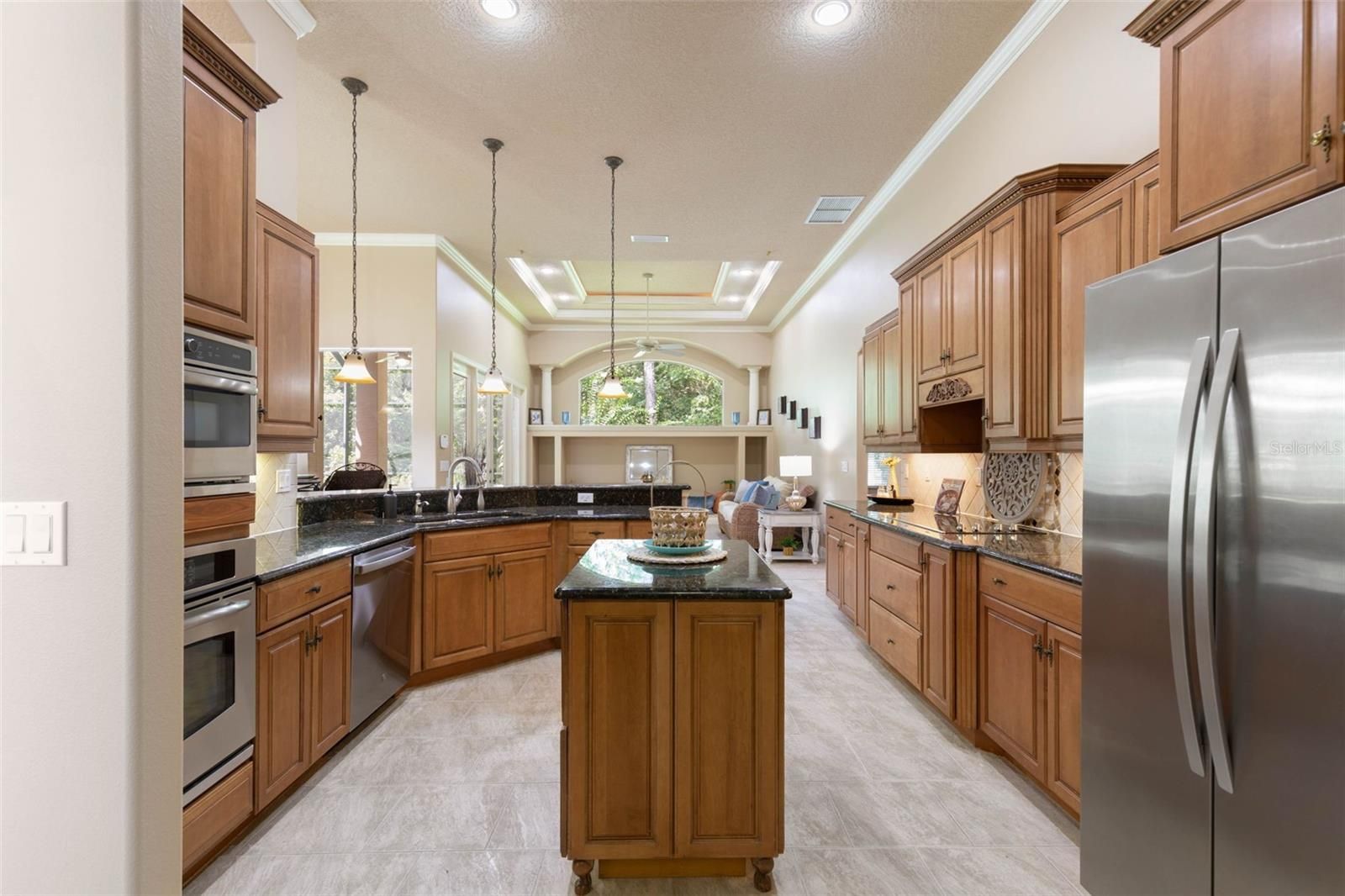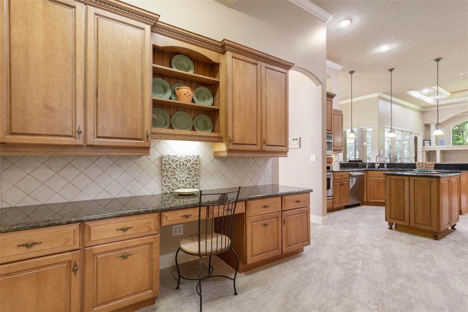 - Built-in Features, Ceiling Fan(s), Crown Molding, Eat-in Kitchen, High Ceilings, In-Wall Pest Control, Kitchen/Family Room Combo, Open Floorplan, Main Level Primary, Solid Surface Counters, Solid-Wood Cabinets, Split Bedrooms, Stone Counters, Thermostat, Tray Ceiling(s), Walk-In Closet(s)