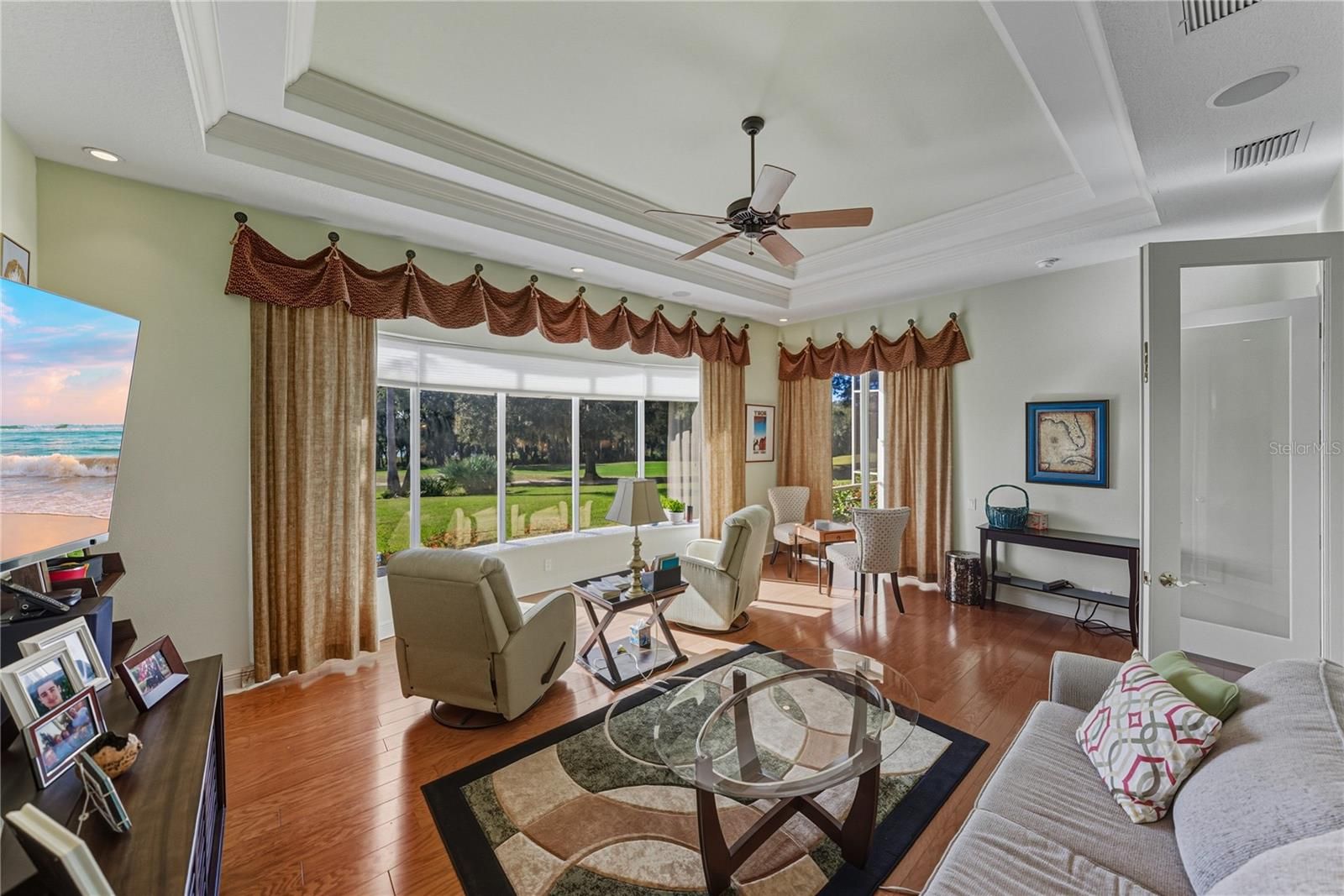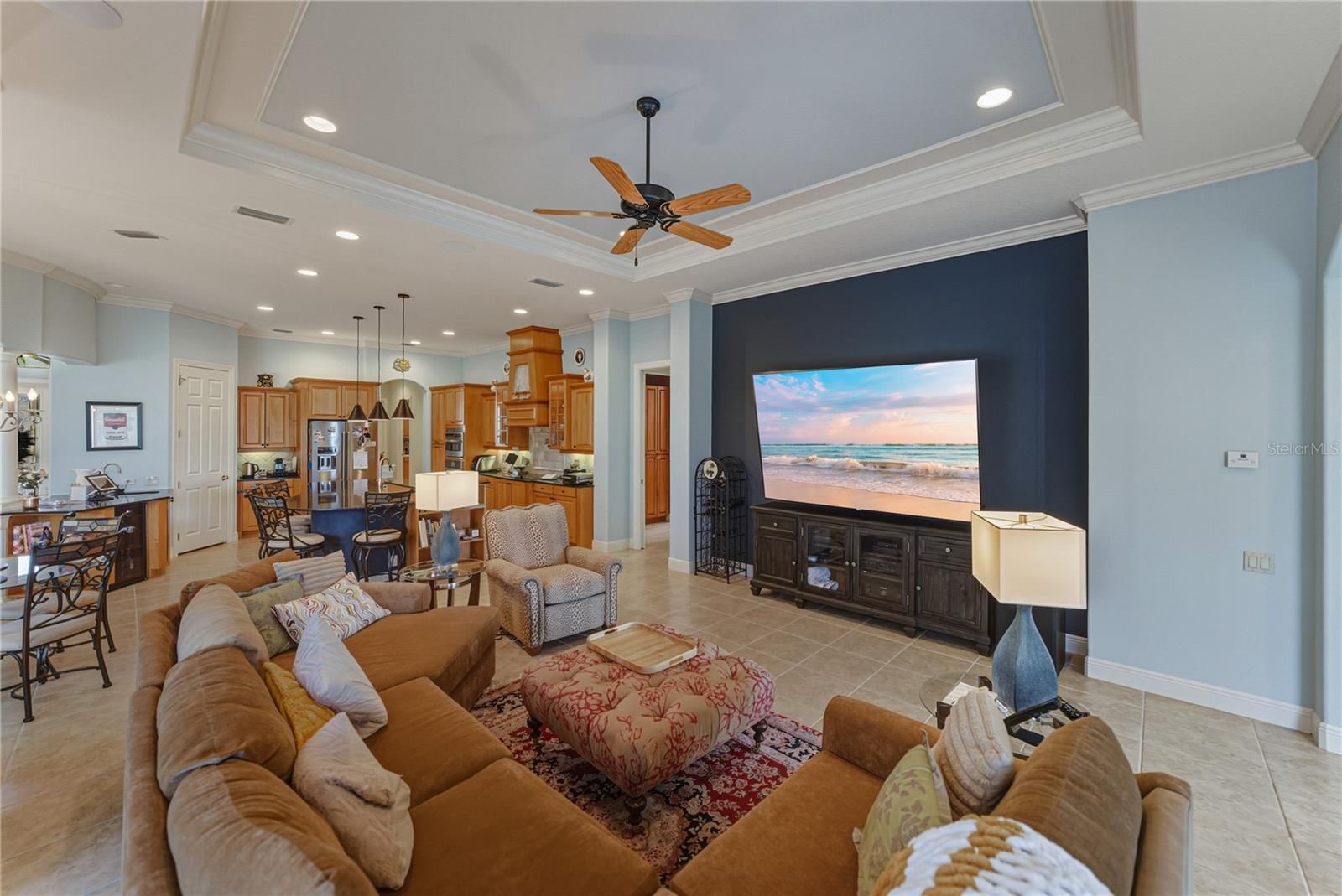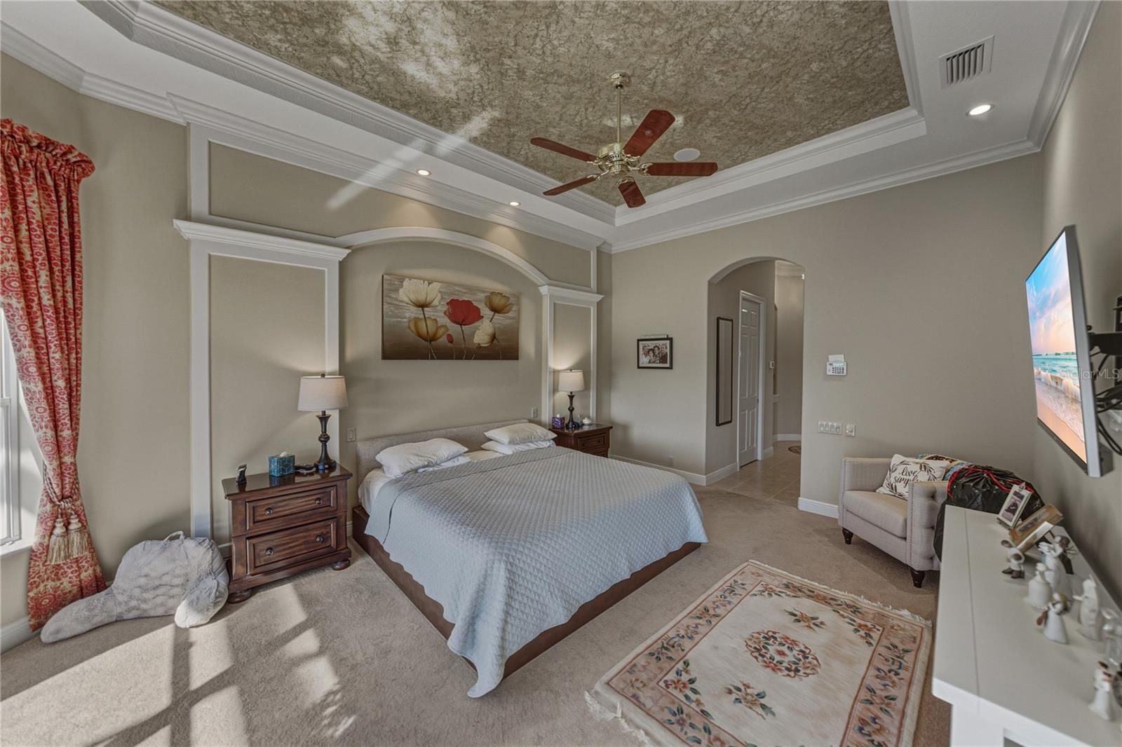 - Ceiling Fan(s), Central Vacuum, Chair Rail, Crown Molding, Eat-in Kitchen, High Ceilings, Kitchen/Family Room Combo, Living/Dining Room, Open Floorplan, Main Level Primary, Solid-Wood Cabinets, Split Bedrooms, Stone Counters, Tray Ceiling(s), Walk-In Closet(s), Wet Bar