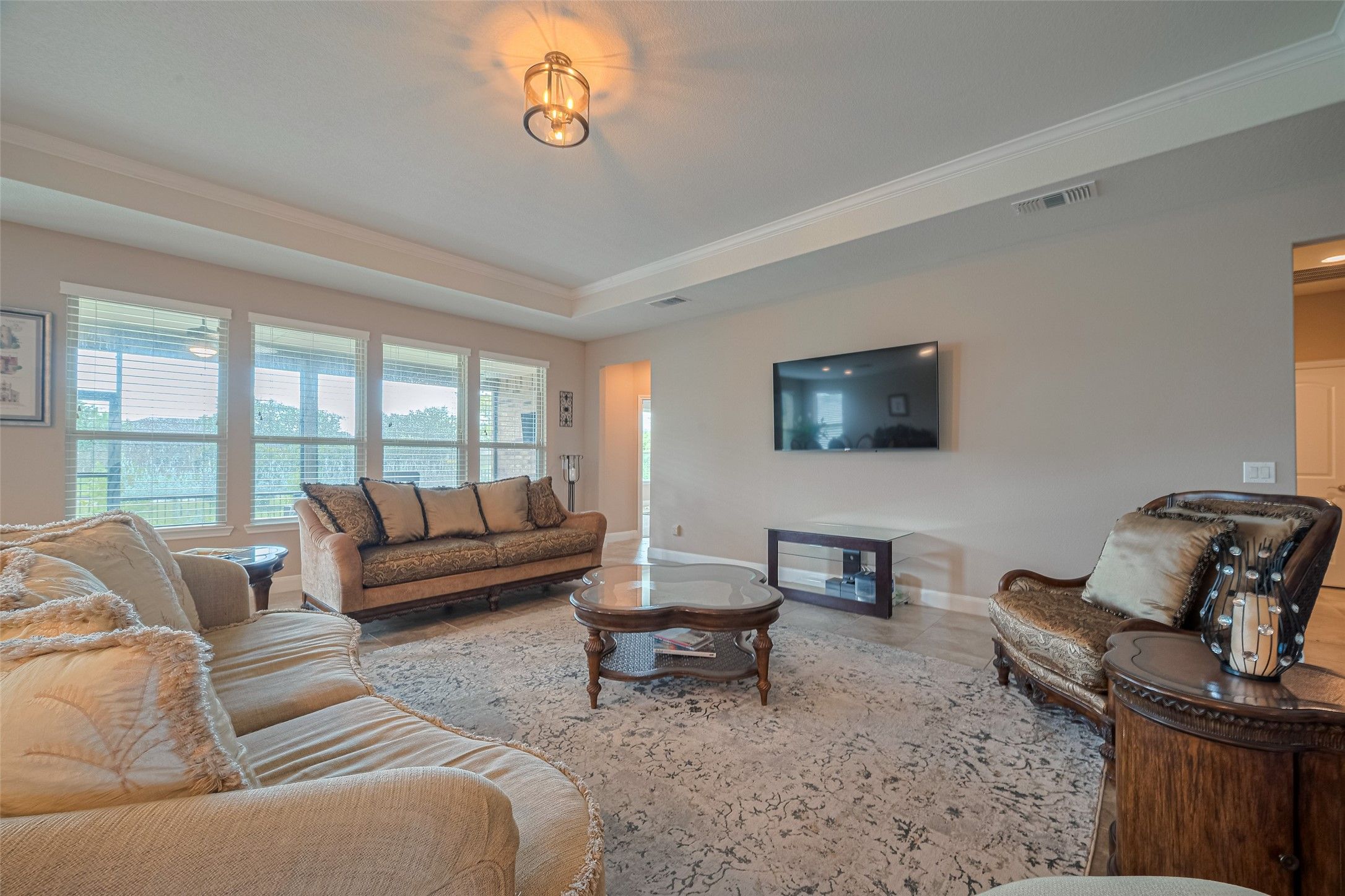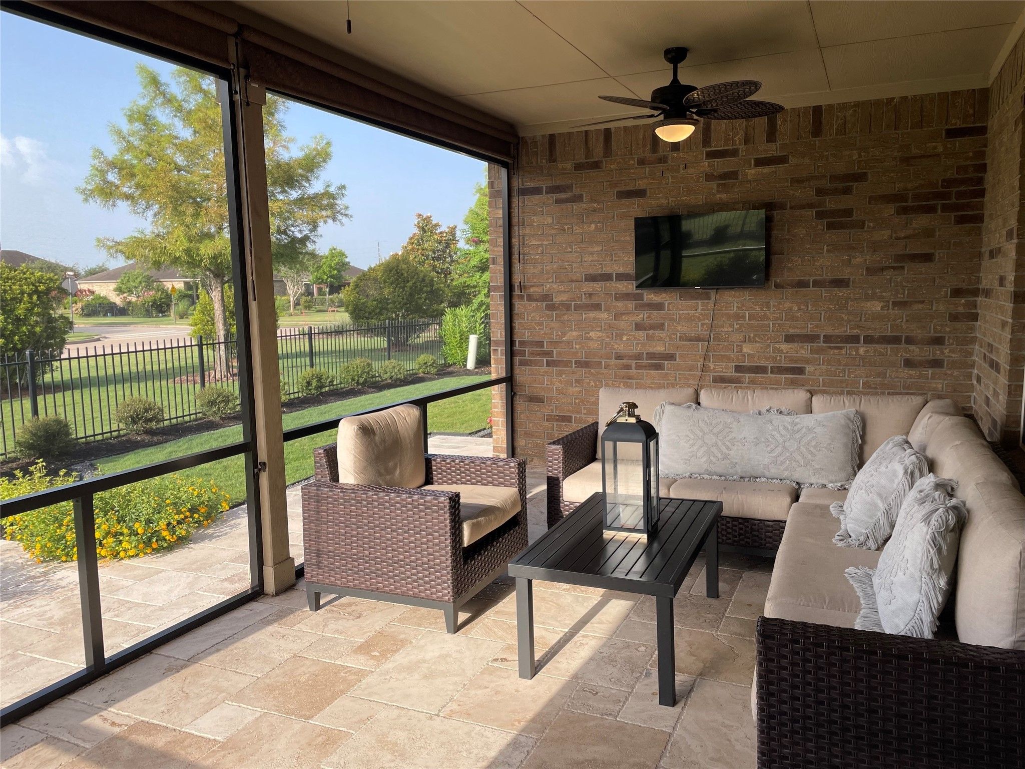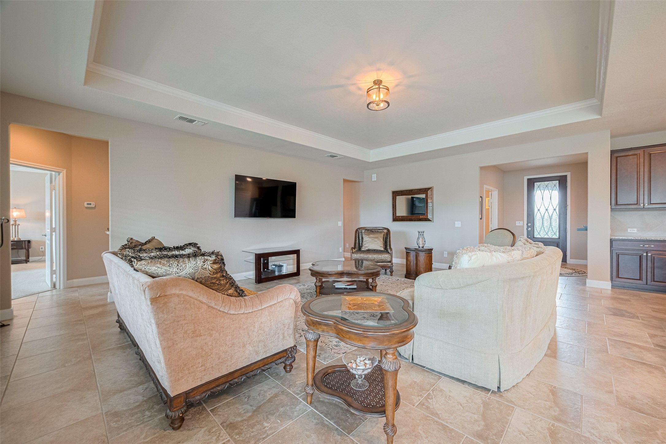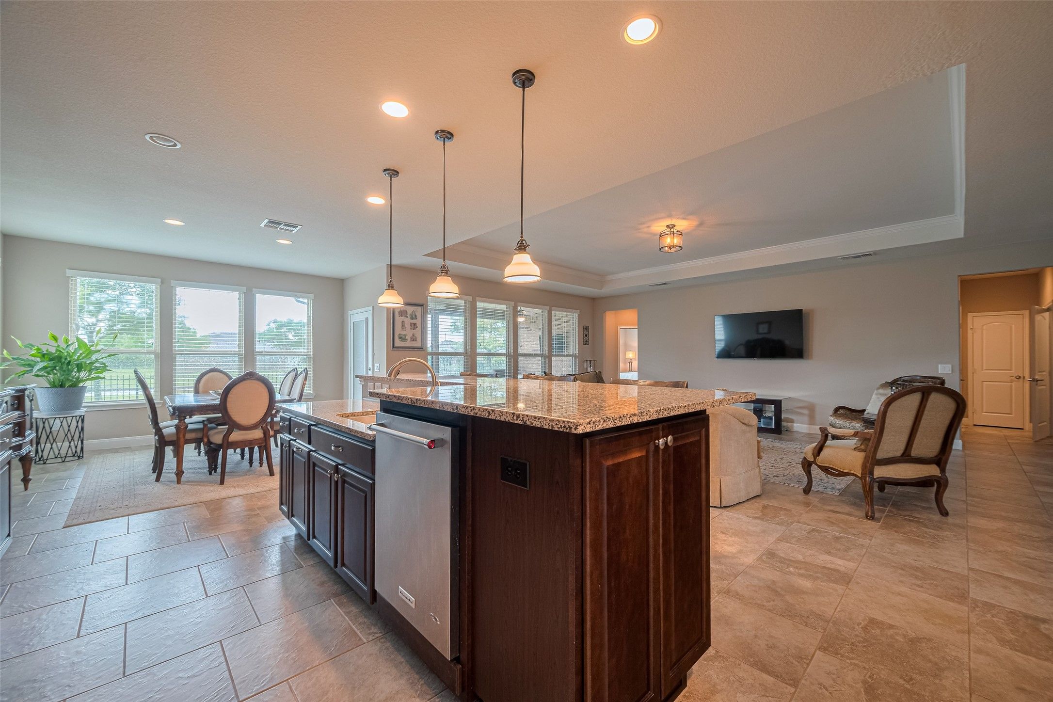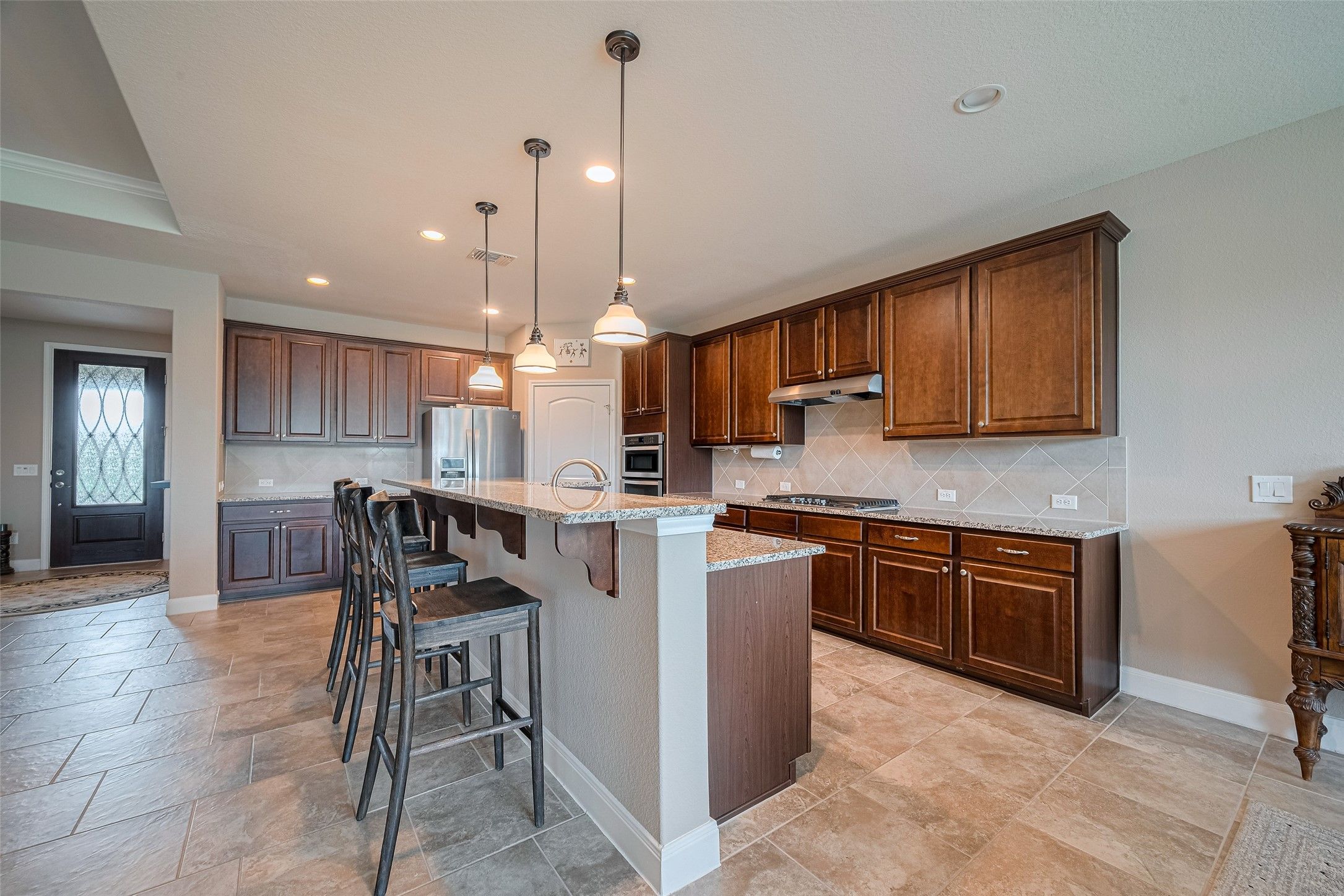 Gorgeous home with attractive brick and stone elevation with huge covered front porch boasting Travertine tile. 3-car tandem garage providing extra storage space or golf cart parking! The highly desirable MAGNOLIA floor plan can be downloaded under attachments. The gourmet island kitchen offers granite counters, breakfast bar area and over-sized cabinetry. Stainless Steel appliances include Whirlpool oven and microwave, double under-mount sink, 5 burner gas cook top. The Kitchenaid dishwasher is raised for easy loading and unloading. Bonus the refrigerator stays! The family/living room features tray ceiling with views of the screened in patio with recent ceiling fans. The primary bedroom is very spacious with plenty of room for a sitting area with serene views of the backyard. The backyard was professionally landscaped in 2024 with shrubs, prolific flowering rose bushes, lantana, oleanders and Yaupon holly. The Travertine patio was extended in 2024 with path to the gate and greenbelt.