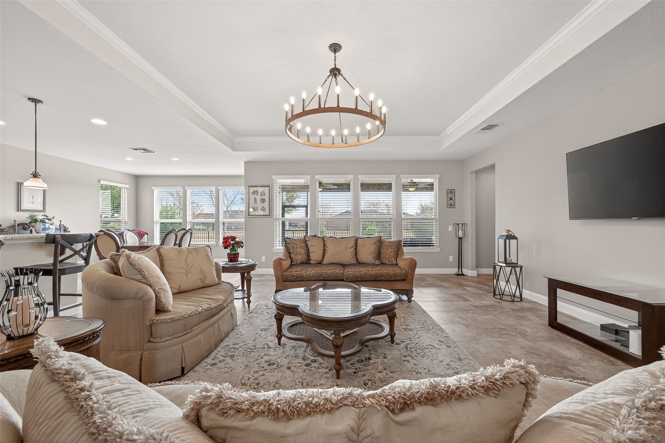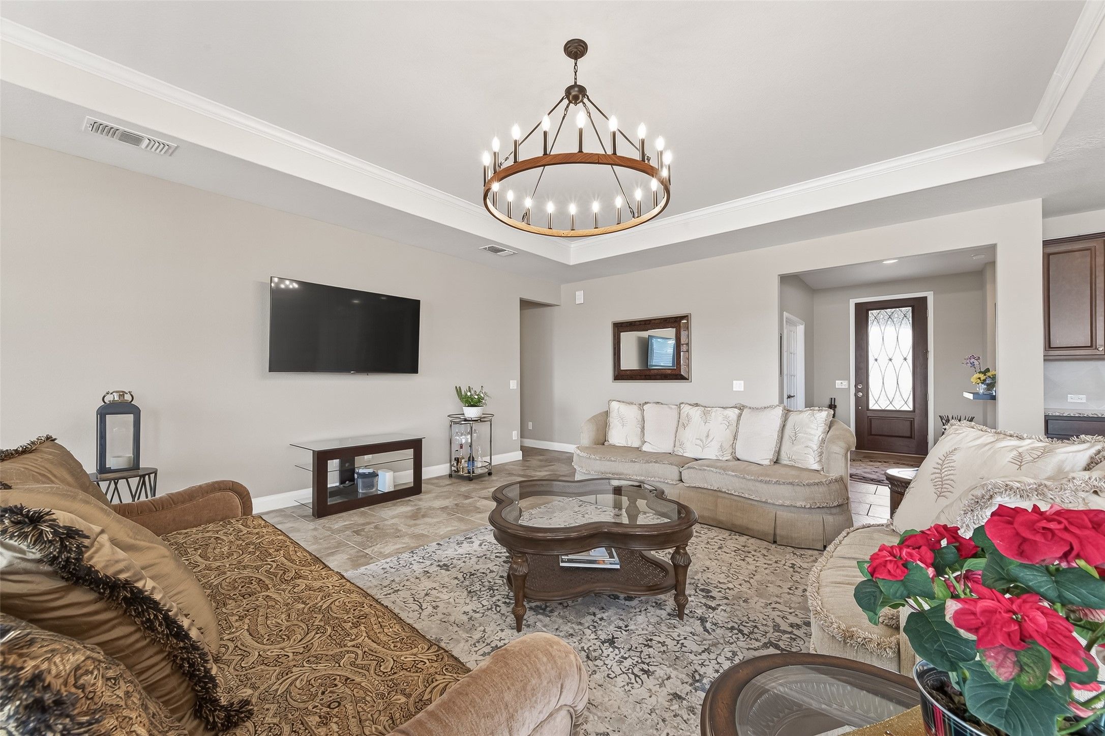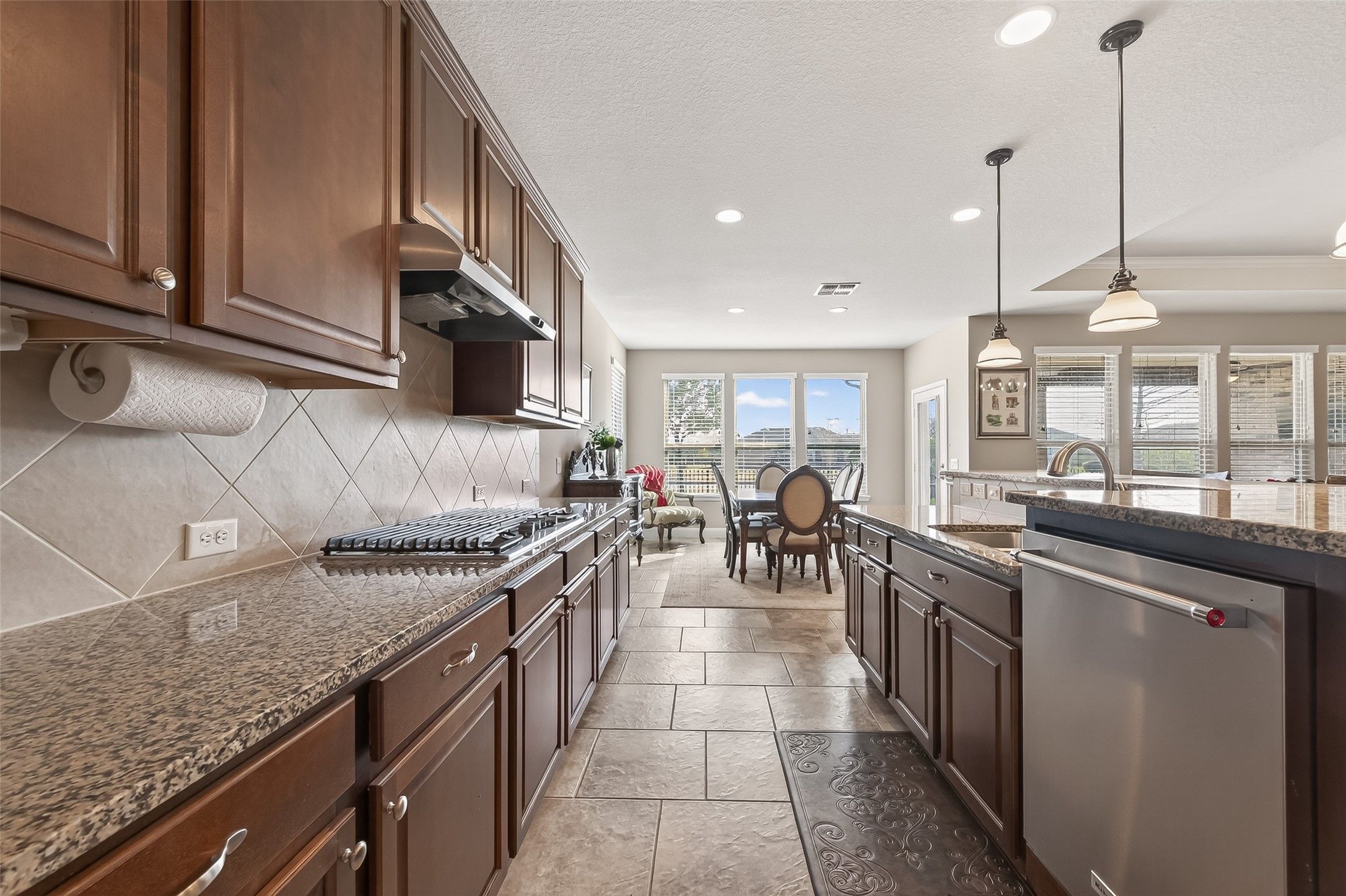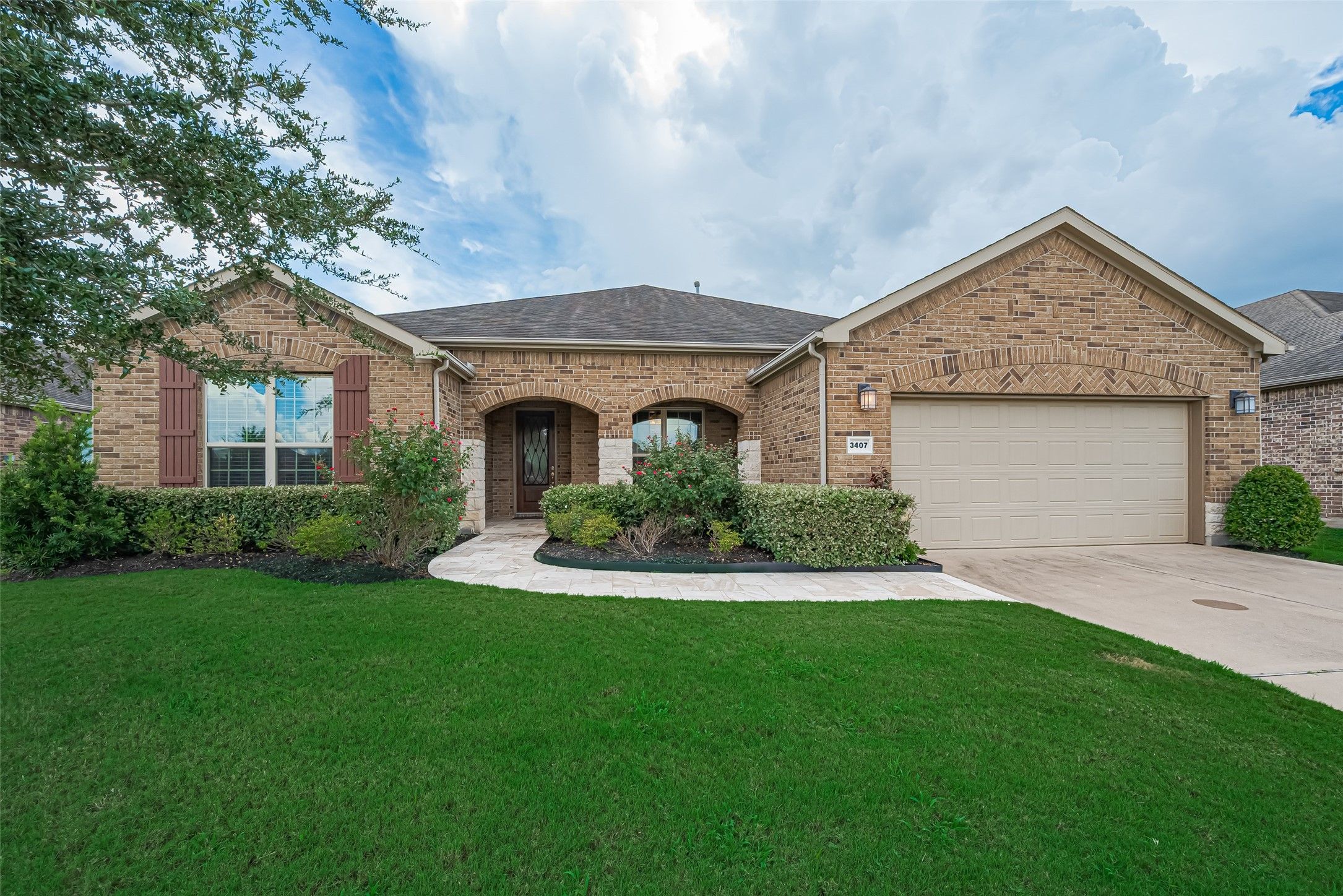 Gorgeous home with attractive brick and stone elevation with huge covered front porch boasting Travertine tile. 3-car tandem garage providing extra storage space or golf cart parking! The highly desirable MAGNOLIA floor plan can be downloaded under attachments. The gourmet island kitchen offers granite counters, breakfast bar area and over-sized cabinetry. Stainless Steel appliances include GE oven and microwave, double under-mount sink, 5 burner gas cook top. The Kitchenaid dishwasher is raised for easy loading and unloading. Bonus the refrigerator stays! The family/living room features tray ceiling with views of the screened in patio with recent ceiling fans. The primary bedroom is very spacious with plenty of room for a sitting area with serene views of the backyard. The backyard was professionally landscaped in 2024 with shrubs, prolific flowering rose bushes, lantana, oleanders and Yaupon holly. The Travertine patio was extended in 2024 with path to the gate and greenbelt.