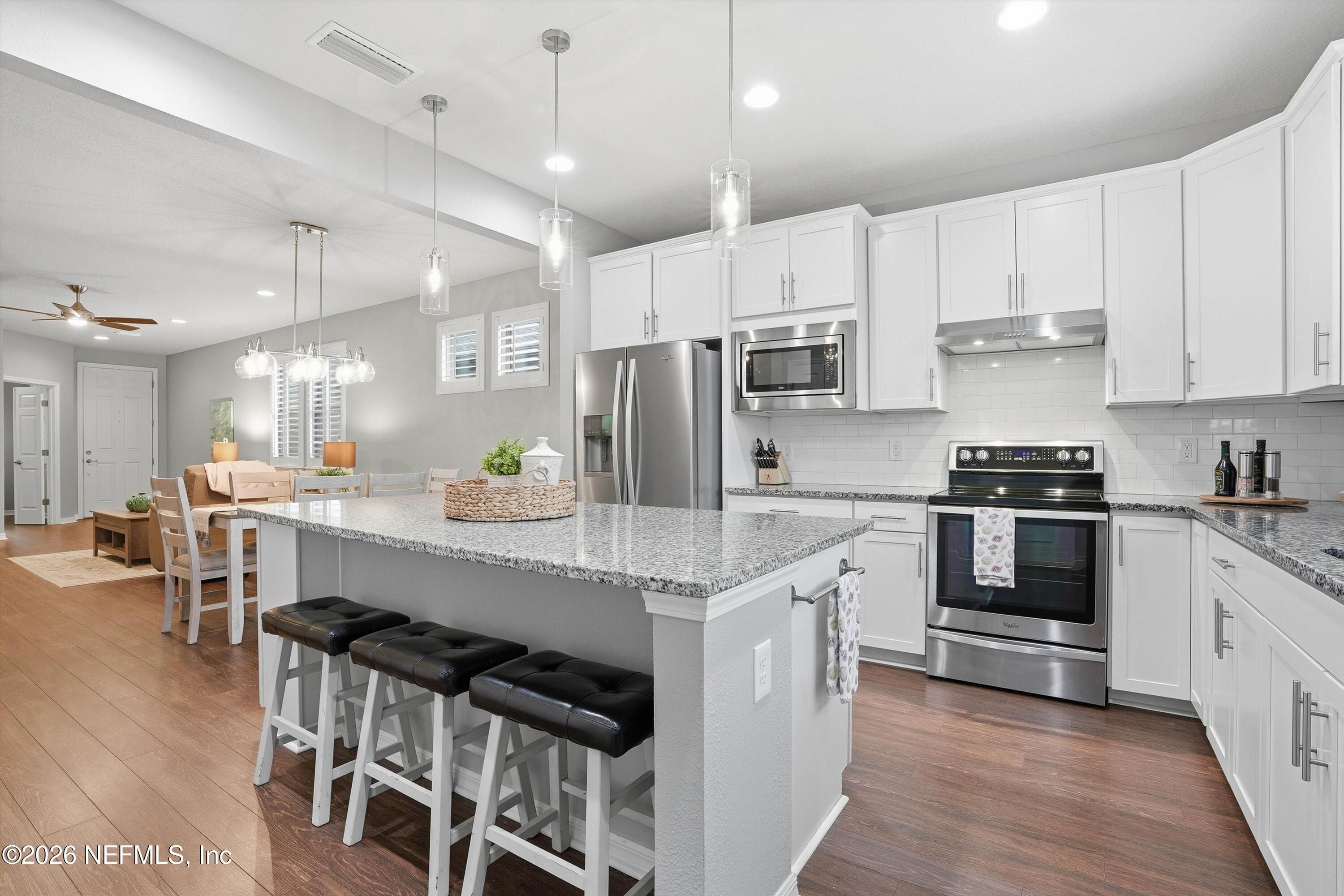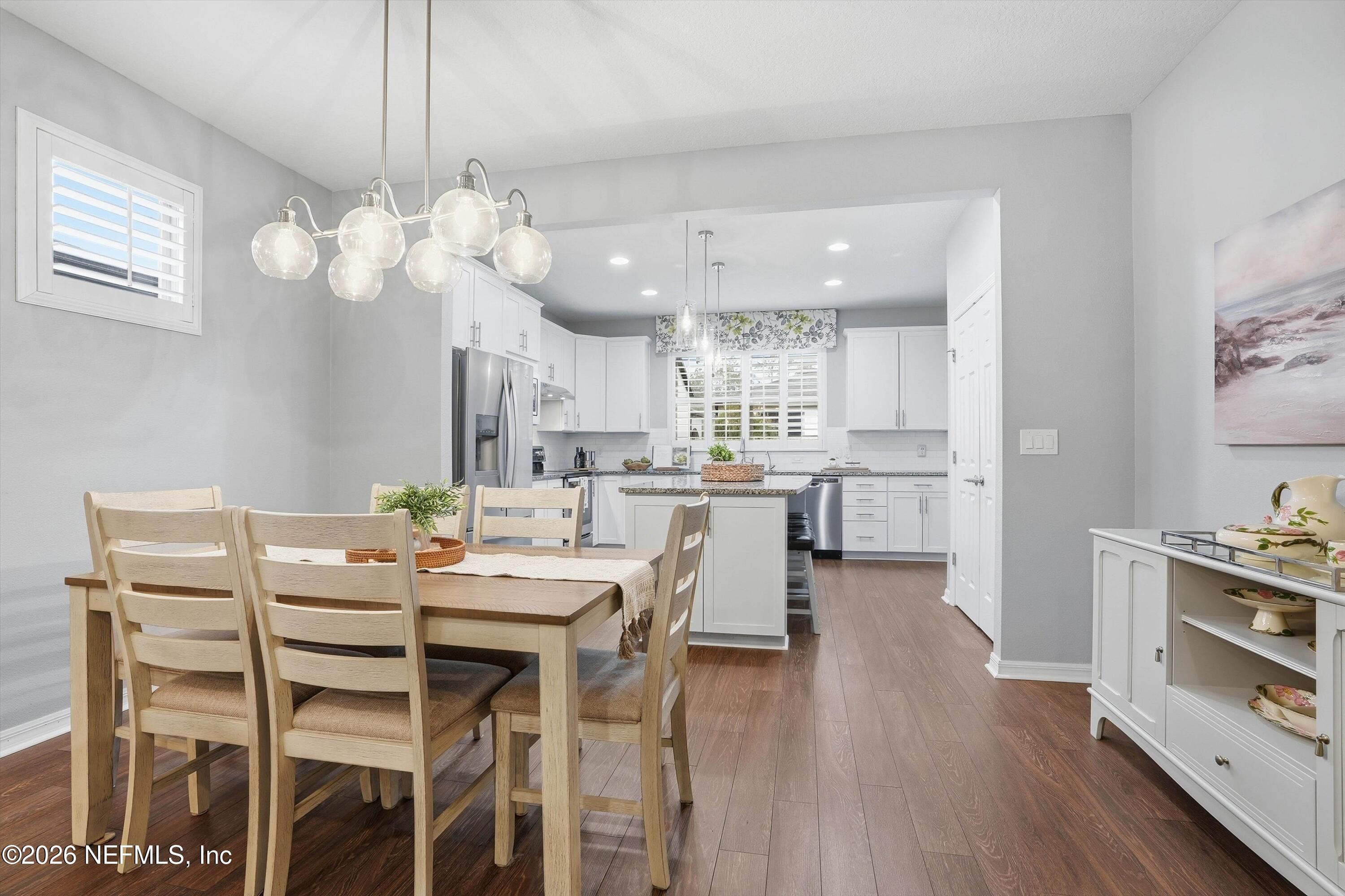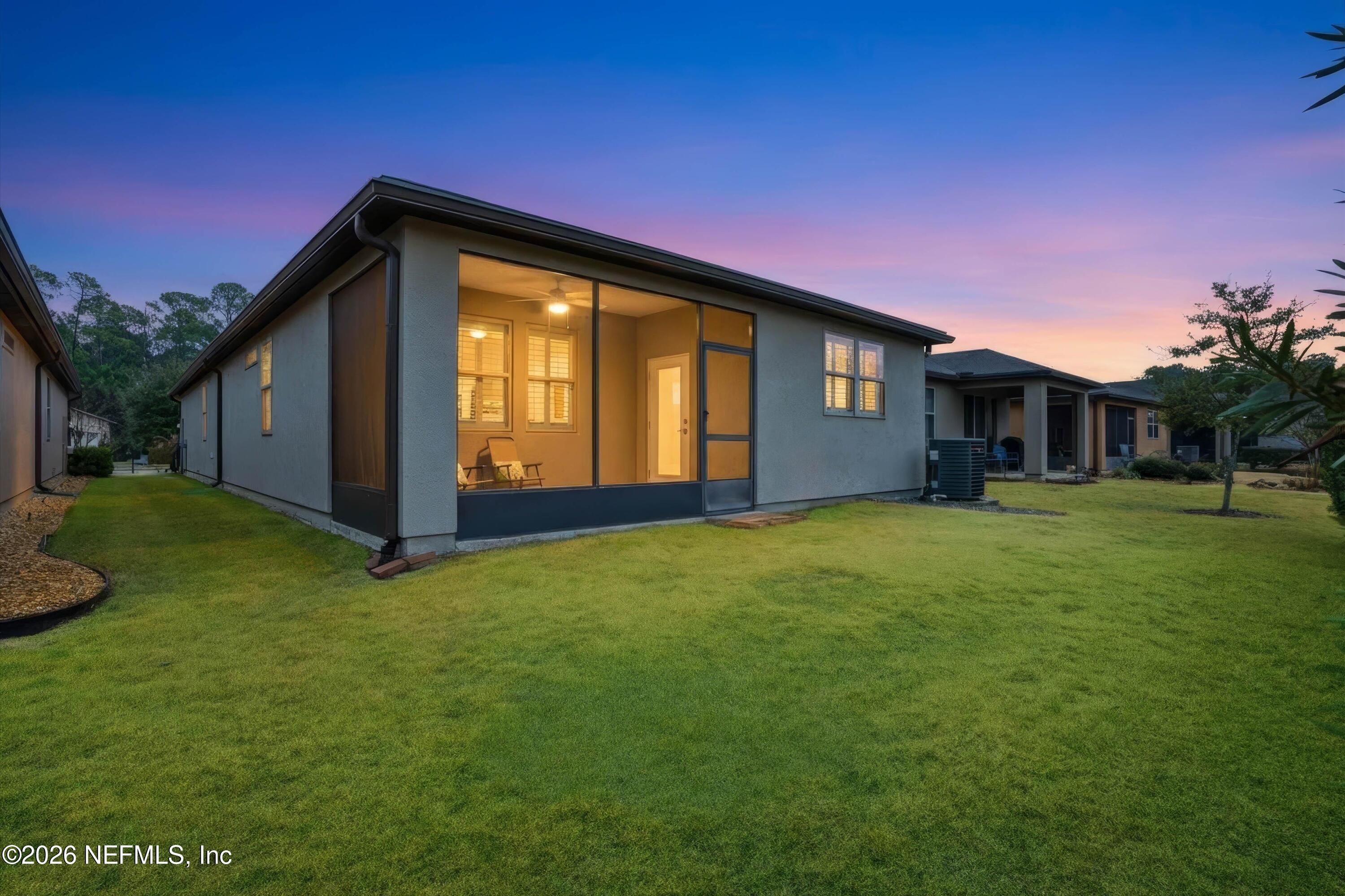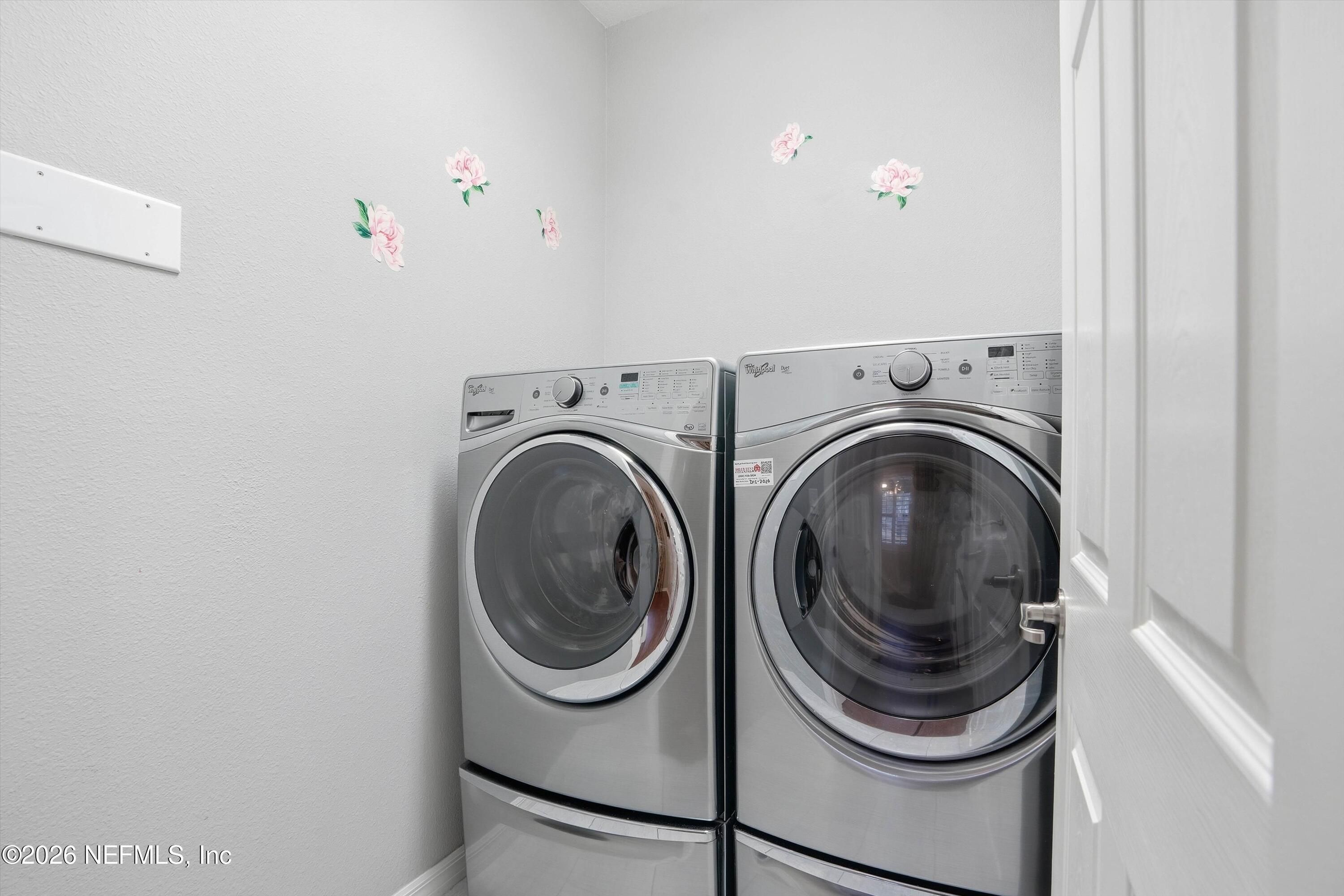 Move-in ready Taft model featuring 3 bedrooms and 2 baths, beautifully maintained and loaded with thoughtful upgrades. The extended 4-ft garage includes ceiling-mounted storage racks and a utility sink, offering exceptional functionality. Inside, enjoy 9-ft ceilings, plantation shutters, and luxury vinyl plank flooring throughout ''no carpet''. The kitchen shines with 42'' white Shaker cabinets with pull-out shelving, granite countertops, subway tile backsplash, single-bowl sink, upgraded stainless-steel appliances, reverse osmosis system, and a water softener. The living area is anchored by an electric fireplace with mantle and heater, creating a warm, inviting space. Additional upgrades include a steam washer and dryer with pedestal bases. Outdoors, the home is enhanced by lush, professionally landscaped grounds and a privacy hedge in the backyard, perfect for relaxing or entertaining. Owners enjoy all Del Webb PV privileges at the Anastasia Club including indoor and outdoor pools & spas, pickle ball, bocce, tennis, fitness center, numerous clubs, a full-time activity director plus access to the Nocatee Water Parks & Amenities Close to Publix & the town center, restaurants & shopping. Just 10 minutes to the beach & golfing