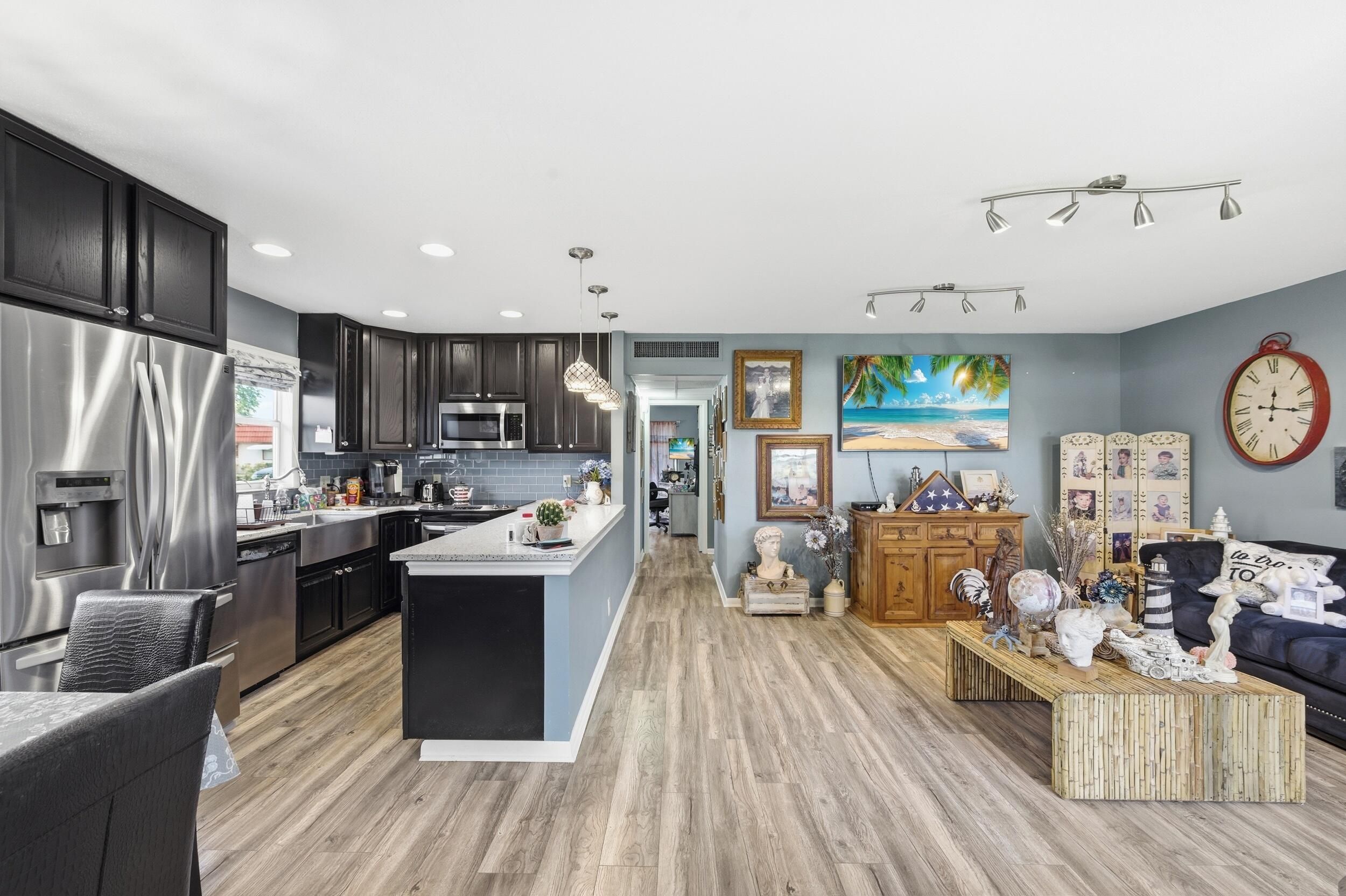 Absolutely stunning, fully updated ground-floor corner villa located in the prestigious 55+ Kings Point Golf & Country Club. This must-see residence offers tranquil, serene water views from the living room and is filled with natural light, creating a bright coastal-inspired atmosphere throughout. Enjoy complete peace of mind with a brand-new roof and no assessments. The beautifully redesigned designer kitchen features stainless steel appliances, elegant quartz countertops, and a striking tiled backsplash, making it perfect for both everyday living and entertaining. Throughout the home you'll find no popcorn ceilings, all updated lighting fixtures, and recessed lighting that enhance the clean, modern feel.The spa-like bathroom has been completely renovated and showcases