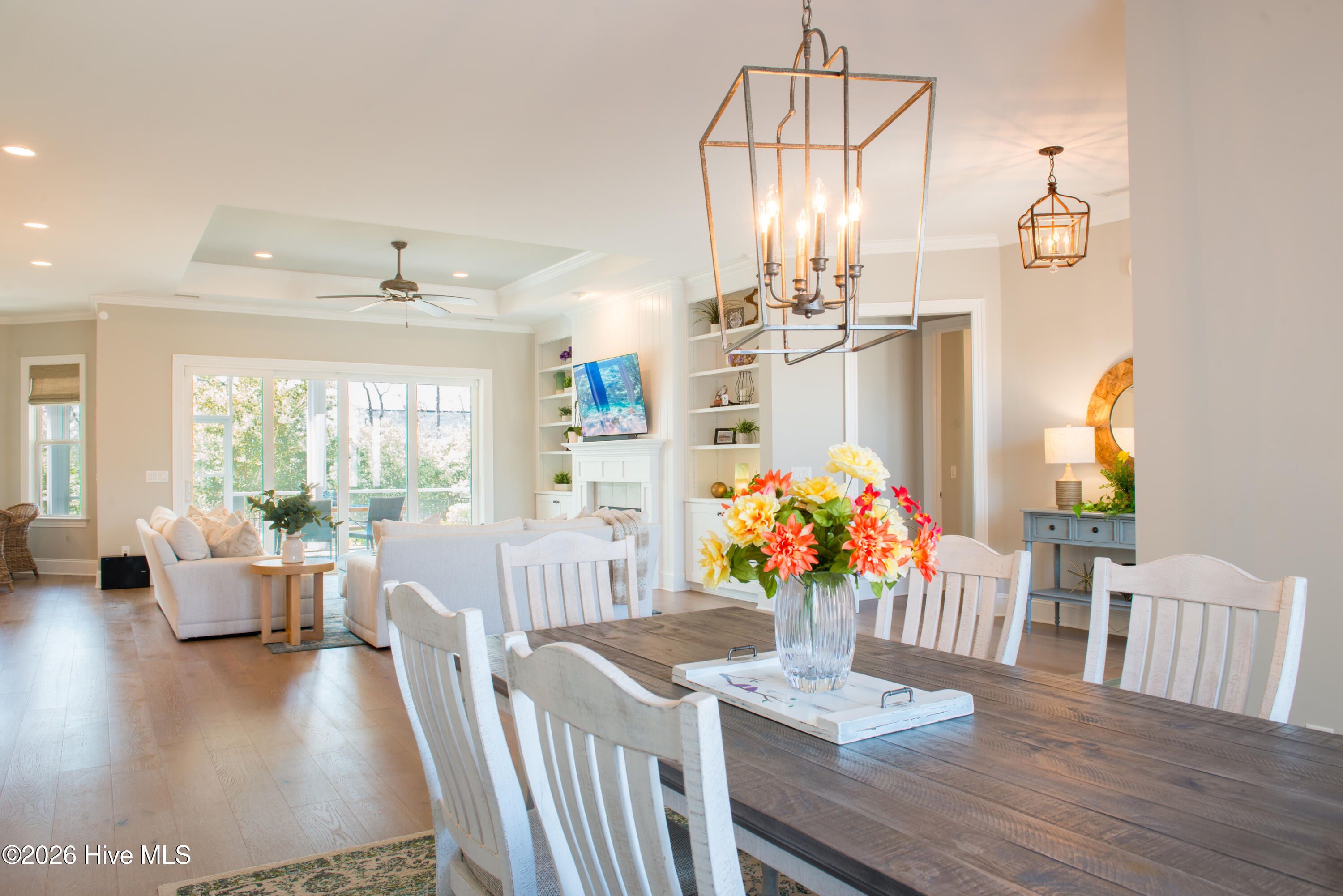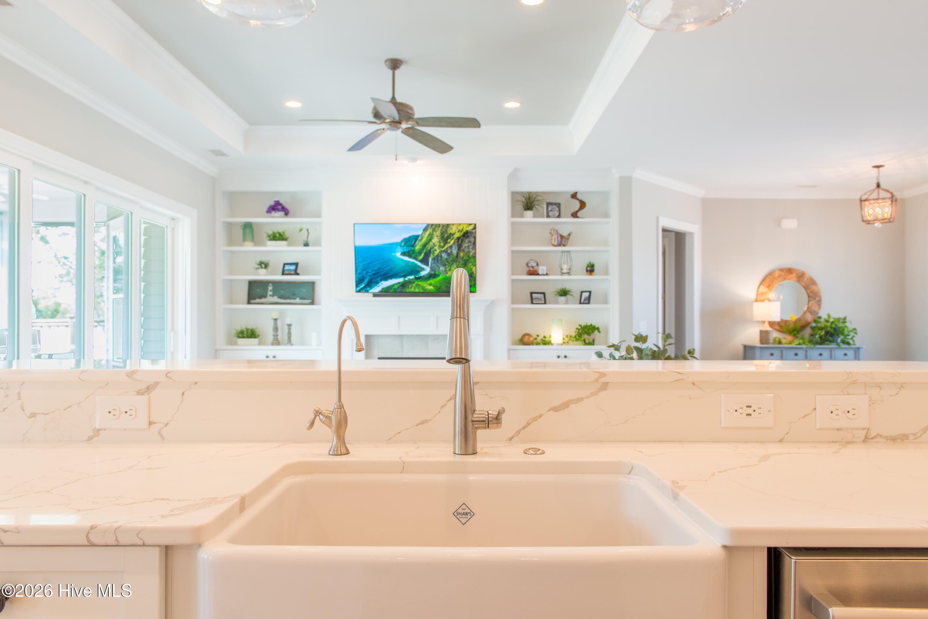 - Master Downstairs, Walk-In Closet(s), Tray Ceiling(s), High Ceilings, Entrance Foyer, Solid Surface Counters, Bookcases, Kitchen Island, Ceiling Fan(s), Pantry, Walk-In Shower, Blinds, Built-in Features, Eat-in Kitchen