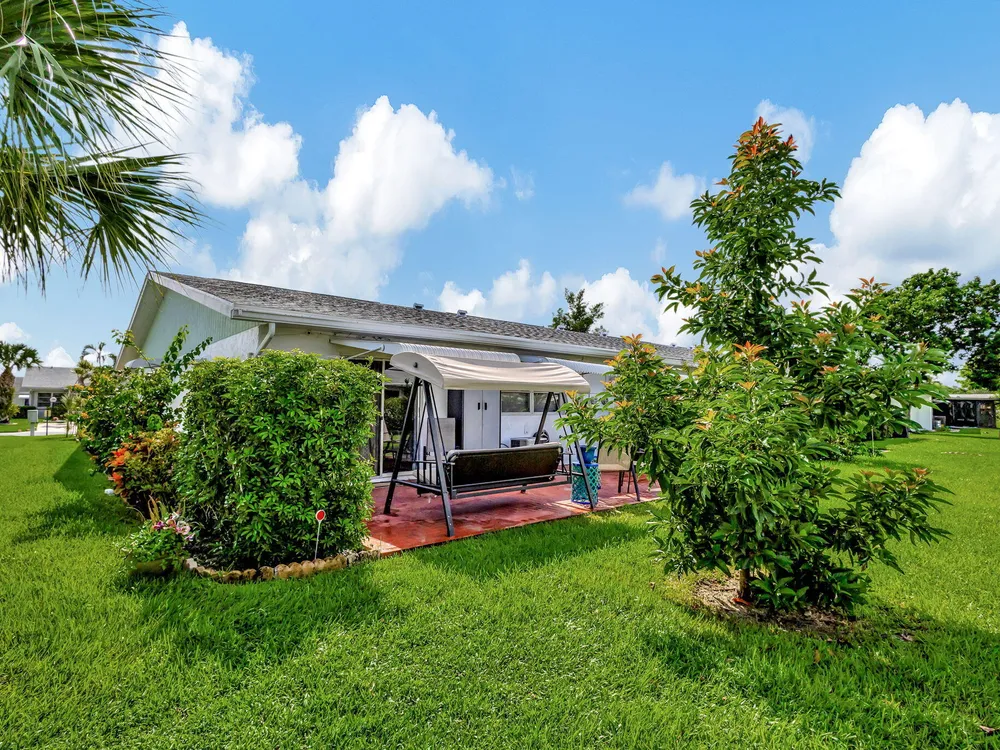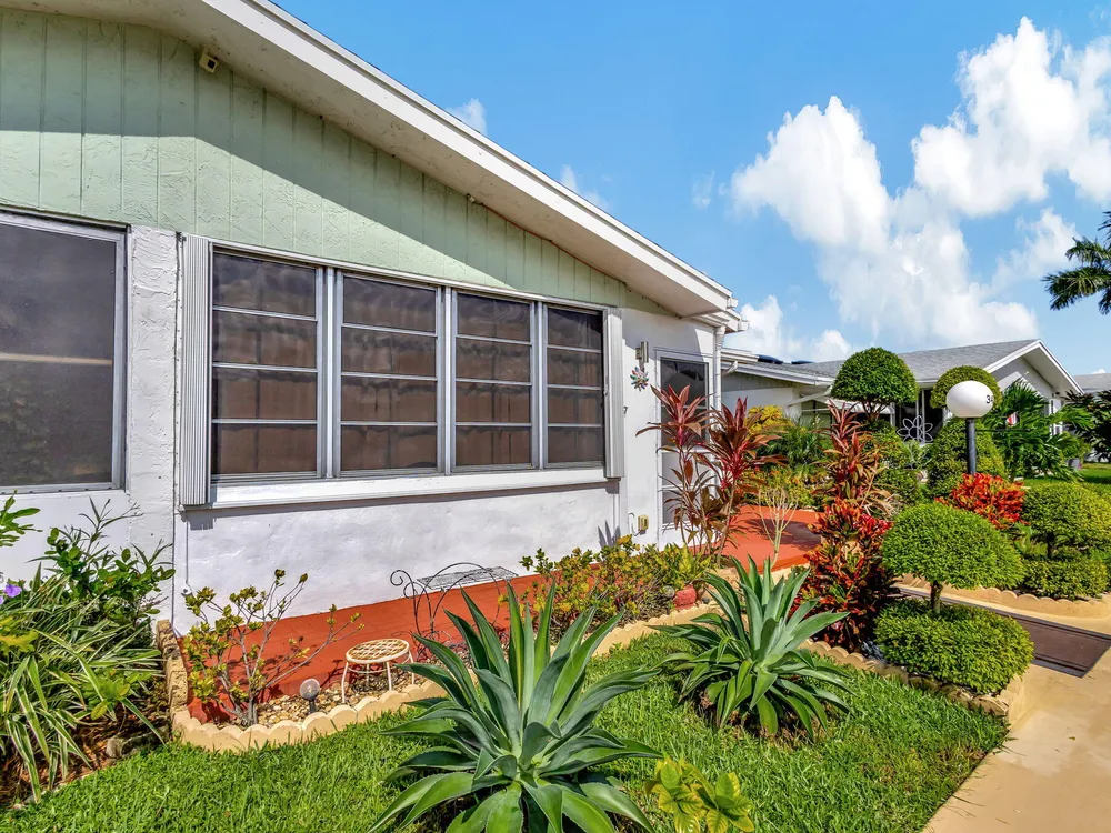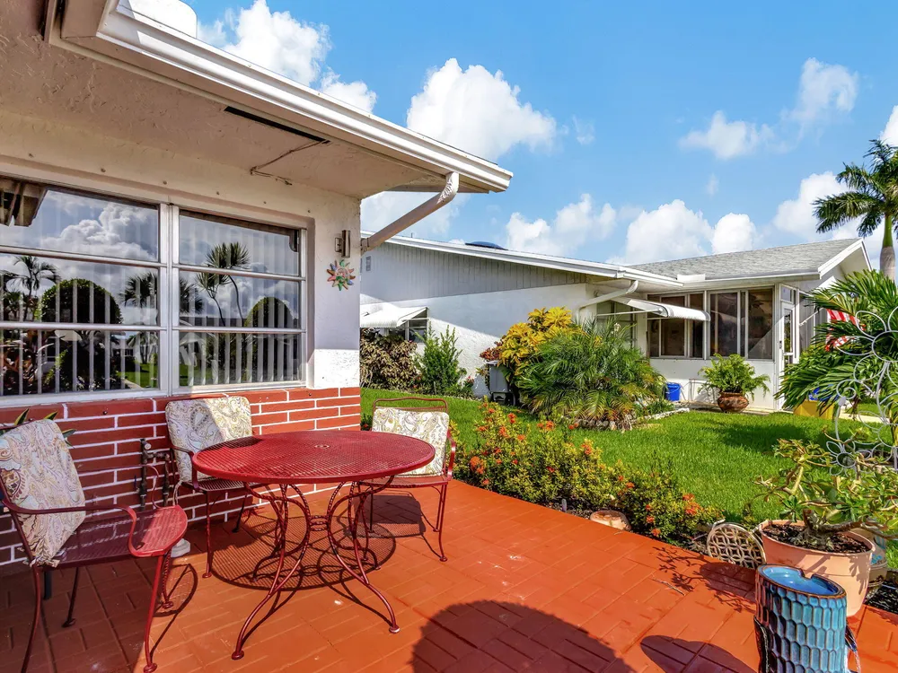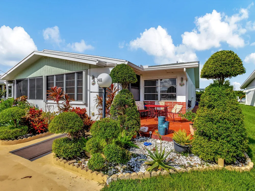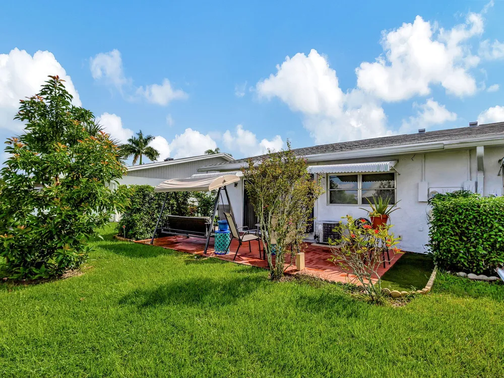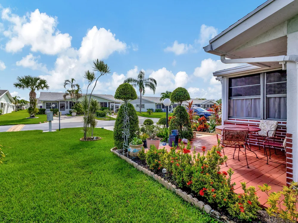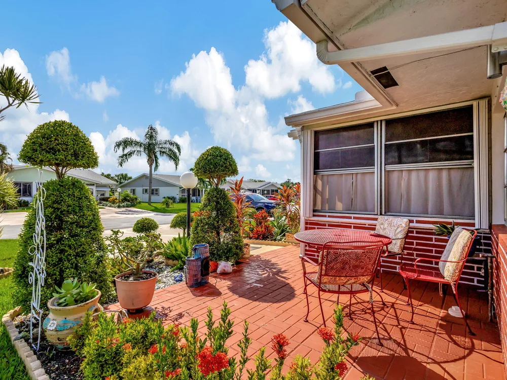 Welcome to your dream villa! This beautifully updated 2-bedroom, 2-bathroom corner-lot home boasts a wrap-around landscape, offering tranquility and privacy with plenty of room in the spacious enclosed front and open back patio to relax or entertain. The roof is new, providing peace of mind for years to come. As you step inside, you'll be greeted by brand-new tile flooring throughout, leading to a completely renovated kitchen featuring new appliances, a marble countertop and backsplash, a farmhouse sink, and a wine cooler. Freshly painted, the villa is move-in ready with updated bathrooms to match its modern charm. In addition to this impeccable home, you'll have access to a