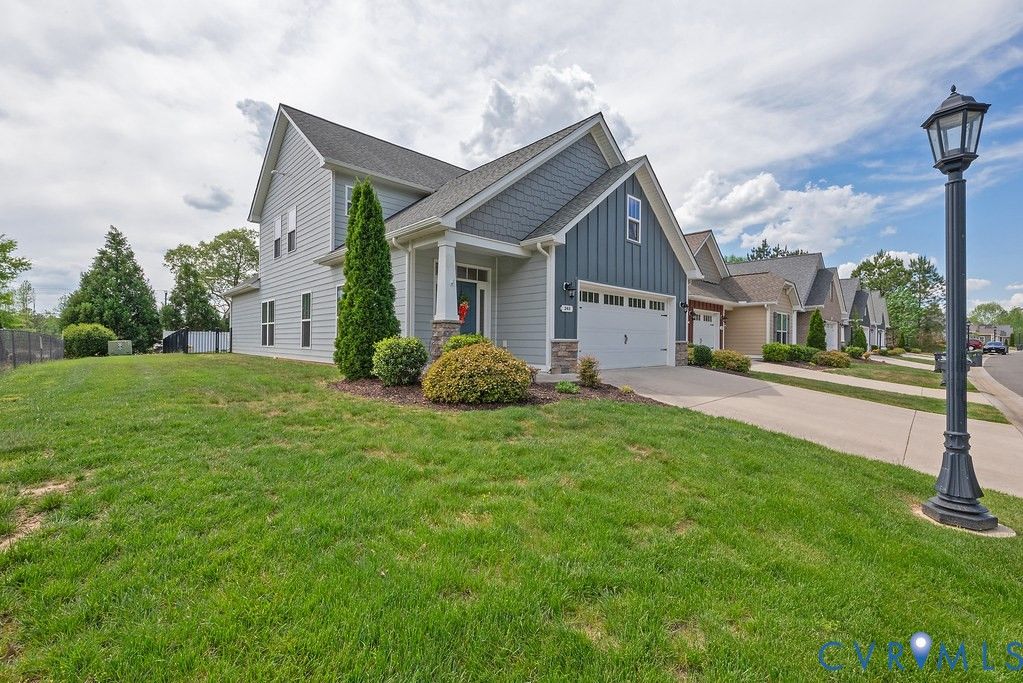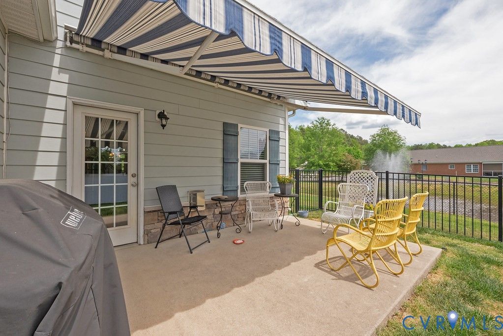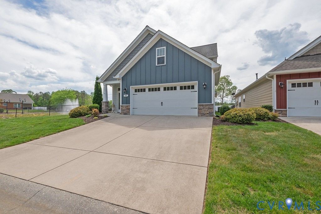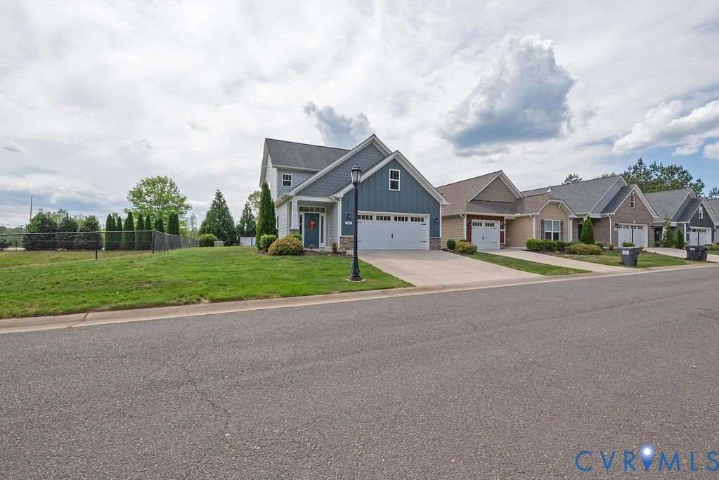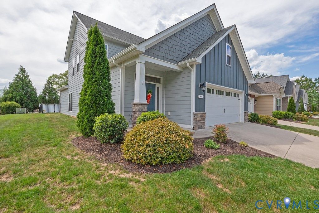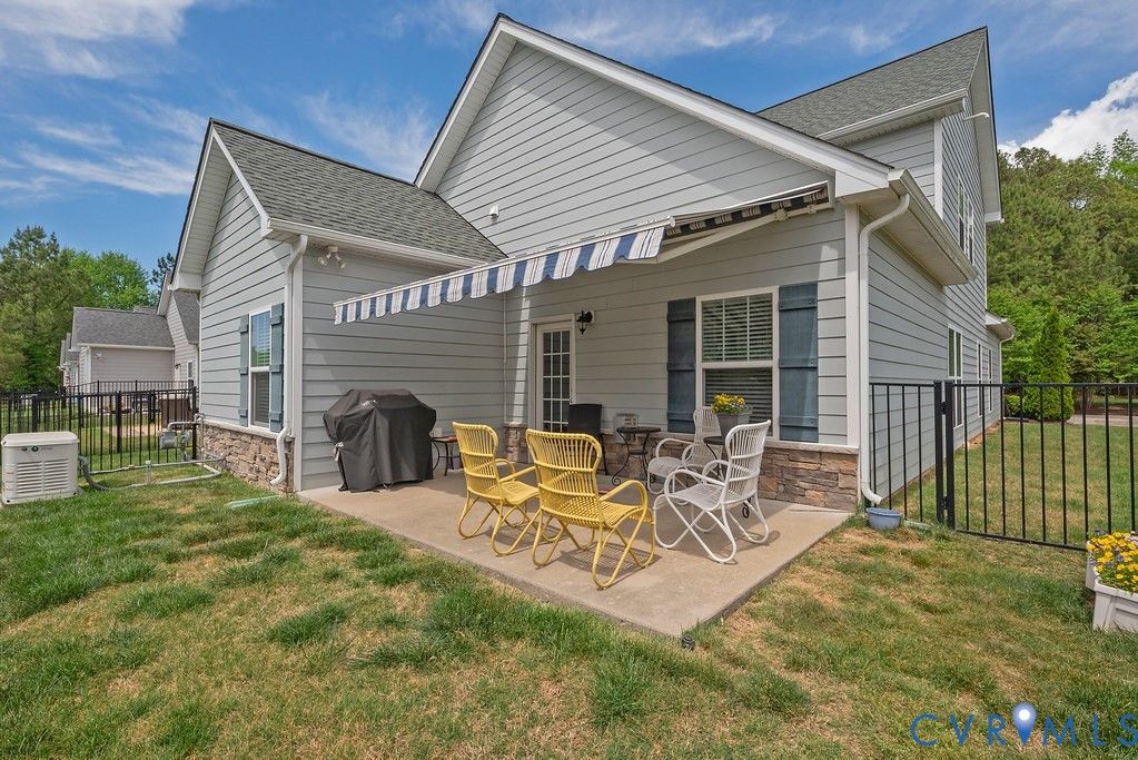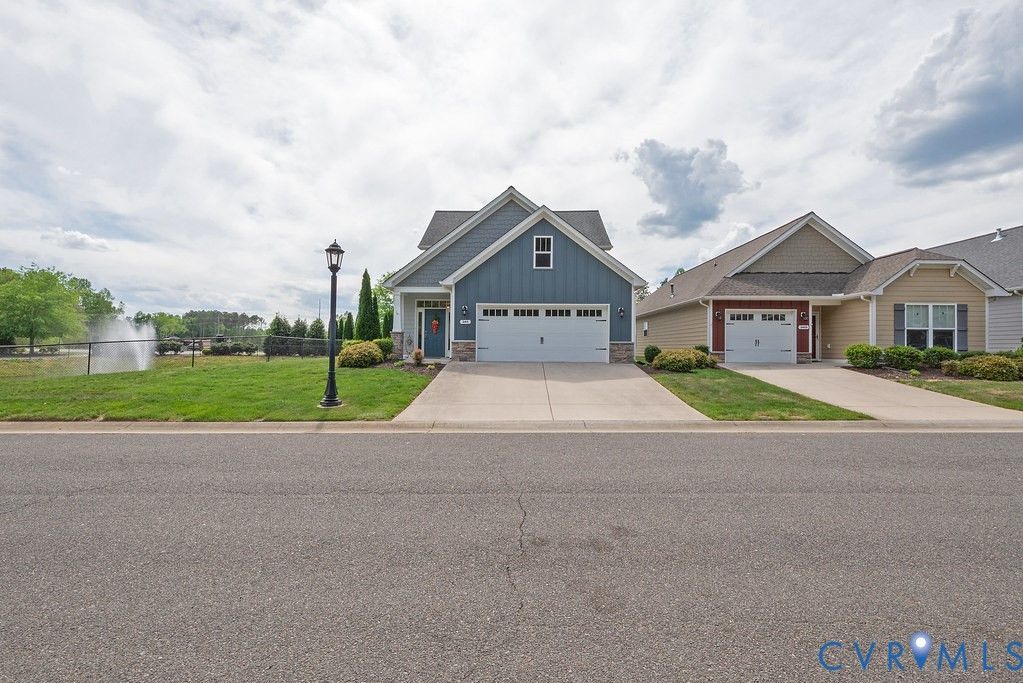 Welcome to this beautifully upgraded former model home nestled in a desirable 55+ active adult community! Perfectly situated beside the community Pond, enjoy peaceful mornings with stunning water fountain views right from your dining room window! This spacious home offers 4 bedrooms and 3 full baths, featuring an open and inviting floor plan with 9-foot ceilings on the first level and gleaming hardwood floors. The well-appointed kitchen has a large island, granite countertops, stone backsplash, gas cooking, and a pantry—seamlessly opening to the dining area and family room with a cozy gas fireplace. The first-floor primary suite offers a beautifully tiled shower with built-in seat, a spacious walk-through closet, and direct access to the laundry room. A second bedroom and full bath are also located on the main level. Upstairs, you’ll find two additional spacious bedrooms, a full bath, and a second family room/Office/Flex Room, complete with a large game/storage closet—perfect for guests or additional living space. Additional highlights include a 2-car attached garage, whole-house generator, walk-out patio with retractable sun awning, and a fenced rear yard ideal for pets. But that Fountain steals the show! Enjoy low-maintenance living with community amenities that include a clubhouse with a fully stocked kitchen, fitness center, outdoor patio seating, gazebo, plus trash and snow removal. Conveniently located within walking distance to shops and restaurants, near the new VCU emergency facility, wineries, and golf courses. Easy access to Interstate 64, just off Route 60, with quick drives to both Richmond and Williamsburg. Don’t miss this rare opportunity to enjoy comfort, convenience, and scenic living all in one!