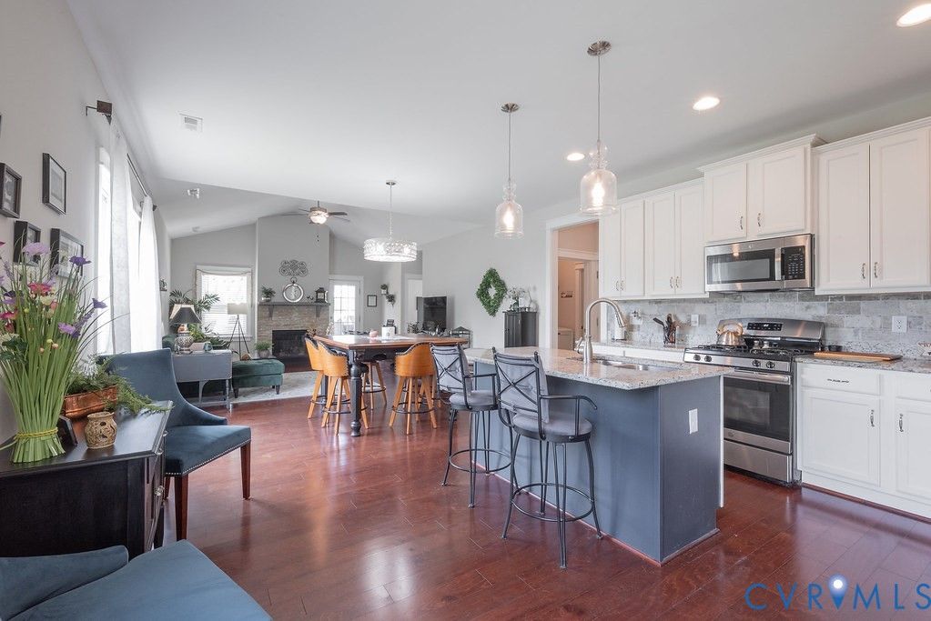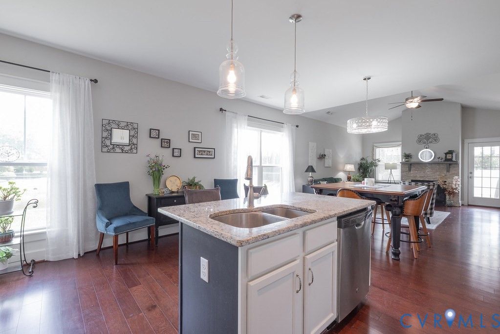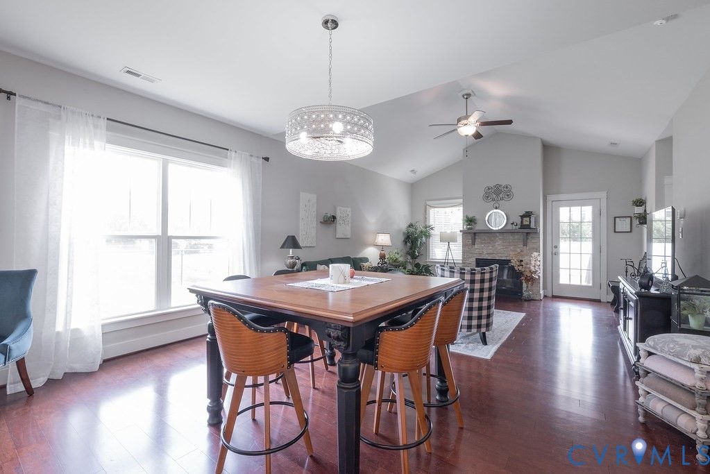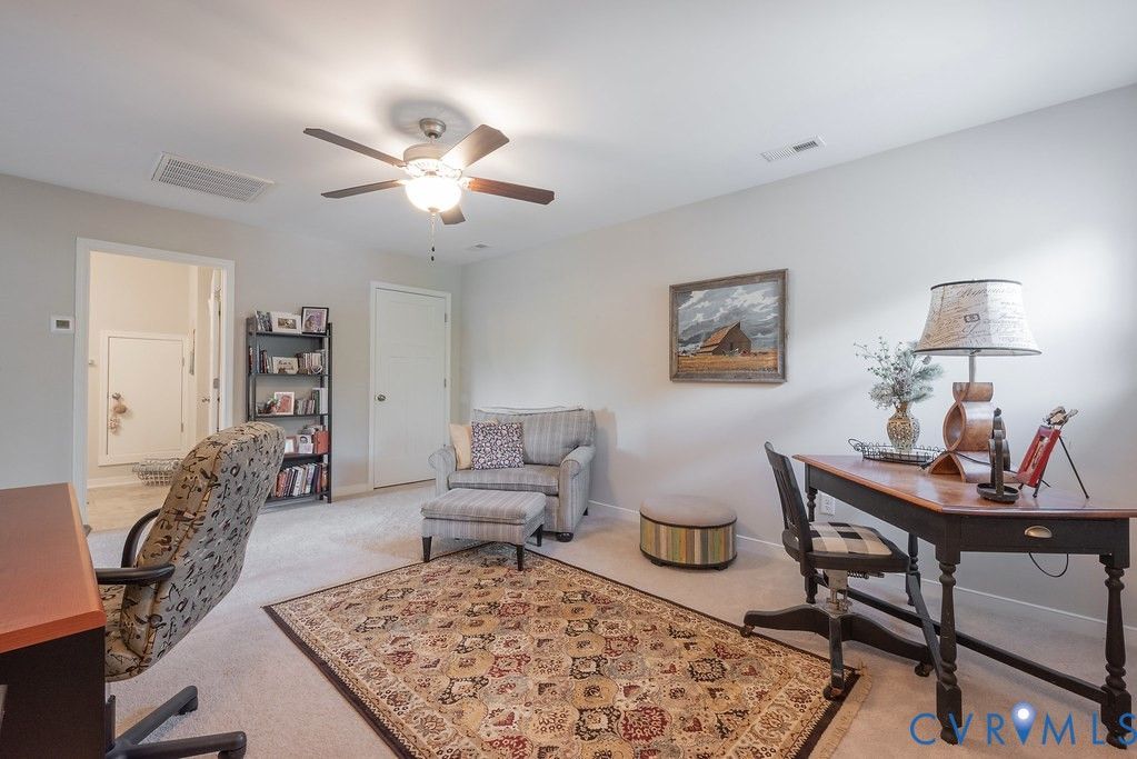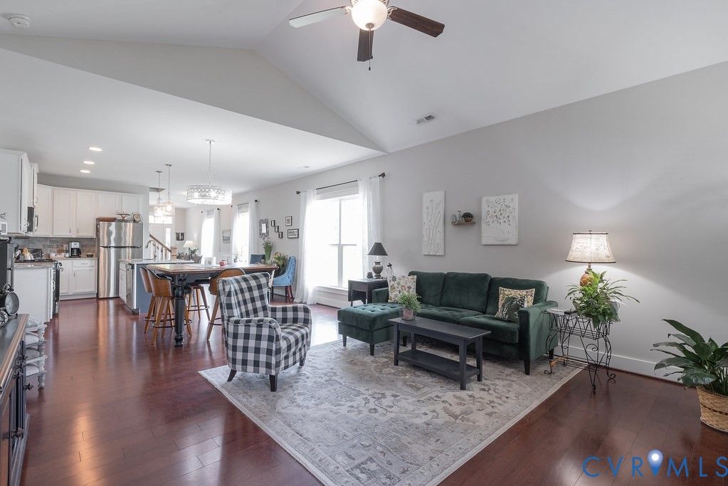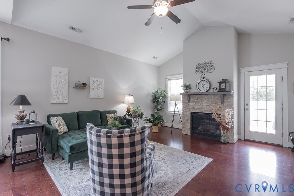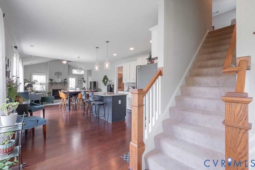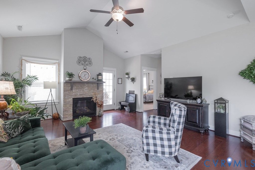 Welcome to this beautifully upgraded former model home nestled in a desirable 55+ active adult community! Perfectly situated beside the community Pond, enjoy peaceful mornings with stunning water fountain views right from your dining room window! This spacious home offers 4 bedrooms and 3 full baths, featuring an open and inviting floor plan with 9-foot ceilings on the first level and gleaming hardwood floors. The well-appointed kitchen has a large island, granite countertops, stone backsplash, gas cooking, and a pantry—seamlessly opening to the dining area and family room with a cozy gas fireplace. The first-floor primary suite offers a beautifully tiled shower with built-in seat, a spacious walk-through closet, and direct access to the laundry room. A second bedroom and full bath are also located on the main level. Upstairs, you’ll find two additional spacious bedrooms, a full bath, and a second family room/Office/Flex Room, complete with a large game/storage closet—perfect for guests or additional living space. Additional highlights include a 2-car attached garage, whole-house generator, walk-out patio with retractable sun awning, and a fenced rear yard ideal for pets. But that Fountain steals the show! Enjoy low-maintenance living with community amenities that include a clubhouse with a fully stocked kitchen, fitness center, outdoor patio seating, gazebo, plus trash and snow removal. Conveniently located within walking distance to shops and restaurants, near the new VCU emergency facility, wineries, and golf courses. Easy access to Interstate 64, just off Route 60, with quick drives to both Richmond and Williamsburg. Don’t miss this rare opportunity to enjoy comfort, convenience, and scenic living all in one!