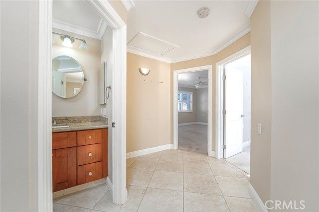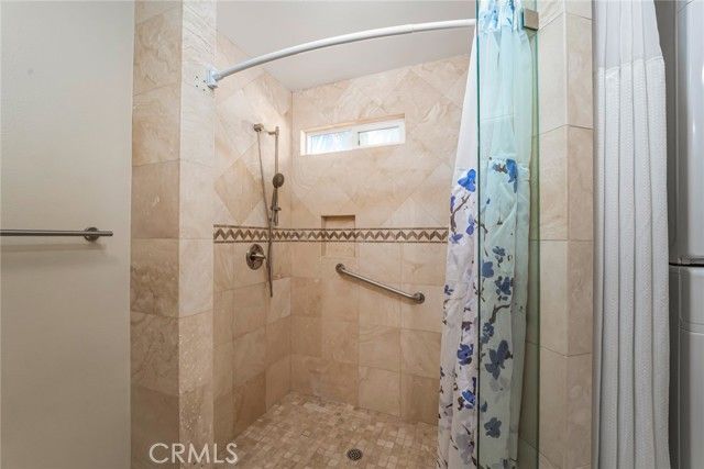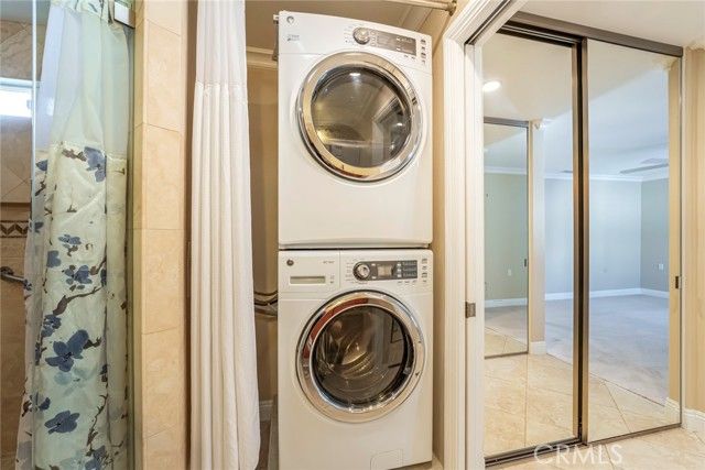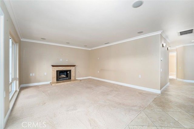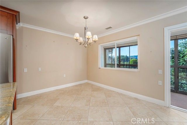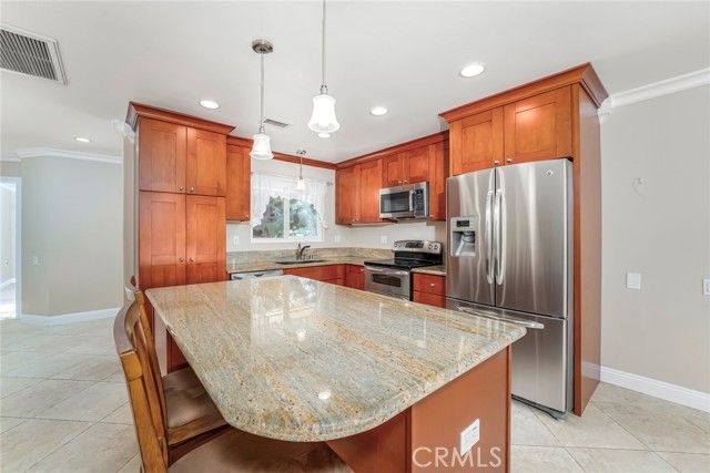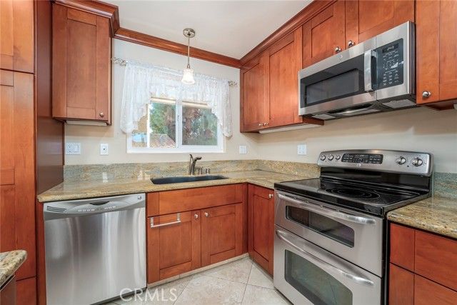 Welcome to 3417 P Punta Alta, Laguna Woods, California, a beautifully upgraded Catalina model featuring two bedrooms, two bathrooms, approximately 1,188 square feet, and sweeping views of the surrounding mountains and Laguna Woods Village. A custom leaded-glass front door opens to a light-filled home, where travertine-style tile flows through the kitchen, hallway, and guest bath. The chef's kitchen is a standout, featuring a large custom island with abundant storage and electrical outlets, perfect for everyday use or entertaining. Cherry wood shaker cabinetry, granite countertops, and a full suite of stainless steel GE appliances, including a convection oven, microwave, dishwasher, and refrigerator with exterior ice and water, complete the space. Pendant and LED lighting provide excellent task and ambient illumination. The adjacent dining area enjoys mountain views through a large window, creating a warm and inviting setting. The spacious living room features crown and base molding, a travertine-clad fireplace with a wood mantel, and is pre-wired for surround sound with the system included. Dual-pane sliding glass doors and a large picture window open to an enclosed balcony with custom windows, providing flexible indoor-outdoor living and sun shades for comfort. The guest bedroom
