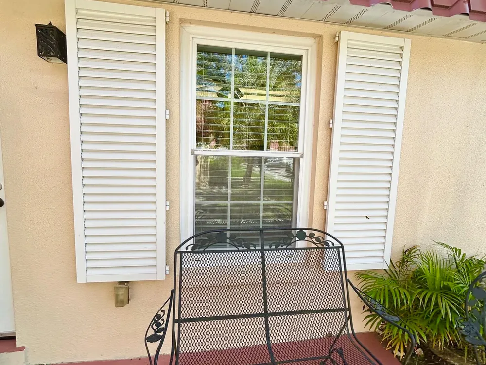 LOCATION LOCATION ... RIGHT ACROSS FROM THE CLUBHOUSE AND POOL. Come see one of the LARGEST 2 bedroom 2 bath Villas available in this PET FRIENDLY community. There are only 4 properties in all of Covered Bridge with this 27' long porch. This stunning unit offers many extras that you will not find in other properties. The kitchen wall has been removed creating a bright and spacious feel. All interior doors have been replaced w/ modern single panel doors. The master bdrm features a walk in closet & a custom built wall closet for more storage. The property is storm protected with HURRICANE/IMPACT WINDOWS & accordion shutters. There's a triple sliding glass door that leads to the large porch area. Custom built wall on porch covers hidden storage closet with a pull out cabinet. Patio for BBQ's
