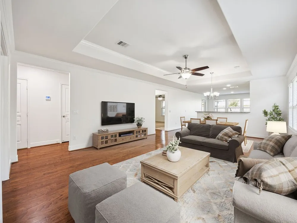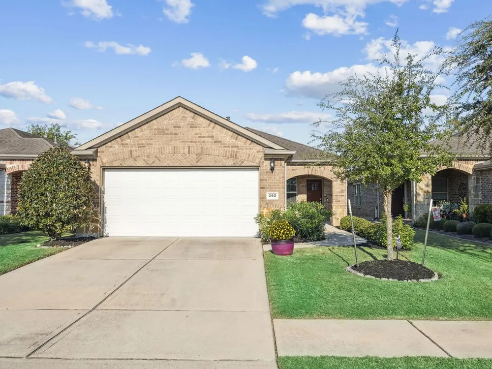 Welcome home to 342 Ranch House Lane, where comfort and community come together in the 55+ neighborhood of Del Webb Sweetgrass. This brick 2-bedroom, 2-bath home with a study has been freshly painted and designed for easy, low-maintenance living. Inside, sunlight fills the open layout connecting the living, dining, and kitchen spaces. The kitchen features warm cabinetry, a gas range, and generous counter space. A dedicated study with French doors makes an ideal home office or hobby room. A spacious screened-in porch and large backyard extend the living space outdoors, perfect for relaxing or entertaining. Residents enjoy resort-style amenities including a lake, walking trails, and a clubhouse with pool and fitness center.