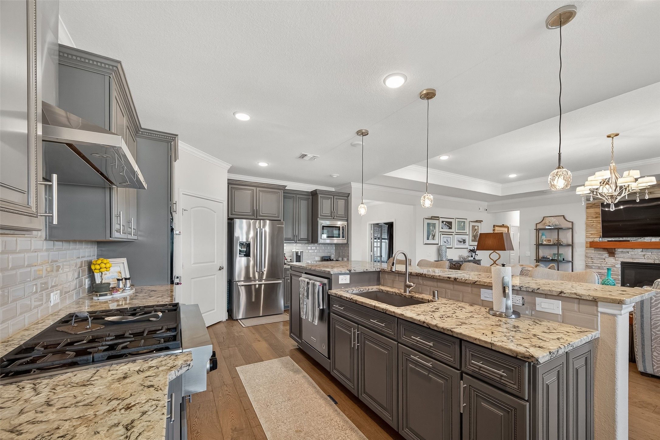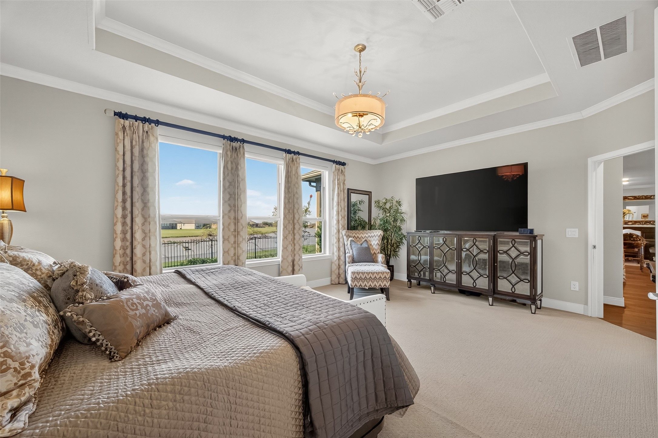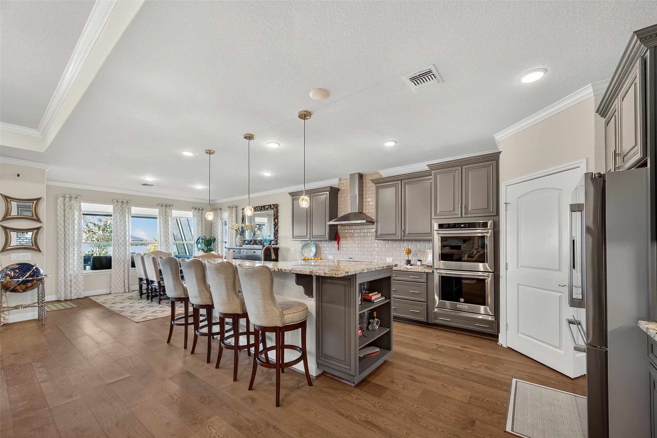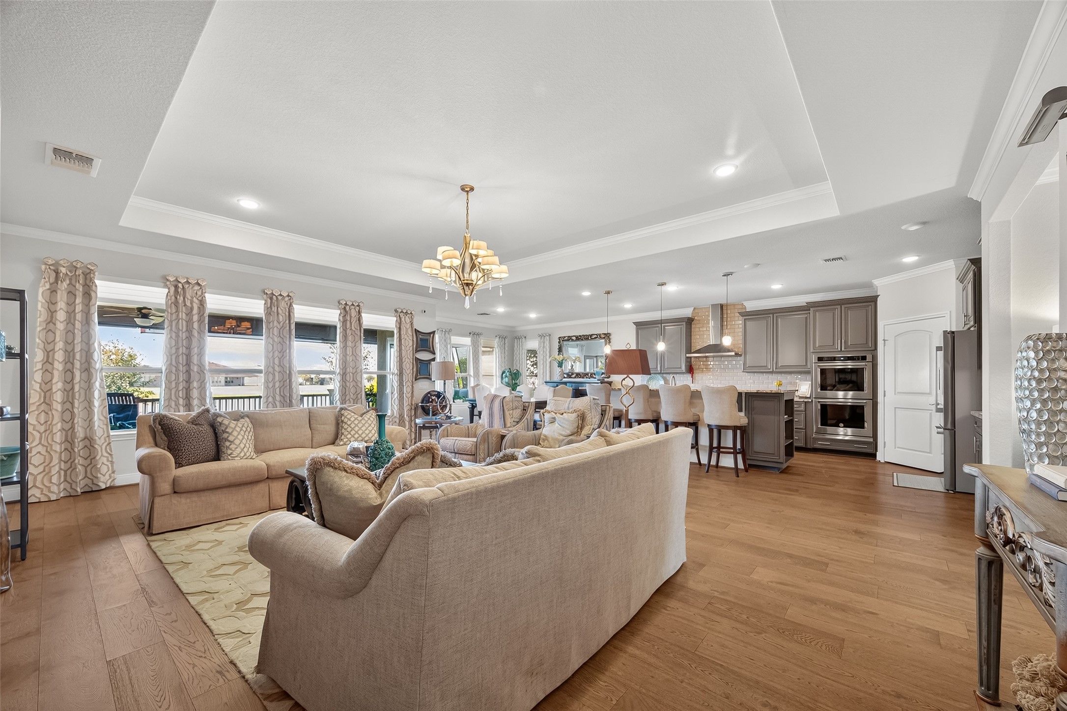 Absolutely stunning, professionally designed home with a serene lake view backdrop. Elegant interiors showcase wood floors, crown molding, and a bright open layout ideal for entertaining. The chef’s kitchen features custom cabinetry, granite counters, stainless appliances, double ovens, and an oversized island that connects beautifully to the living and dining spaces. The private primary suite offers tranquil water views, dual vanities, an expansive walk-in shower, and generous closet. Enjoy year-round outdoor living on the extended covered patio overlooking the lake. Impeccably maintained and beautifully finished—this home blends timeless design, effortless comfort, and a truly enviable setting. In addition, there is a 3 car garage that is stacked with one of the spaces.