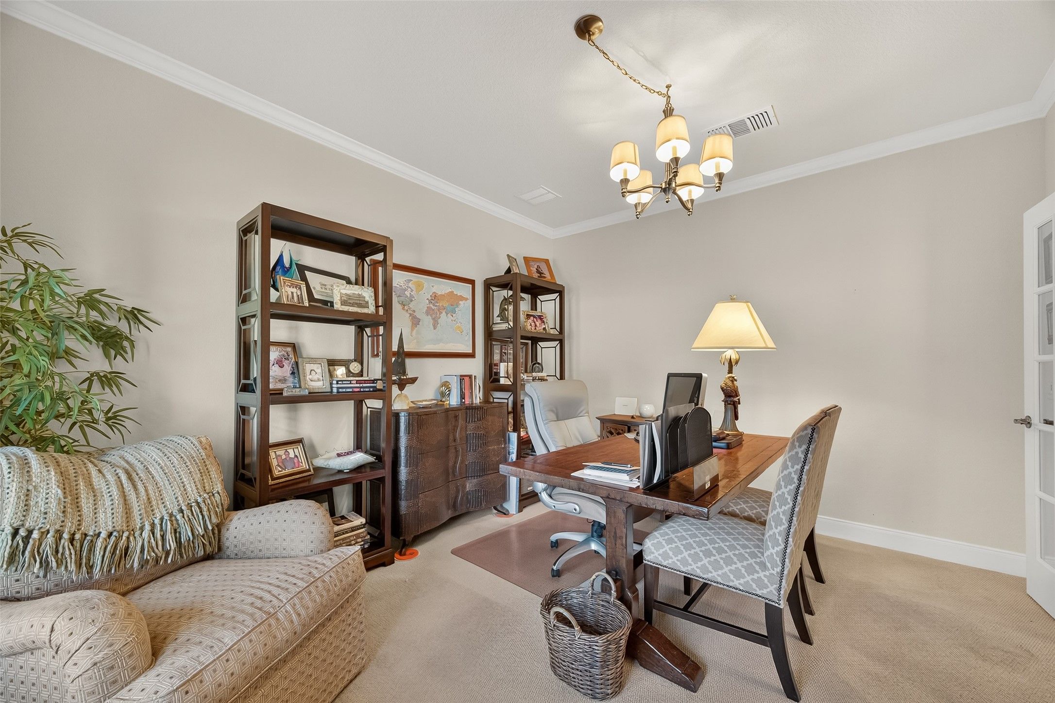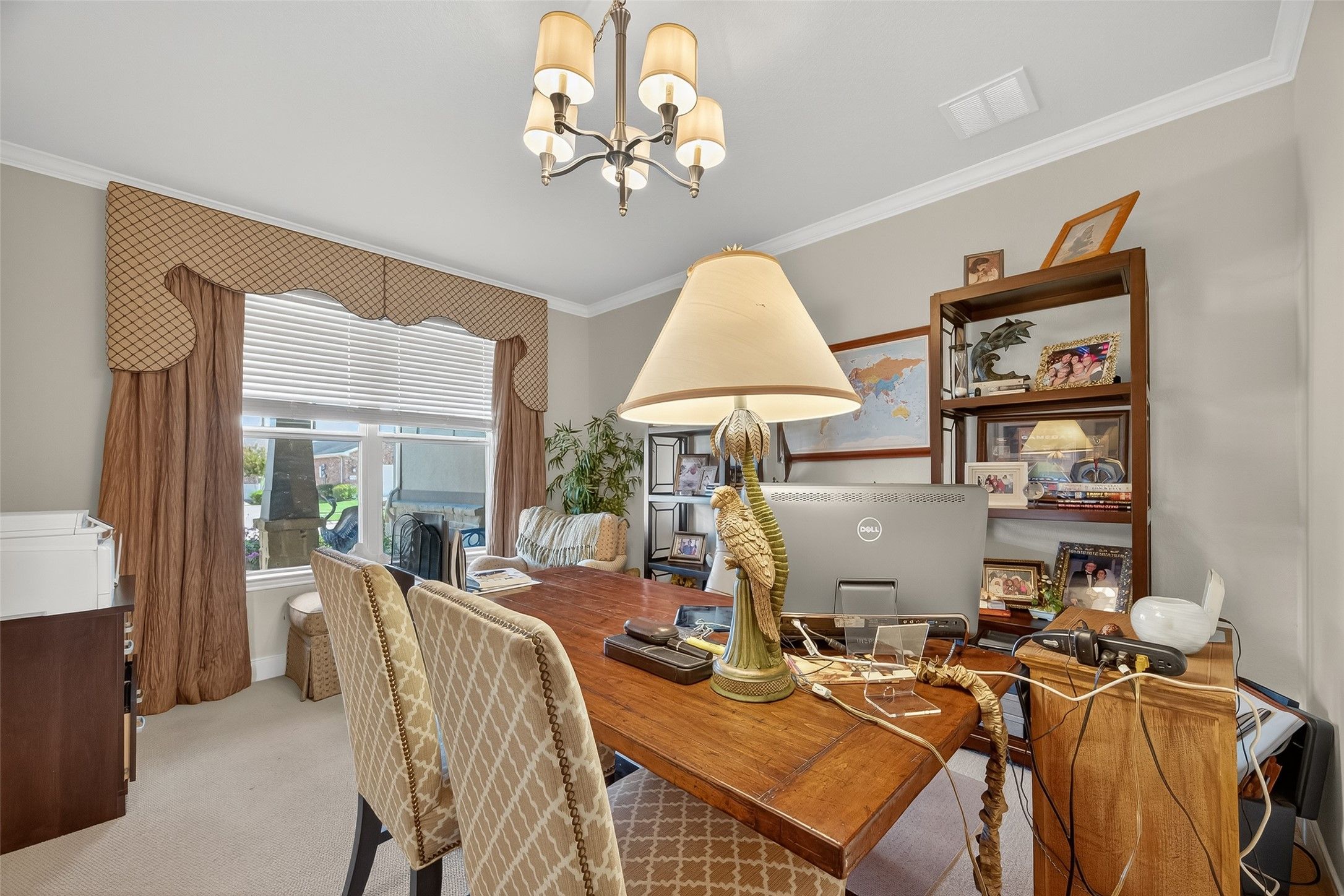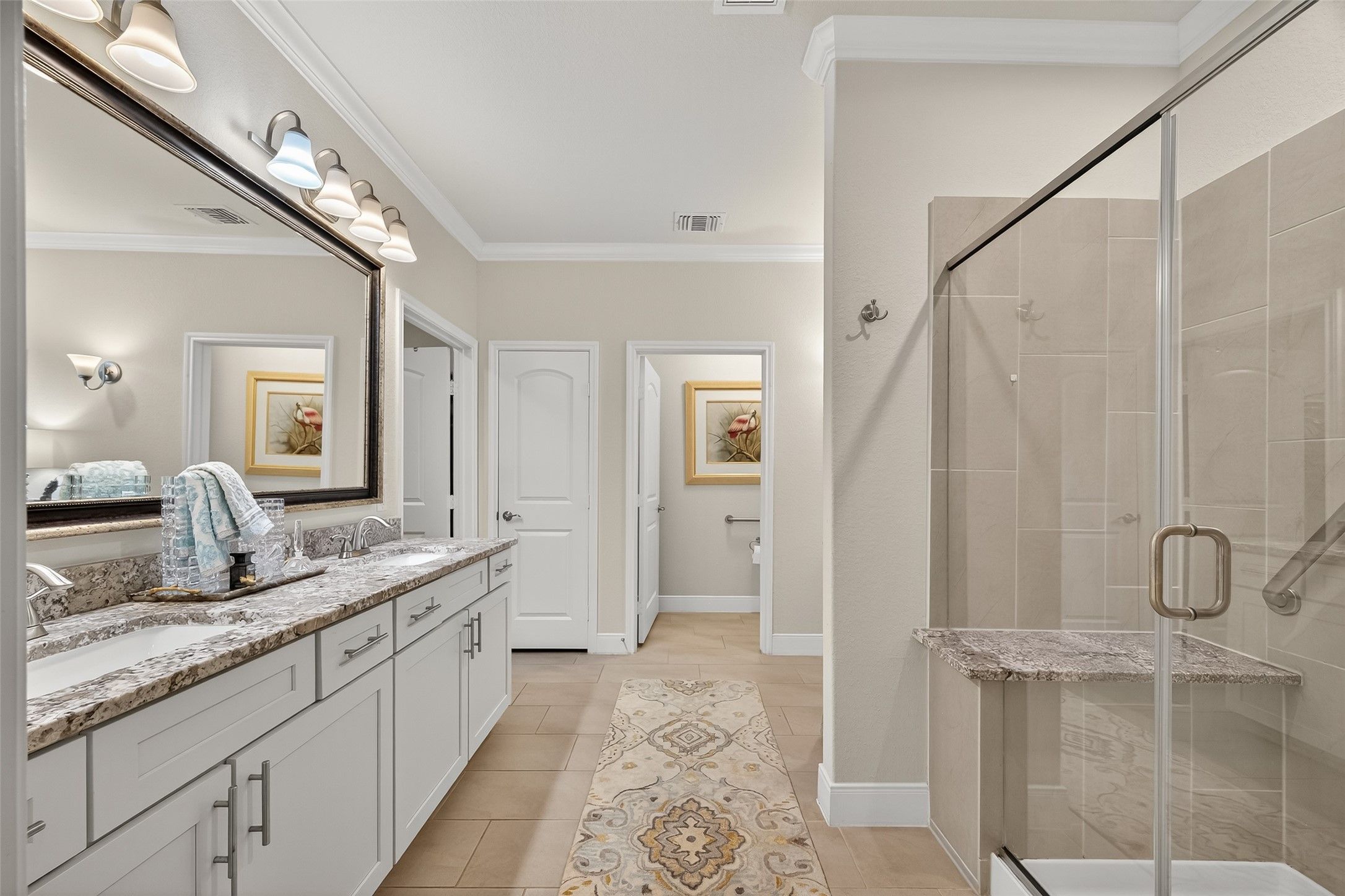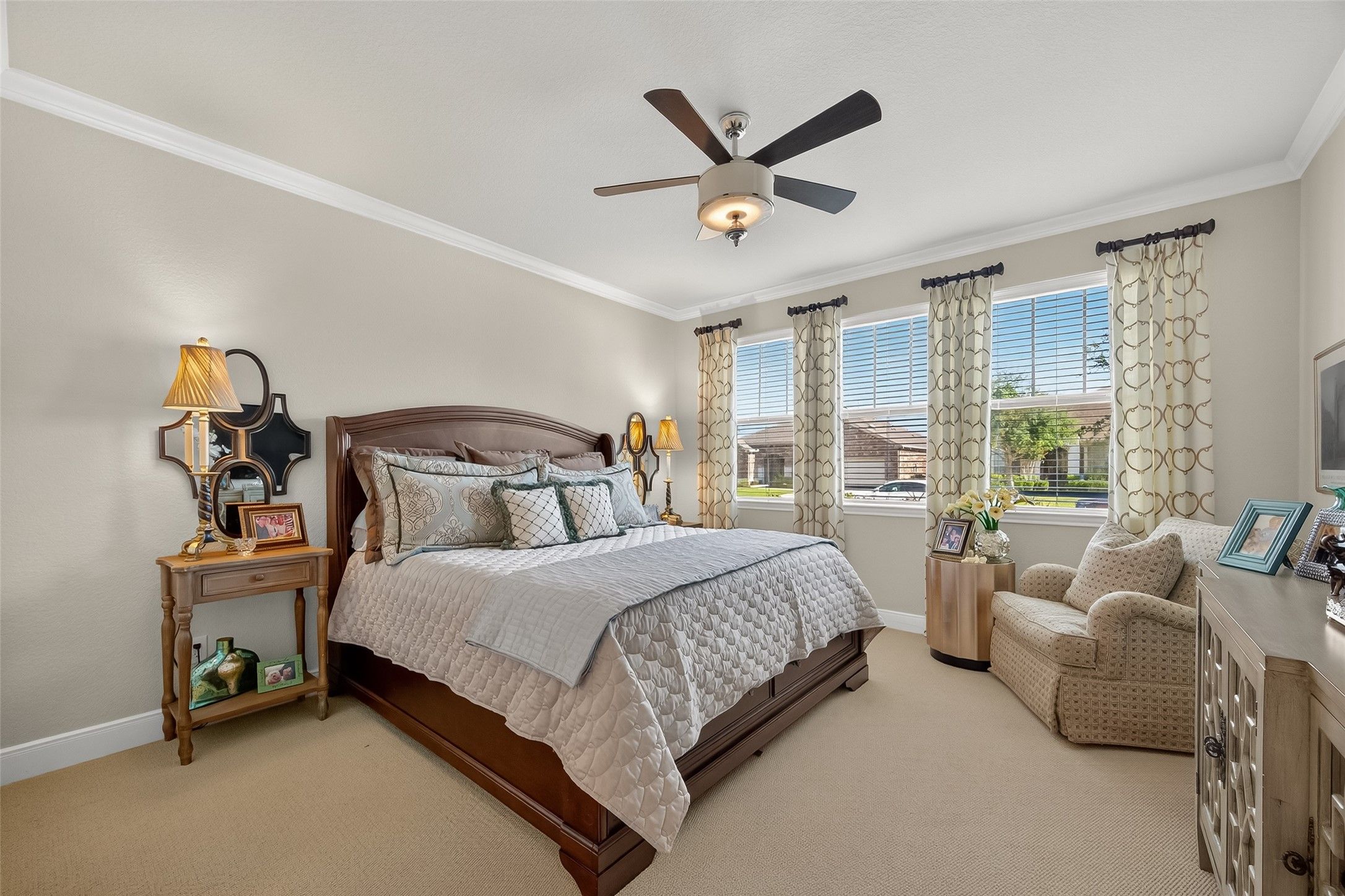 Absolutely stunning, professionally designed home with a serene lake view backdrop. Elegant interiors showcase wood floors, crown molding, and a bright open layout ideal for entertaining. The chef’s kitchen features custom cabinetry, granite counters, stainless appliances, double ovens, and an oversized island that connects beautifully to the living and dining spaces. The private primary suite offers tranquil water views, dual vanities, an expansive walk-in shower, and generous closet. Enjoy year-round outdoor living on the extended covered patio overlooking the lake. Impeccably maintained and beautifully finished—this home blends timeless design, effortless comfort, and a truly enviable setting. In addition, there is a 3 car garage that is stacked with one of the spaces.