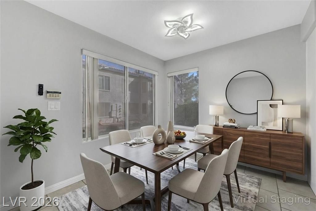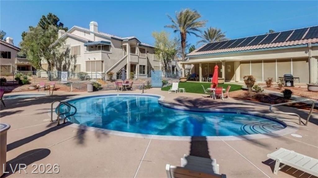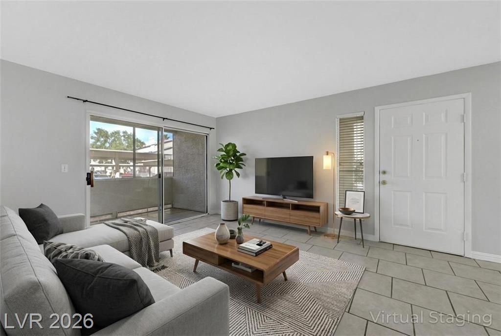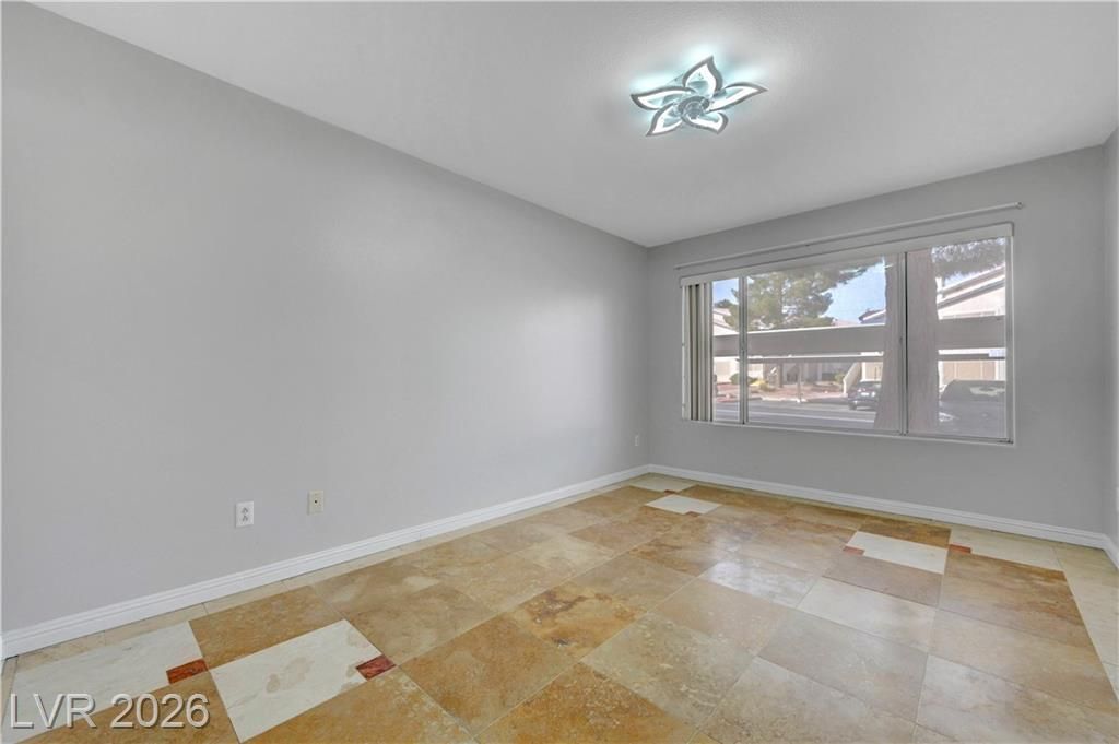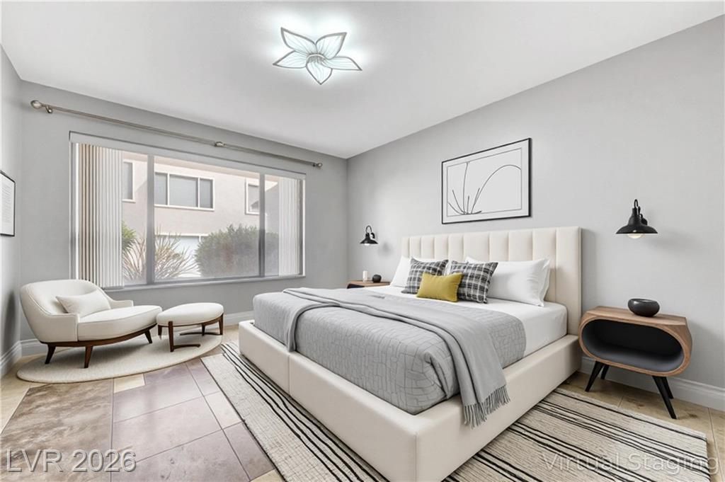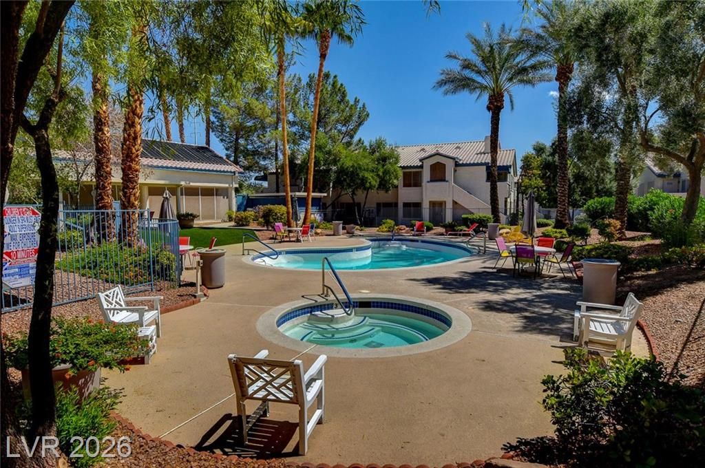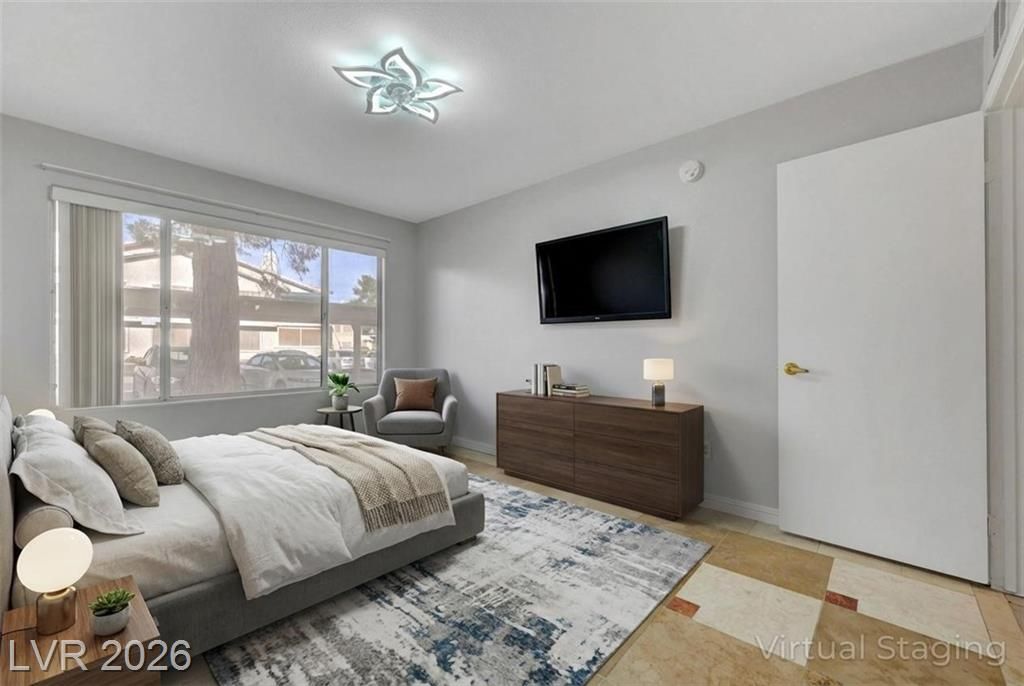 Open house Sun 1-4pm. Rare find. 2026 Newly renovated. Sparkling clean. Quiet desirable gated 55+ community. Beautiful Desert landscaping, trees, shrubs. Close to Strip, downtown, shopping, highways & Green Valley. Largest downstairs unit. 3 spacious bedrooms. 2 full bathrooms. Travertine, tile flooring. No carpet. Modern decor. Marble countertops. White cabinets. High end Stainless steel appliances. Convection microwave. Walk-in closet. Bath dual sinks. Ample storage. Screen patio & door. Water heater 2021. Washer 2025. New 2026. Paint. Reverse osmosis water filter system. Bathroom glass door & lights. Vent motor. Ceiling fan lights & remotes. Rainfall shower heads & faucets. Deep air duct cleaning. AC tuning & Wash. Clubhouse, Gym, heated Pool, spa, solar panels. Covered parking. Plenty guest parking. 2 gate locations, easy secure access. Water & trash included. No residents under 18. Your dream home. Breeze fresh. Move in ready. Come view! Watch virtual tour!