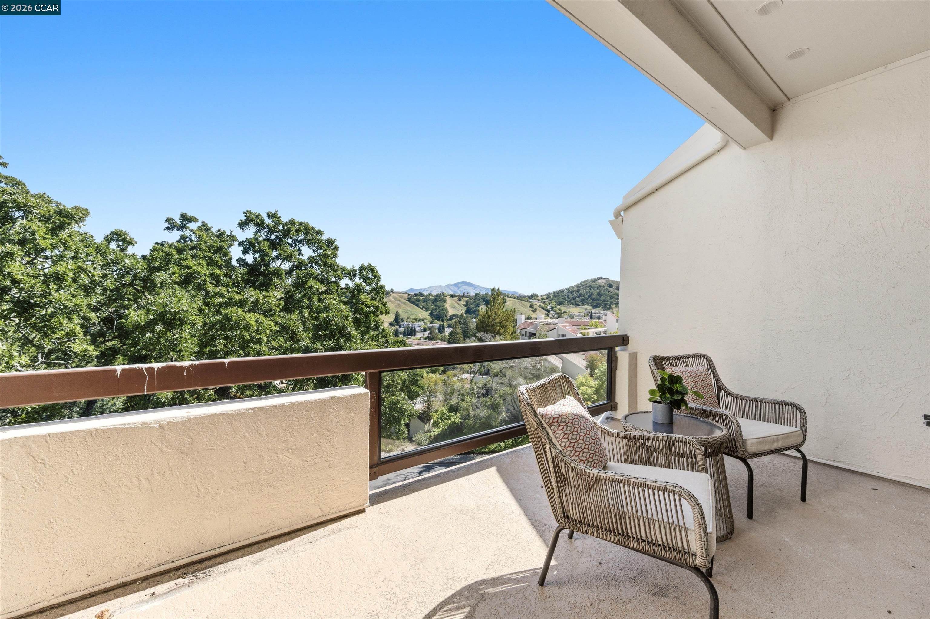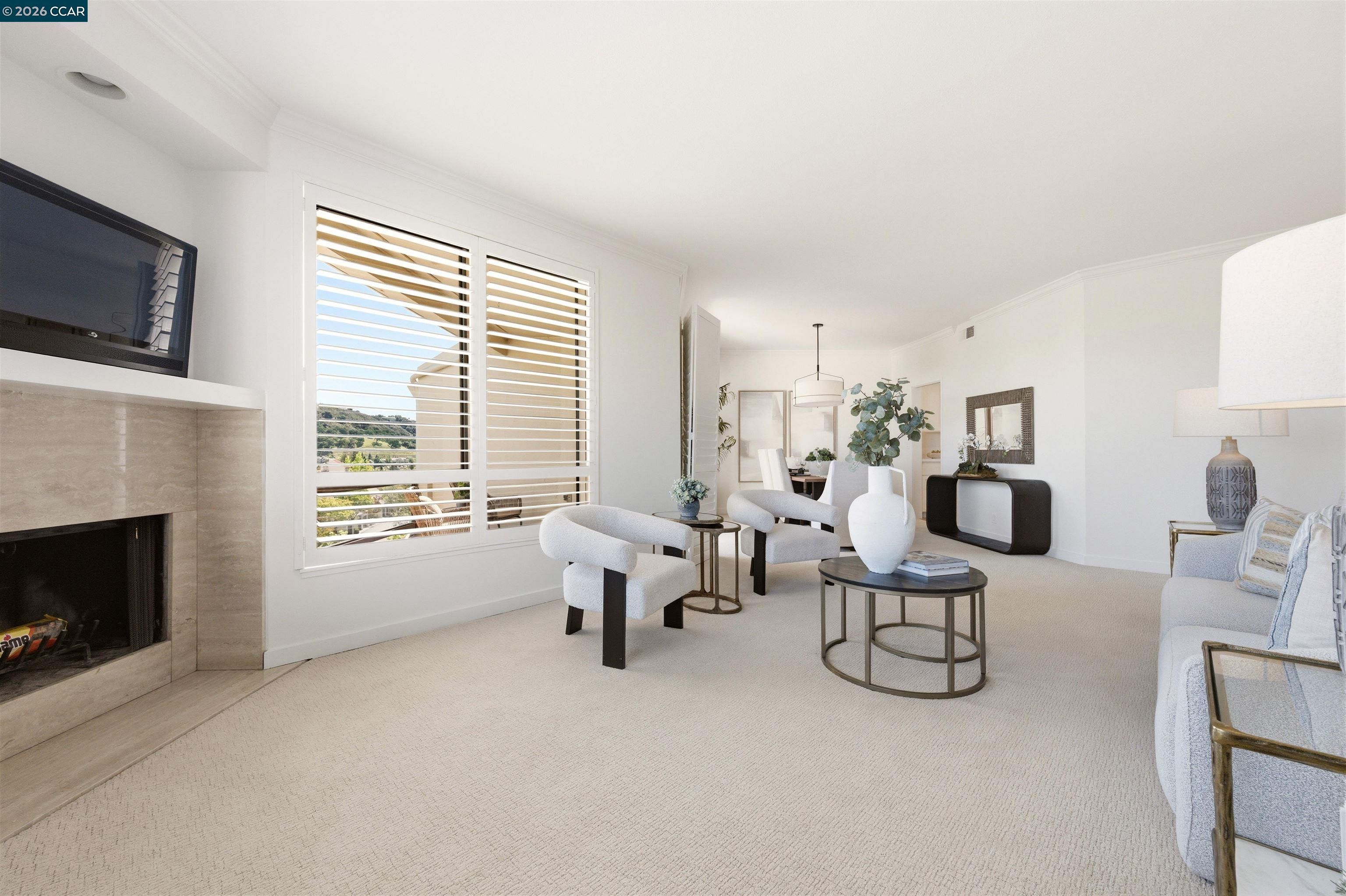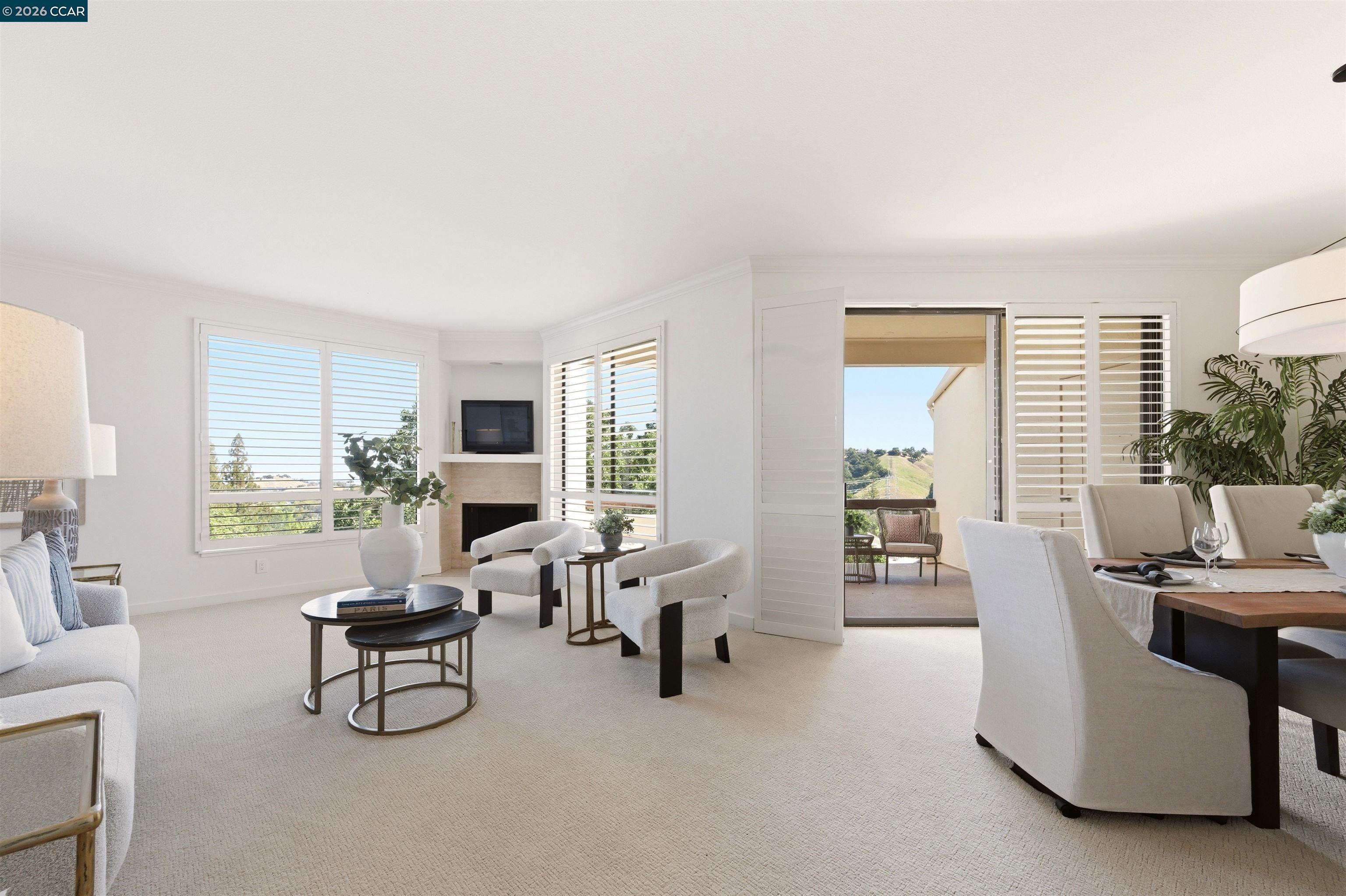 Easy level-in access welcomes you to this beautifully appointed home with sweeping panoramic views. A versatile interpretation of timeless tradition is expressed throughout, with dramatic high ceilings and disappearing walls of windows that fill the home with natural light. The beautifully updated kitchen features stainless steel appliances, new quartz countertops, abundant cabinetry, and the upscale finishes expected in a quality home. The spacious living room is anchored by a wood-burning fireplace, while two private decks offer wonderful spaces for outdoor enjoyment. A flexible den, enhanced by the stunning views, provides endless possibilities for work, relaxation, or guests. The expansive primary suite includes a charming sitting area and a large walk-in closet/dressing room. Spa-inspired baths have been tastefully updated, and the home’s refined interior is completed with high-end carpeting, white oak LVP flooring, custom blended paint, grand crown and base moldings, a rare garage, and additional carport parking. Distinctive details and thoughtful upgrades are found throughout this exceptional home.
