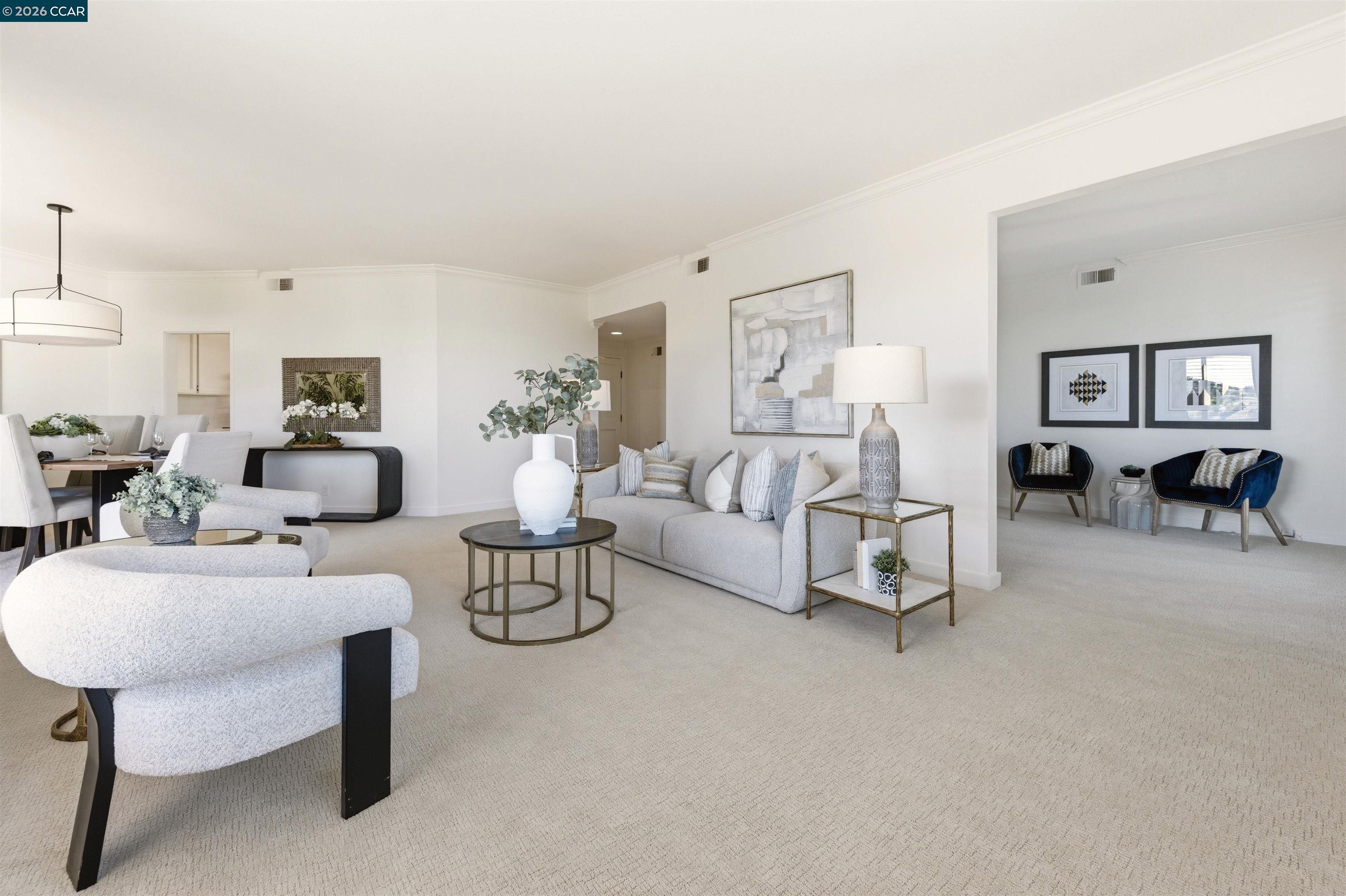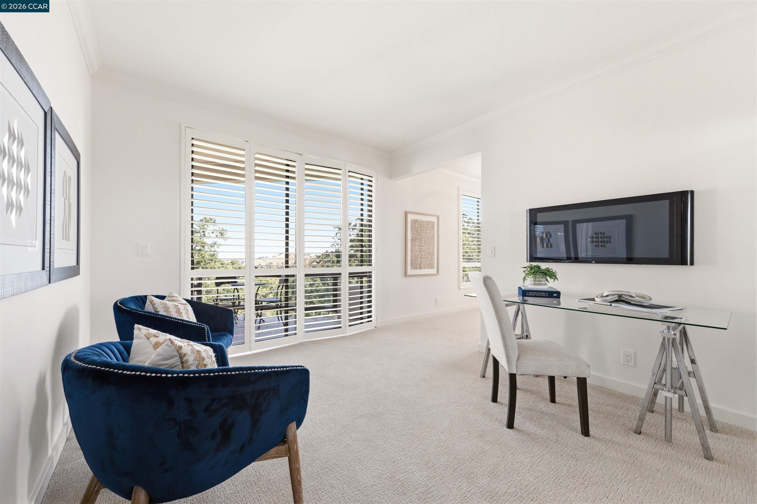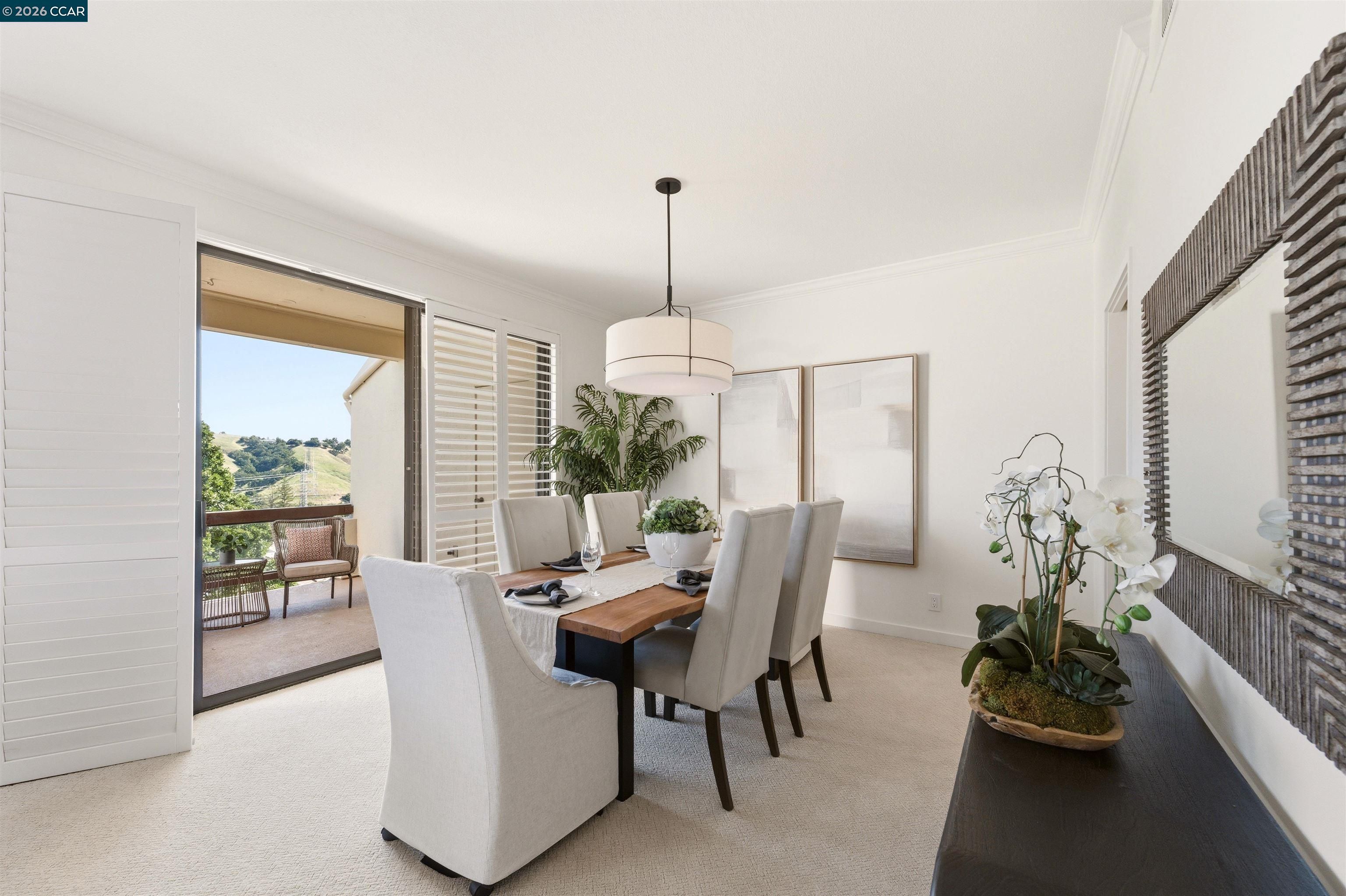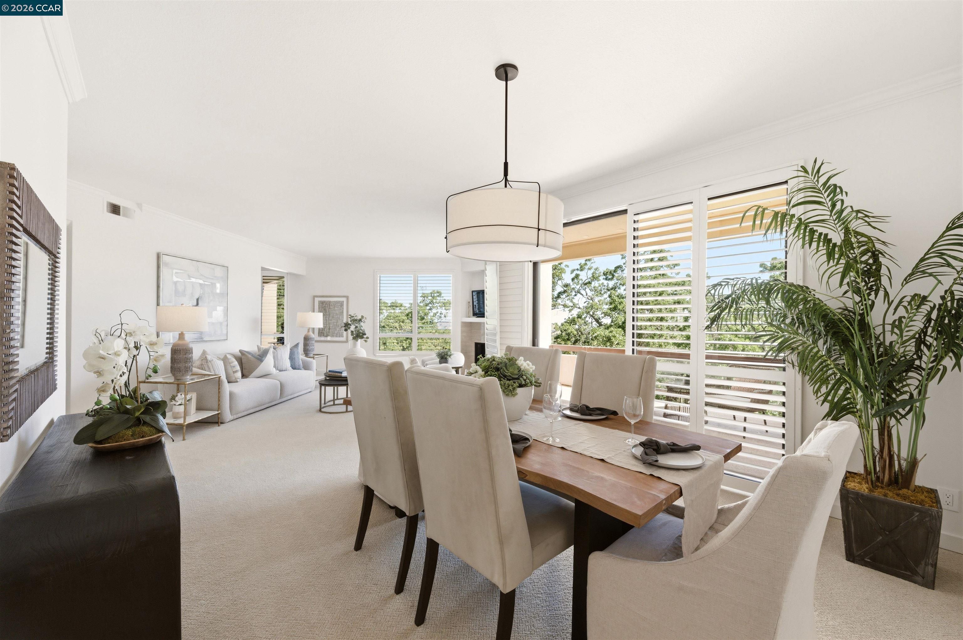 Easy level-in access welcomes you to this beautifully appointed home with sweeping panoramic views. A versatile interpretation of timeless tradition is expressed throughout, with dramatic high ceilings and disappearing walls of windows that fill the home with natural light. The beautifully updated kitchen features stainless steel appliances, new quartz countertops, abundant cabinetry, and the upscale finishes expected in a quality home. The spacious living room is anchored by a wood-burning fireplace, while two private decks offer wonderful spaces for outdoor enjoyment. A flexible den, enhanced by the stunning views, provides endless possibilities for work, relaxation, or guests. The expansive primary suite includes a charming sitting area and a large walk-in closet/dressing room. Spa-inspired baths have been tastefully updated, and the home’s refined interior is completed with high-end carpeting, white oak LVP flooring, custom blended paint, grand crown and base moldings, a rare garage, and additional carport parking. Distinctive details and thoughtful upgrades are found throughout this exceptional home.