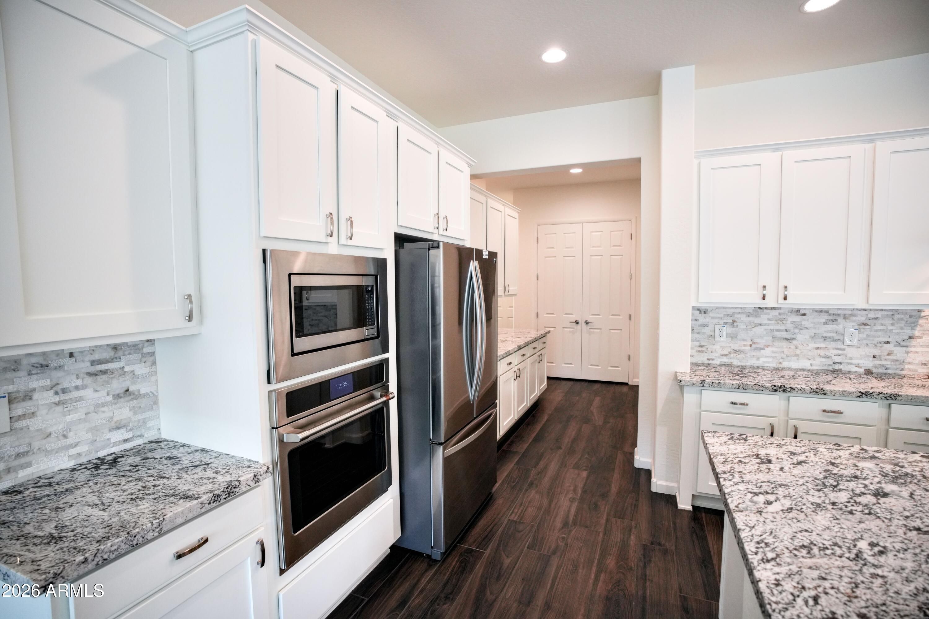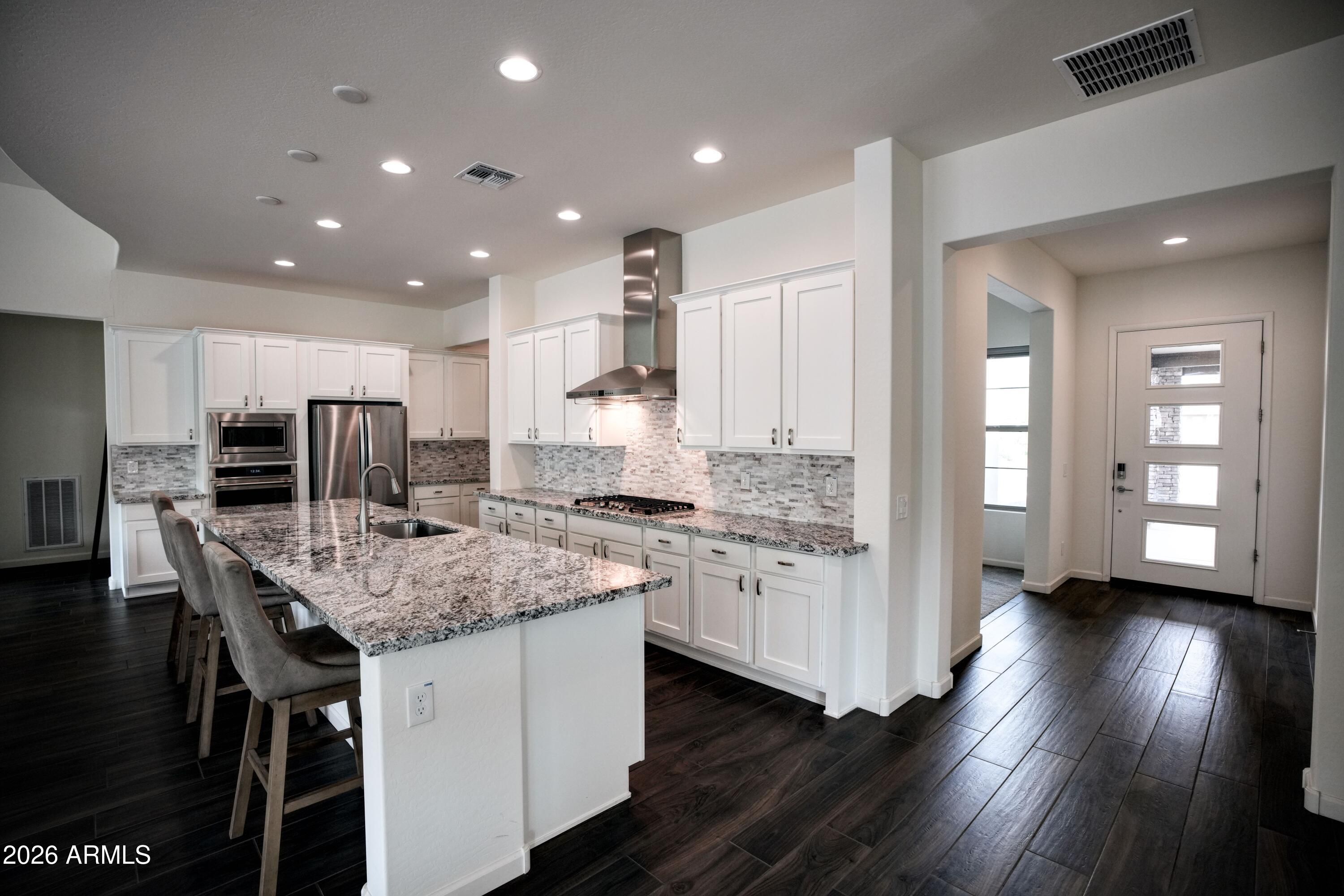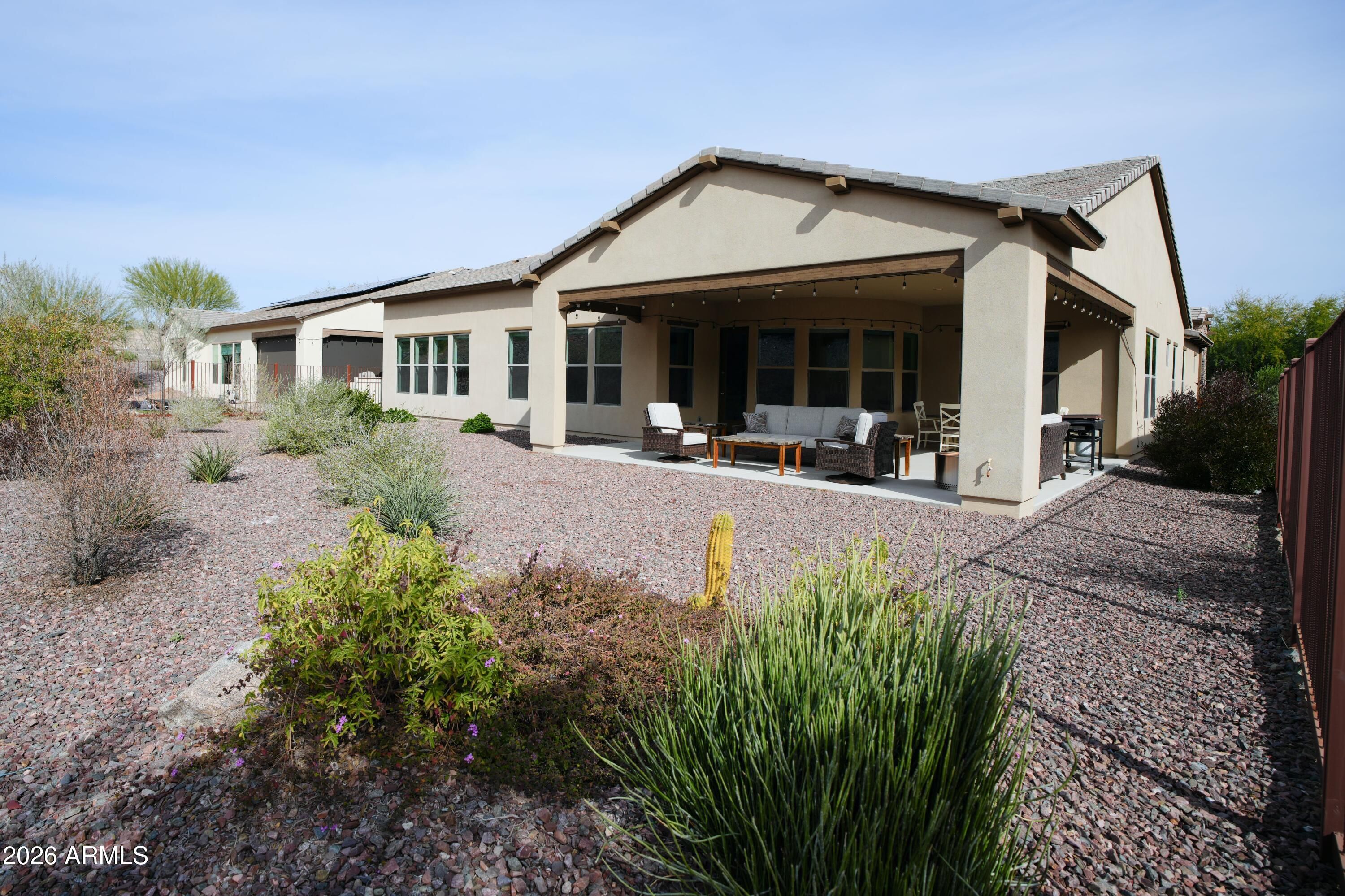 Welcome to the Orion, perfectly situated on a large, private lot with a huge patio—ideal for relaxing or entertaining. This thoughtfully designed home features warm gray tones throughout & an expansive open-concept layout. The oversized Great Room flows seamlessly into a chef's kitchen showcasing a gigantic island, extensive cabinetry & seemingly endless countertop space—perfect for gatherings & everyday living. The home offers 3 private suites, each with its own bathroom featuring granite countertops & beautifully tiled showers/tubs, providing comfort & privacy for all. A 3-car extended garage adds exceptional space. Located in Wickenburg Ranch, residents enjoy world-class golf, fitness center, fine dining, scenic walking trails & an active social lifestyle surrounded by natural beauty.