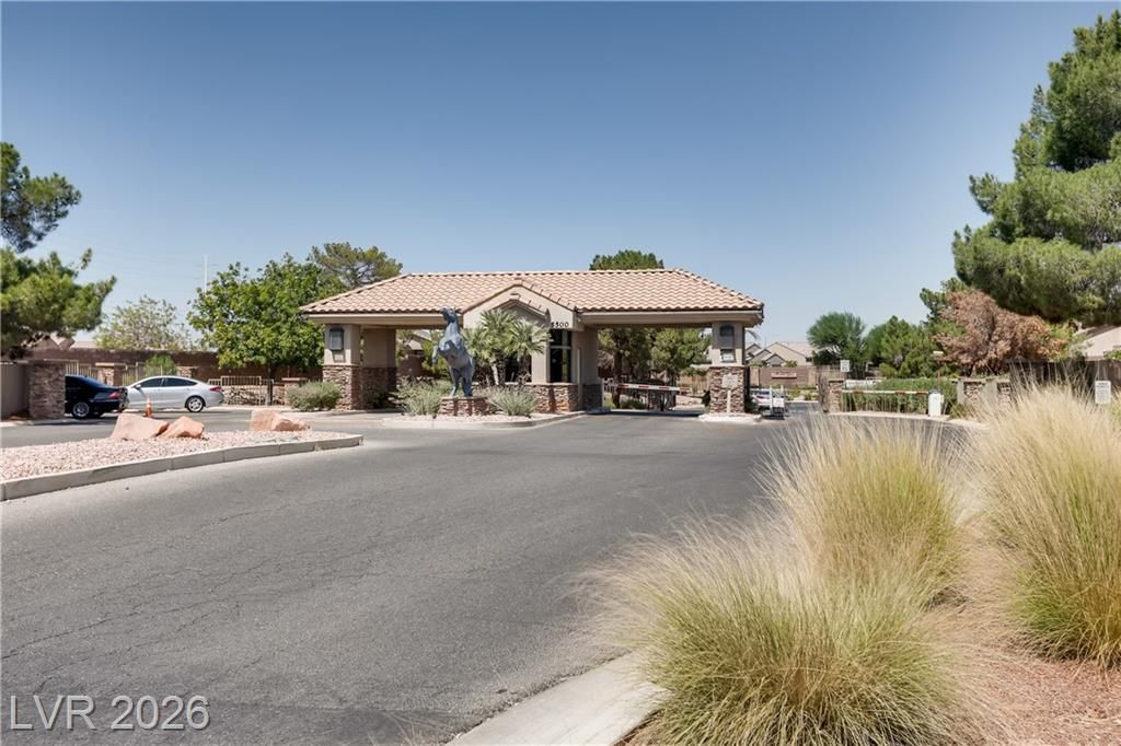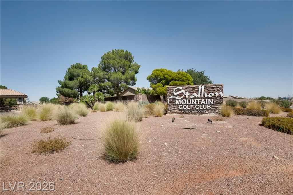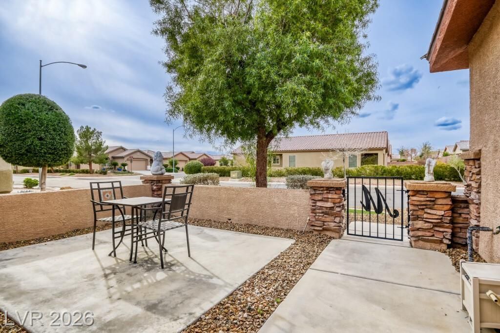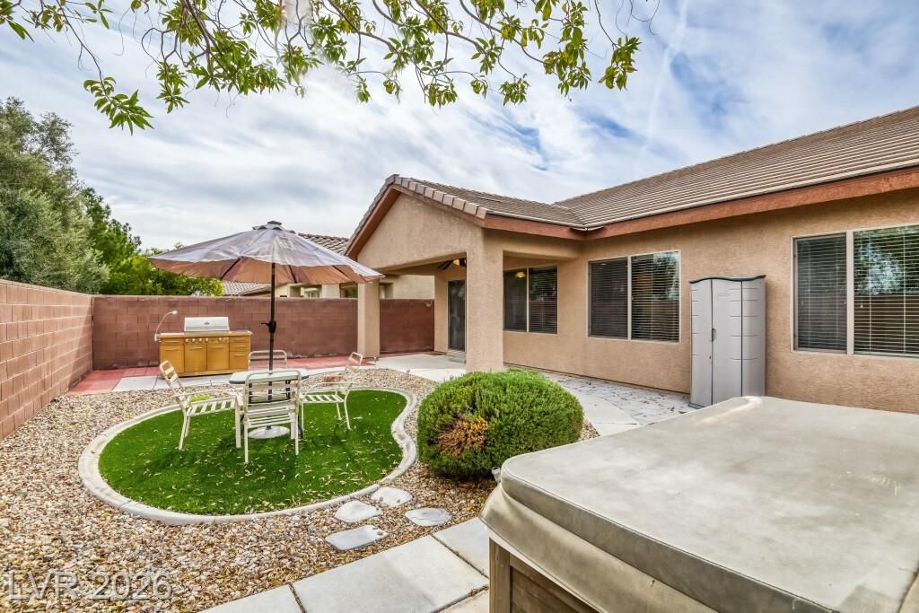 No rear neighbors! Welcome to luxury living in the serene, gated, 55+ community of Solera at Stallion Mountain, just minutes from the vibrant Las Vegas Strip. Residents enjoy access to many amenities including a golf course, clubhouse, fitness room, community spa & pool. Engage in various activities such as pickleball, tennis, bocce ball & more! A lovely front courtyard greets you as you arrive. The spacious owner's suite has a roomy ensuite bathroom w/ dual sinks & a stand-up shower and a spacious walk-in closet. This home features a 2nd bedroom & full bath. Additionally, a 3rd room offers versatility, to be used as a den, hobby room, office space or a third bedroom. The large kitchen has lovely granite countertops, pantry & lots of counter space. It flows nicely with the dining area and large living room. Ceiling fans throughout. Covered back patio and tranquil backyard with spa and gas connected barbeque with no neighbors behind. Be sure to check out the clubhouse when you're here!