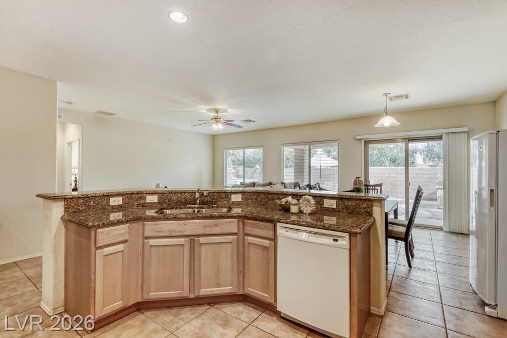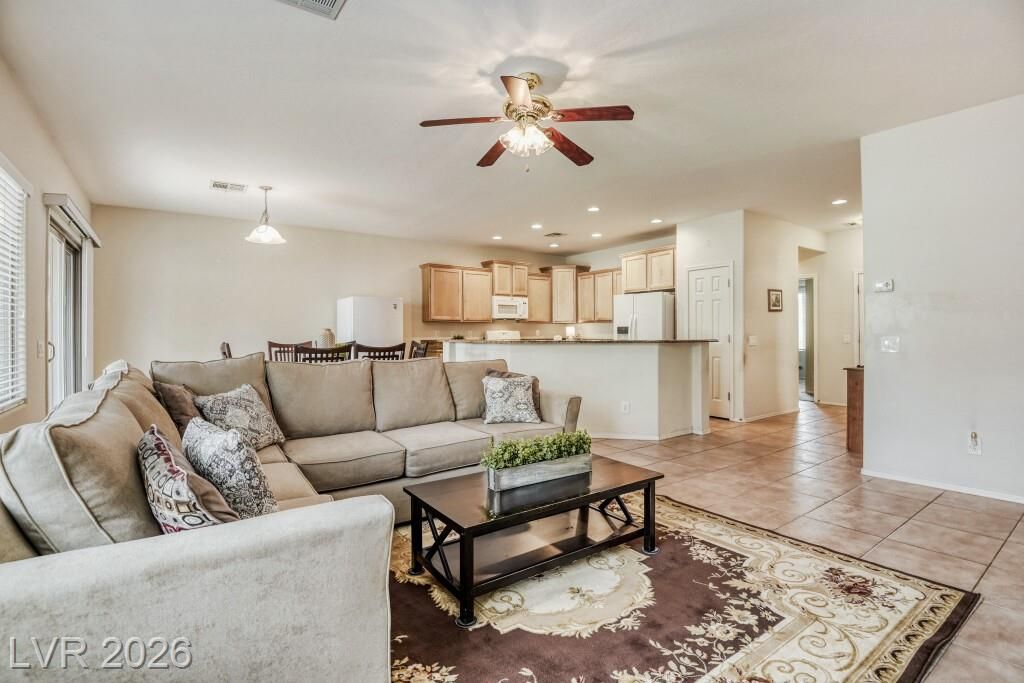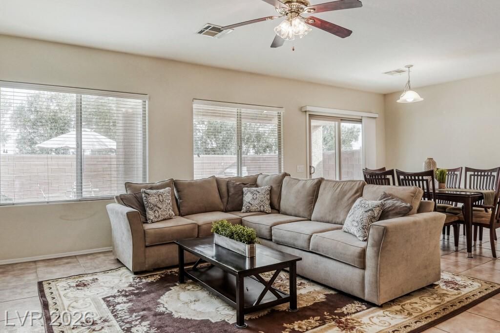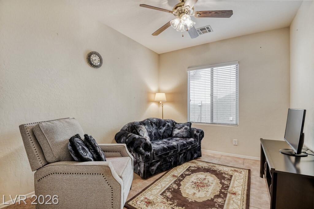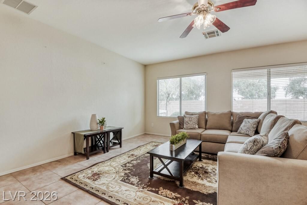 No rear neighbors! Welcome to luxury living in the serene, gated, 55+ community of Solera at Stallion Mountain, just minutes from the vibrant Las Vegas Strip. Residents enjoy access to many amenities including a golf course, clubhouse, fitness room, community spa & pool. Engage in various activities such as pickleball, tennis, bocce ball & more! A lovely front courtyard greets you as you arrive. The spacious owner's suite has a roomy ensuite bathroom w/ dual sinks & a stand-up shower and a spacious walk-in closet. This home features a 2nd bedroom & full bath. Additionally, a 3rd room offers versatility, to be used as a den, hobby room, office space or a third bedroom. The large kitchen has lovely granite countertops, pantry & lots of counter space. It flows nicely with the dining area and large living room. Ceiling fans throughout. Covered back patio and tranquil backyard with spa and gas connected barbeque with no neighbors behind. Be sure to check out the clubhouse when you're here!