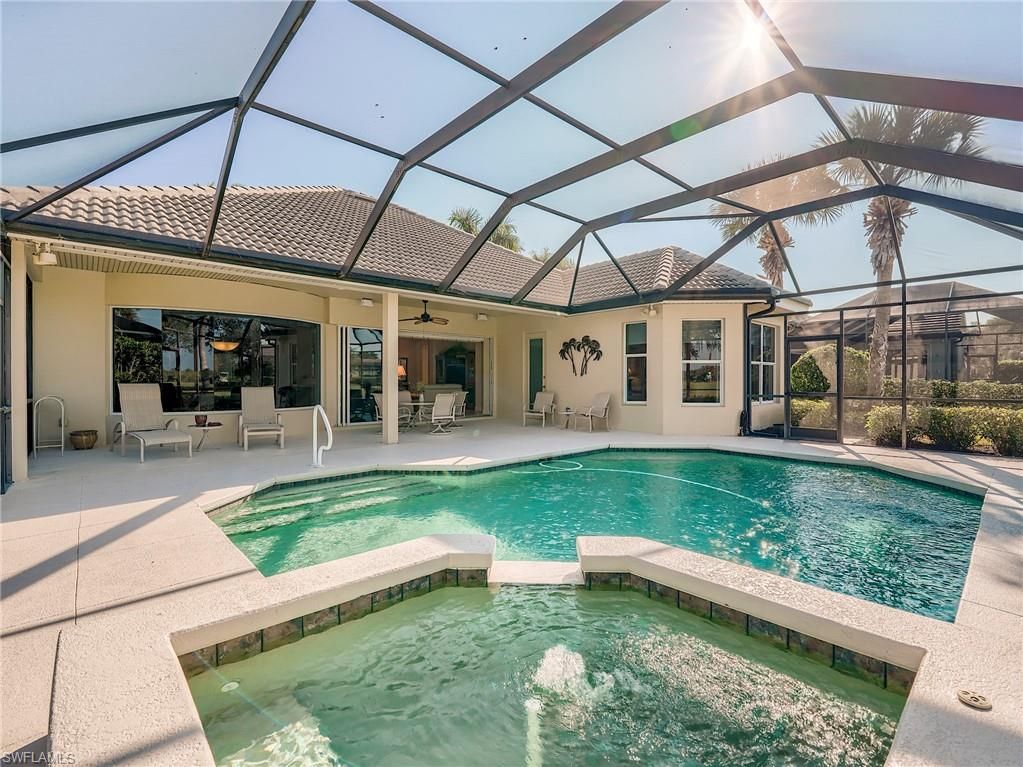 Experience luxury living in this elegant single-family home located in the highly sought-after gated golf community of Verandah. Overlooking the scenic 7th green of the Old Orange golf course, this Arthur Rutenberg Muirfield II residence blends timeless design with modern comfort. Offering 2,327 sq. ft. of beautifully designed living space, the home features 3 bedrooms plus a den, 2 full baths, and 1 half bath, ideal for both everyday living and entertaining. The open floor plan welcomes you with spacious interiors, abundant natural light, and seamless indoor-outdoor flow. The gourmet kitchen stands out with its signature mitered windows, offering panoramic views of the lanai and golf course, while the guest bedrooms are enhanced with plantation shutters for added charm and privacy. The large master suite provides a peaceful retreat with ample room to relax. Step outside to your private oasis where a sparkling pool and spa, extended lanai, and serene golf course backdrop create the perfect setting for outdoor dining, lounging, and entertaining. A side-load 2-car garage adds to the home’s curb appeal and convenience. Located within Verandah, residents enjoy access to top-tier amenities, including championship golf, tennis, pickleball, bocce, nature trails, fitness facilities, and more—all in a tranquil, beautifully maintained environment. This exceptional property combines upscale finishes, thoughtful design, and a premier location—an ideal opportunity to enjoy Florida living at its finest.