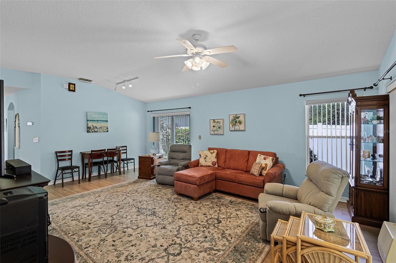 - Ceiling Fan(s), Eat-in Kitchen, Living/Dining Room, Open Floorplan, Main Level Primary, Solid Surface Counters, Solid-Wood Cabinets, Split Bedrooms, Thermostat, Walk-In Closet(s), Window Treatments