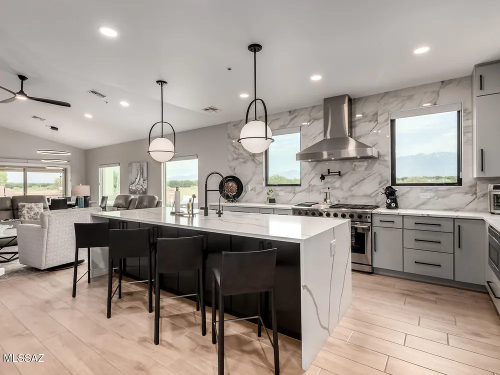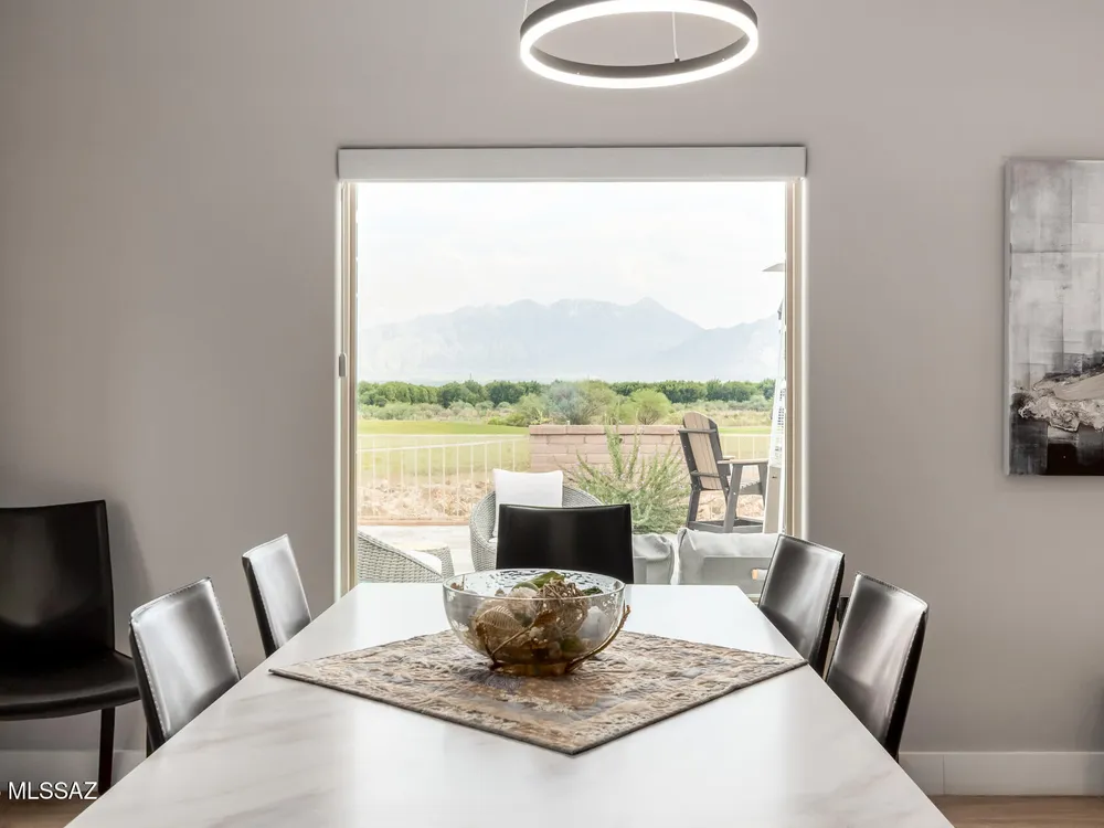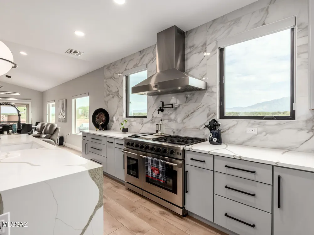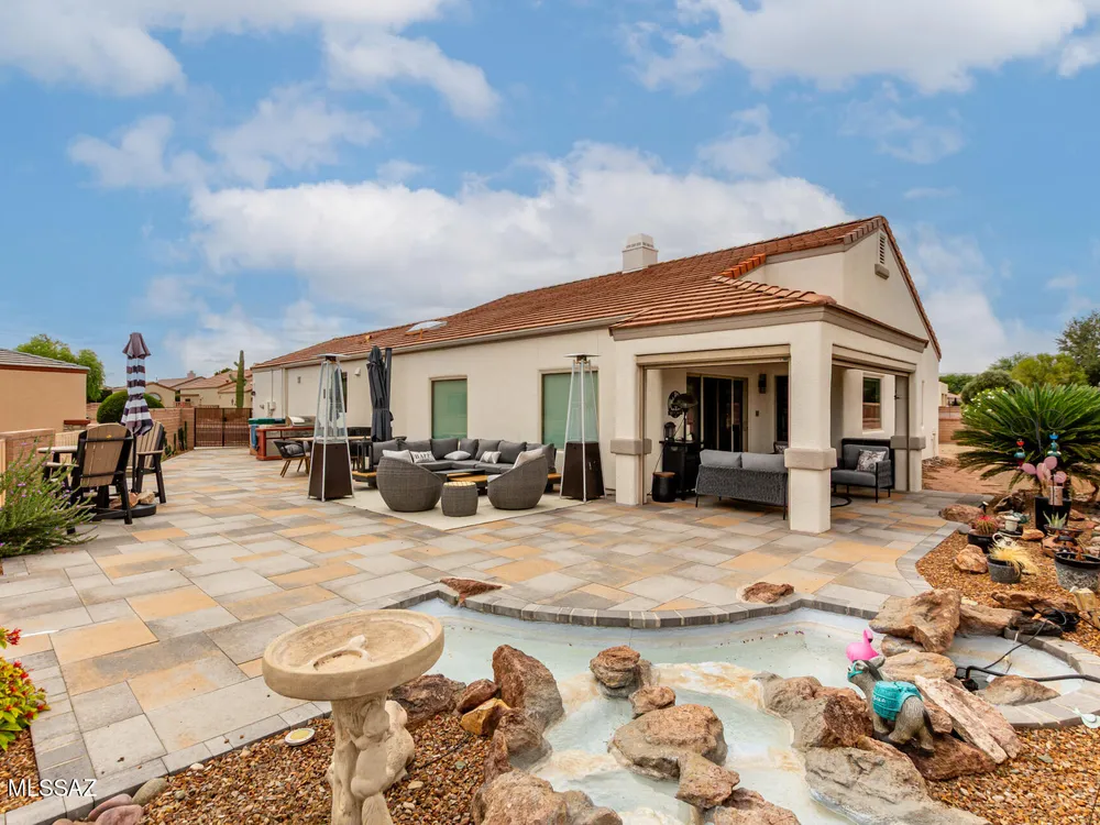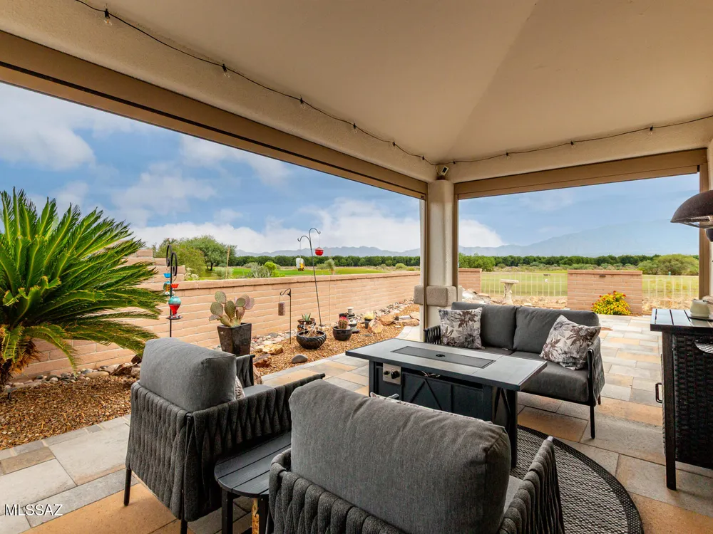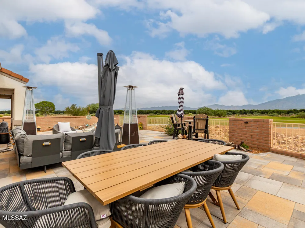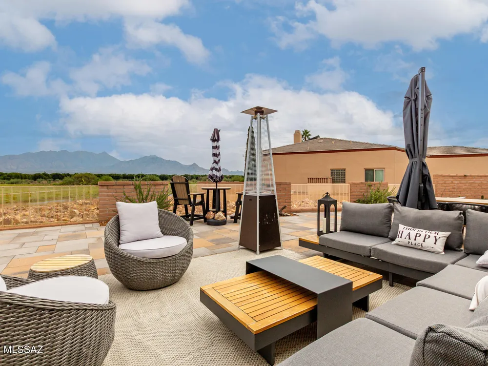 Enjoy breathtaking unobstructed views of the Santa Rita Mountains and the 18th green of Torres Blancas Golf Course from this stunning, fully remodeled home. Thoughtfully updated inside and out with elegant finishes and quality craftsmanship, this property also includes a detached casita for guests or personal use. The chef's kitchen features premium appliances, a Thor gas range with pot filler, reverse osmosis and alkaline water systems, solid-surface countertops, a coffee bar, built-in spice rack, and trash/recycling center. The great room opens to a wrap-around patio with new pavers and a beautifully landscaped backyard, professionally stubbed for gas, water, and electric, ready for your dream outdoor kitchen. Perfect for entertaining or relaxing while taking in the stunning views.