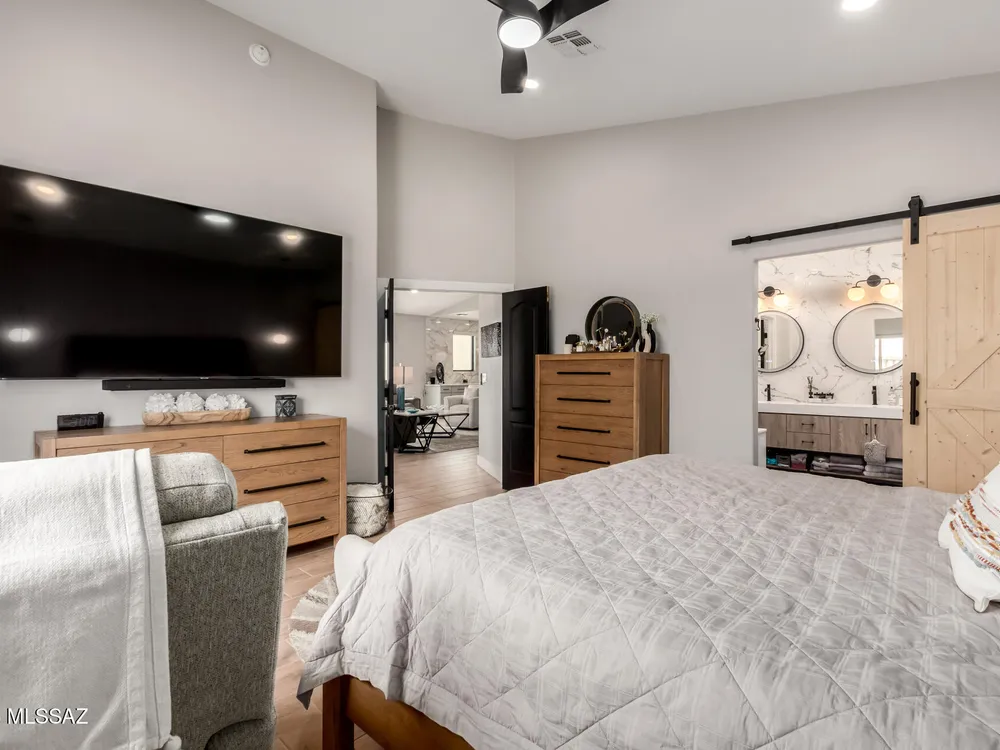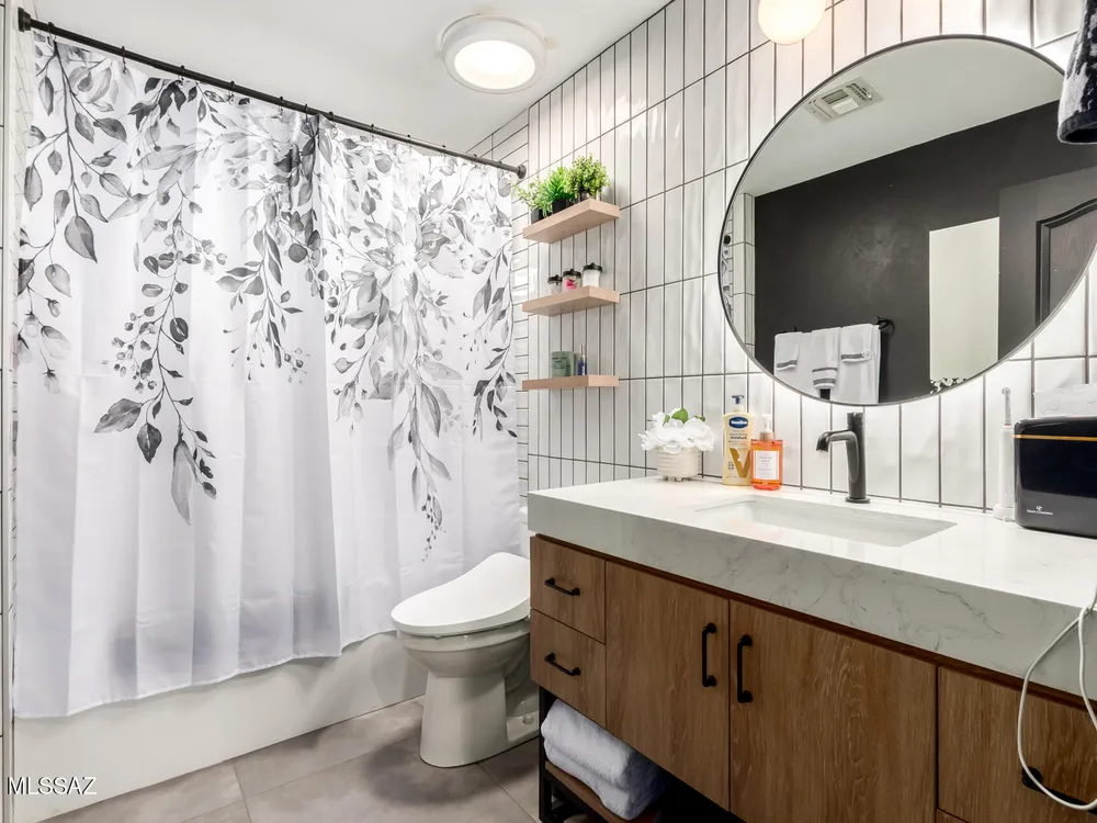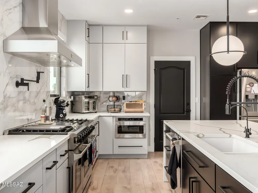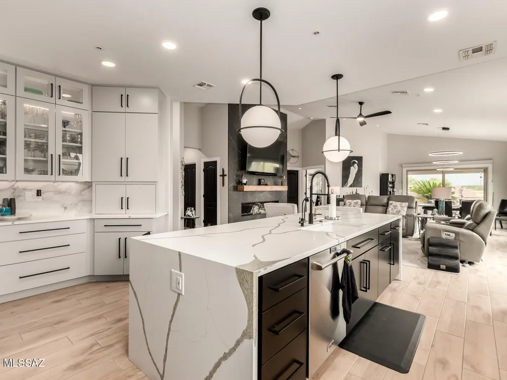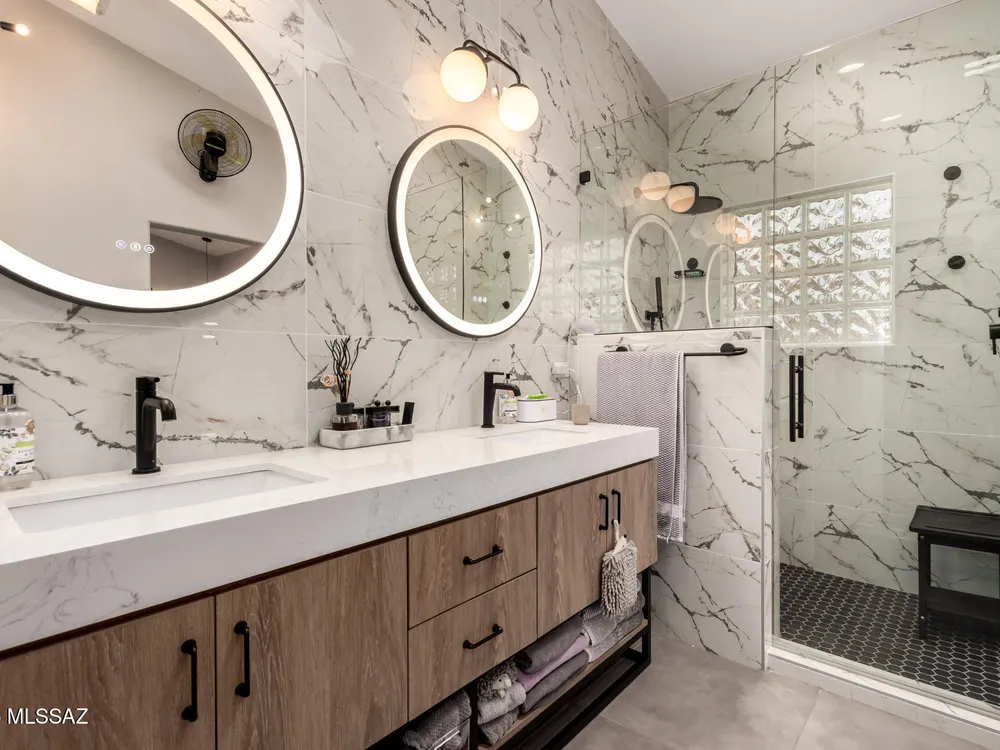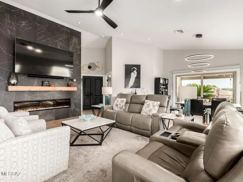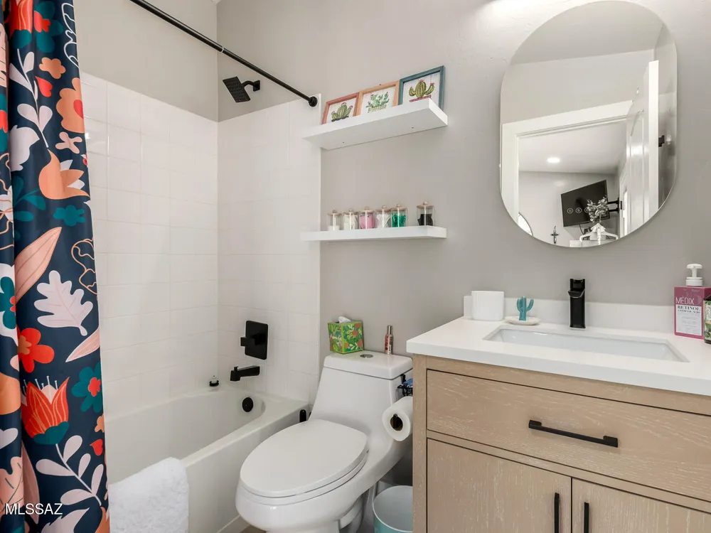 Enjoy breathtaking unobstructed views of the Santa Rita Mountains and the 18th green of Torres Blancas Golf Course from this stunning, fully remodeled home. Thoughtfully updated inside and out with elegant finishes and quality craftsmanship, this property also includes a detached casita for guests or personal use. The chef's kitchen features premium appliances, a Thor gas range with pot filler, reverse osmosis and alkaline water systems, solid-surface countertops, a coffee bar, built-in spice rack, and trash/recycling center. The great room opens to a wrap-around patio with new pavers and a beautifully landscaped backyard, professionally stubbed for gas, water, and electric, ready for your dream outdoor kitchen. Perfect for entertaining or relaxing while taking in the stunning views.