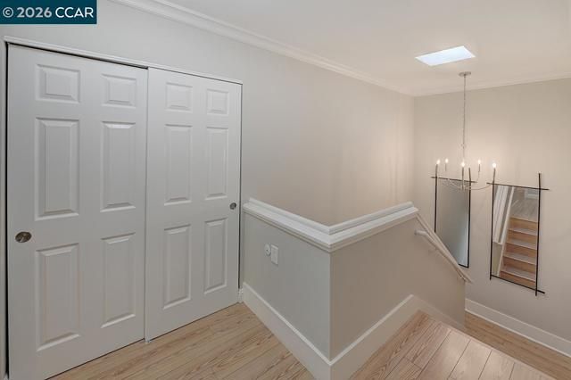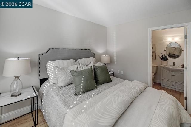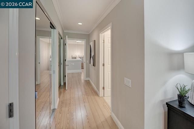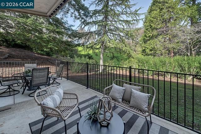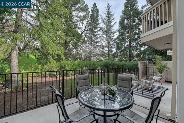 Rare Rossmoor Piedmont home featuring an exceptional wraparound fenced patio with expansive space for outdoor entertaining and gardening. Set among towering redwood trees, this home offers uncommon privacy and a true sense of retreat. The open living and dining area features crown molding and subtle mood lighting, while the kitchen offers granite countertops, bright cabinetry, a window view, and stainless steel appliances. Upstairs, the primary suite includes multiple closets, a private balcony, and a spa-style bath with skylight, jetted tub, separate shower, double vanity, and a conveniently located side-by-side washer and dryer. Two additional bedrooms, including a downstairs bedroom with an attached full bath, provide flexible living options. Fresh interior paint and hardwood flooring throughout complete this move-in-ready Piedmont.