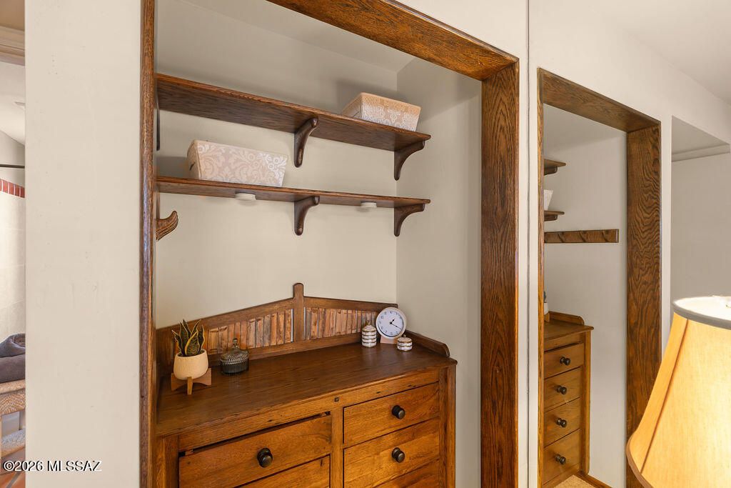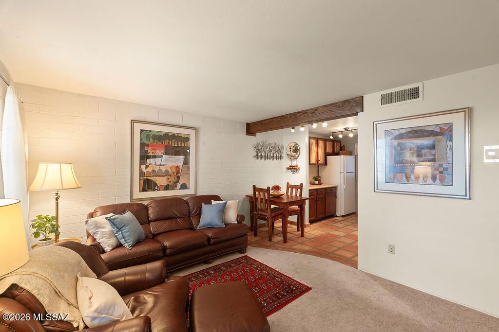 Welcome to this fully furnished, lock-and-leave townhome in Green Valley, Arizona, offering authentic Southwestern style in a peaceful desert setting. Set back from the road, the east-facing front patio overlooks open green space with mature trees and native desert landscaping--an ideal place to enjoy Arizona mornings.A handcrafted saguaro-ribbed gate leads into the private patio and introduces the custom details carried throughout the home. Inside, this move-in ready Green Valley townhome features updated finishes and warm architectural touches. The kitchen showcases custom Saltillo tile flooring, gracefully curved into the living area, along with refinished cabinetry in a rich dark stain accented with saguaro-rib detailing.