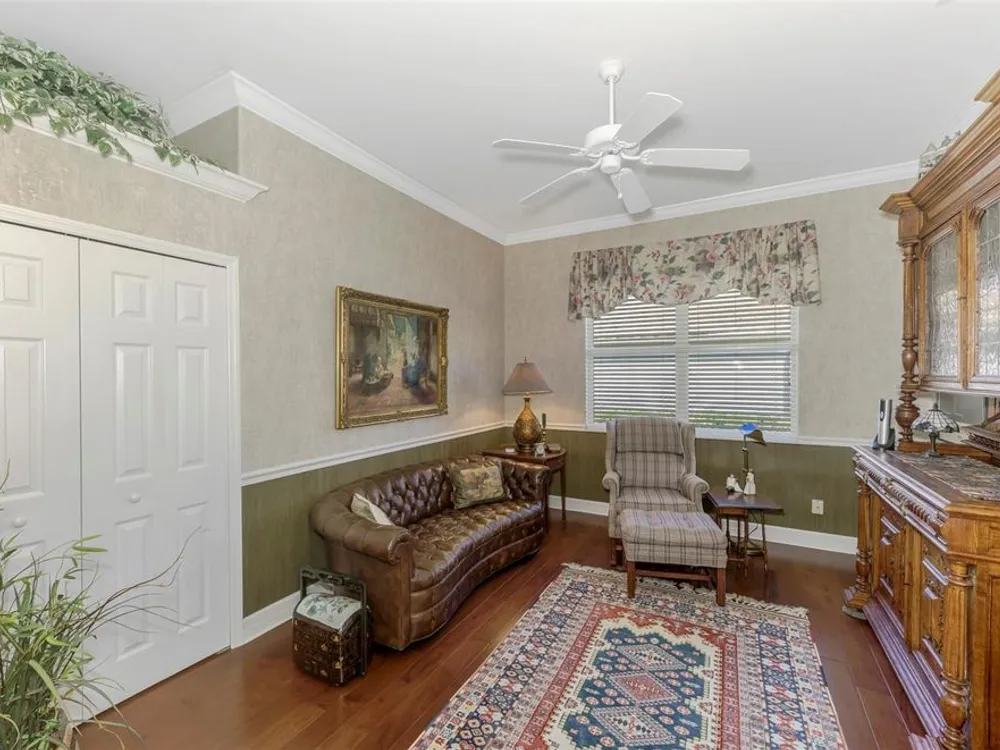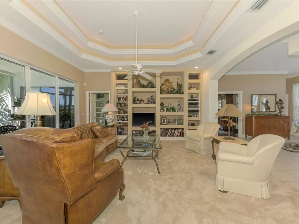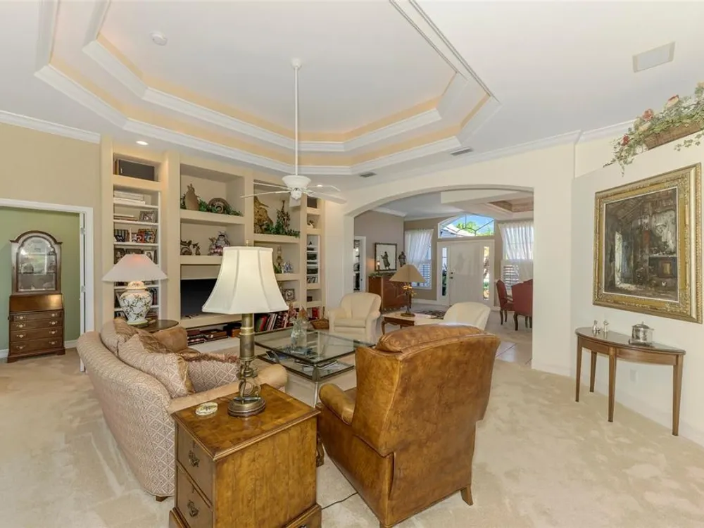 - Built-in Features, Ceiling Fan(s), Coffered Ceiling(s), Crown Molding, High Ceilings, Open Floorplan, Main Level Primary, Solid Surface Counters, Solid-Wood Cabinets, Thermostat, Walk-In Closet(s), Window Treatments