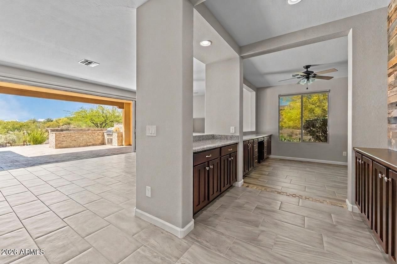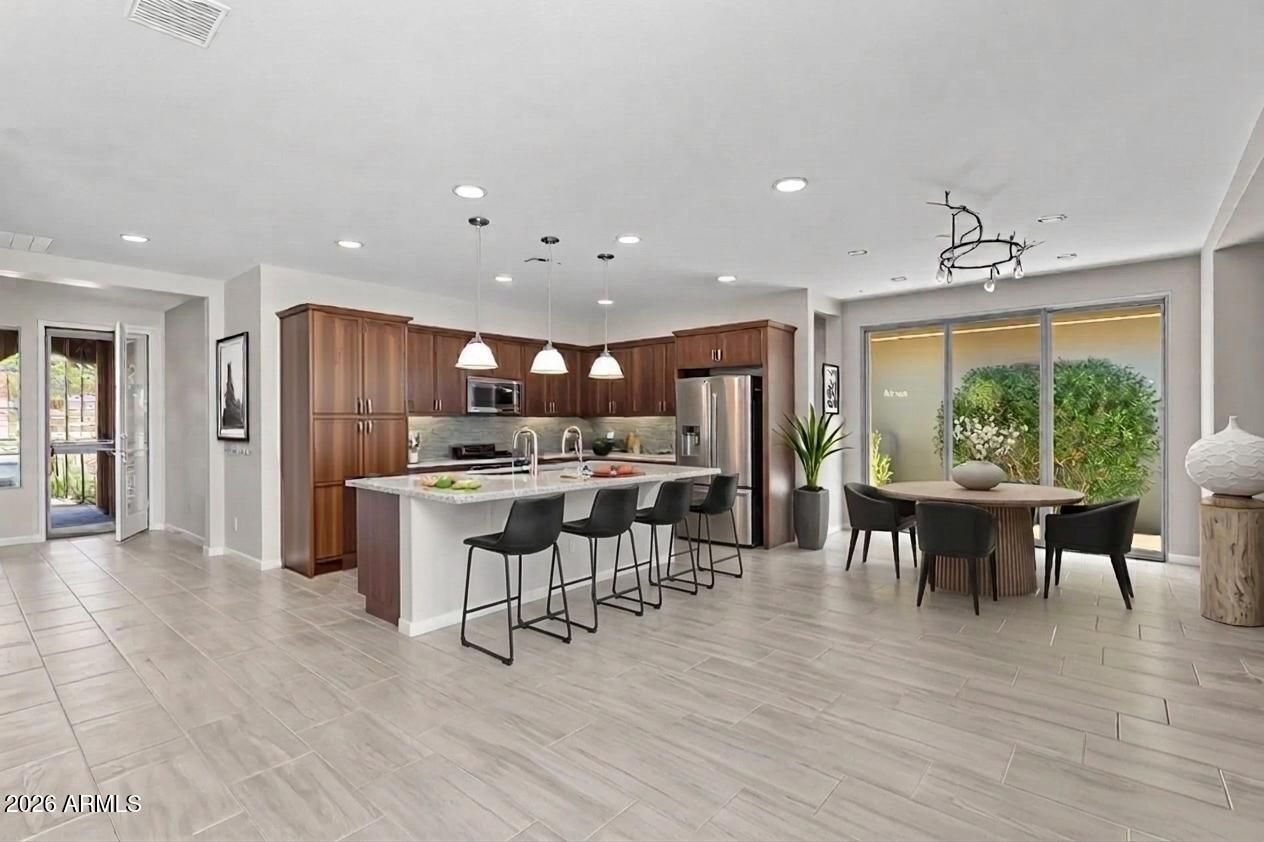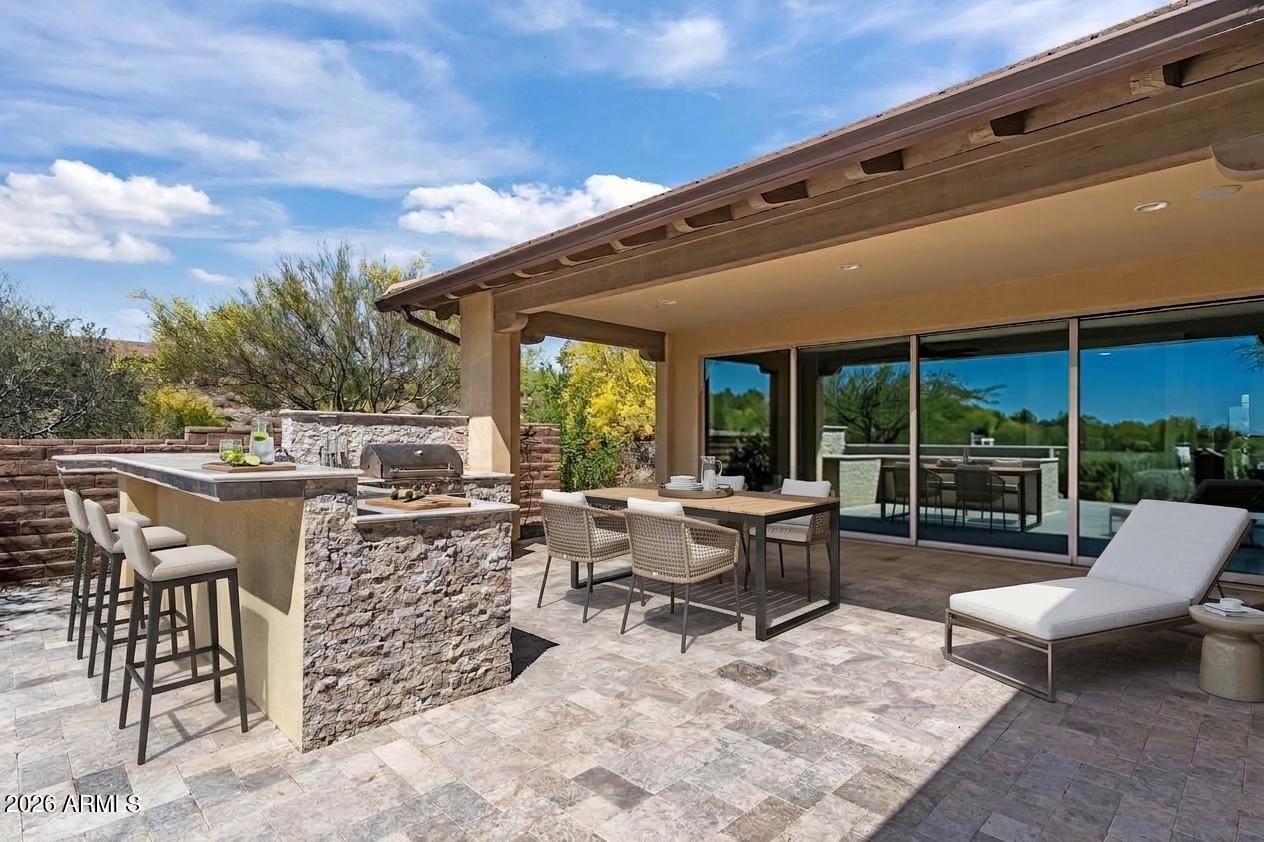 Experience the ultimate blend of luxury and efficiency in this beautifully designed 2-bedroom, 2-bathroom home, set in the heart of Wickenburg Ranch. The open-concept floor plan flows effortlessly, anchored by a show-stopping 15-foot rolling wall of glass that blurs the line between indoor and outdoor living. Whether you're entertaining or enjoying a quiet evening, this unique feature allows you to fully embrace the beauty of the surrounding desert from your living room. The kitchen is a culinary masterpiece, complete with high-end stainless steel appliances, a large island with seating, and sleek countertops. Adjacent to the kitchen, a dedicated bar area creates the perfect space for hosting gatherings with friends and family. In addition, the den provides flexible space that can be customized to suit your needs, whether as a library, home office, or hobby room. Step outside to the expansive covered patio, where you'll find stunning desert views that create a peaceful backdrop for outdoor dining or relaxation.The 2-car garage offers ample space for vehicles and built in cabinet offer ample storage.With thoughtful upgrades throughout and a focus on indoor-outdoor living, this home is a perfect blend of comfort and sophistication.