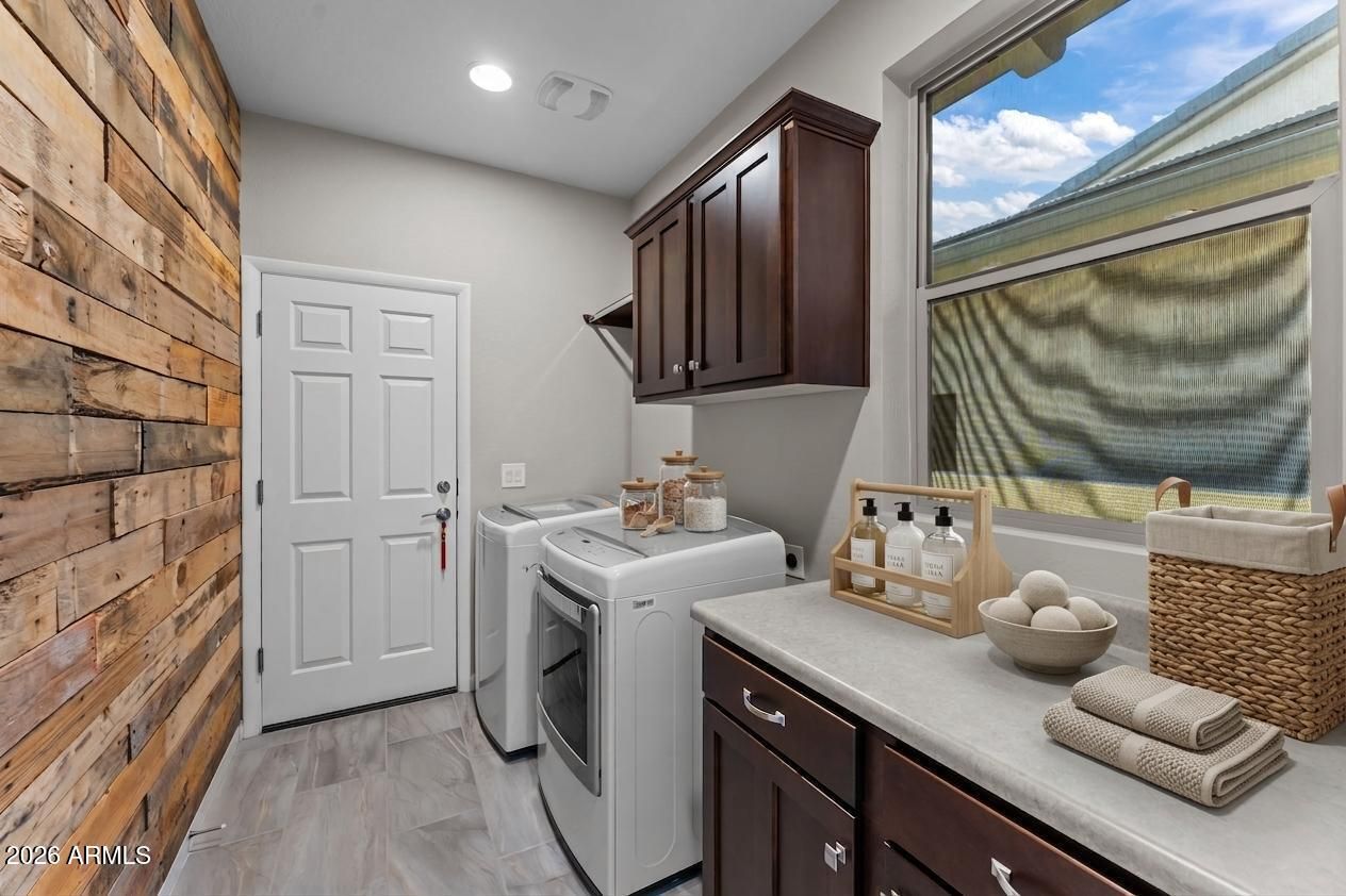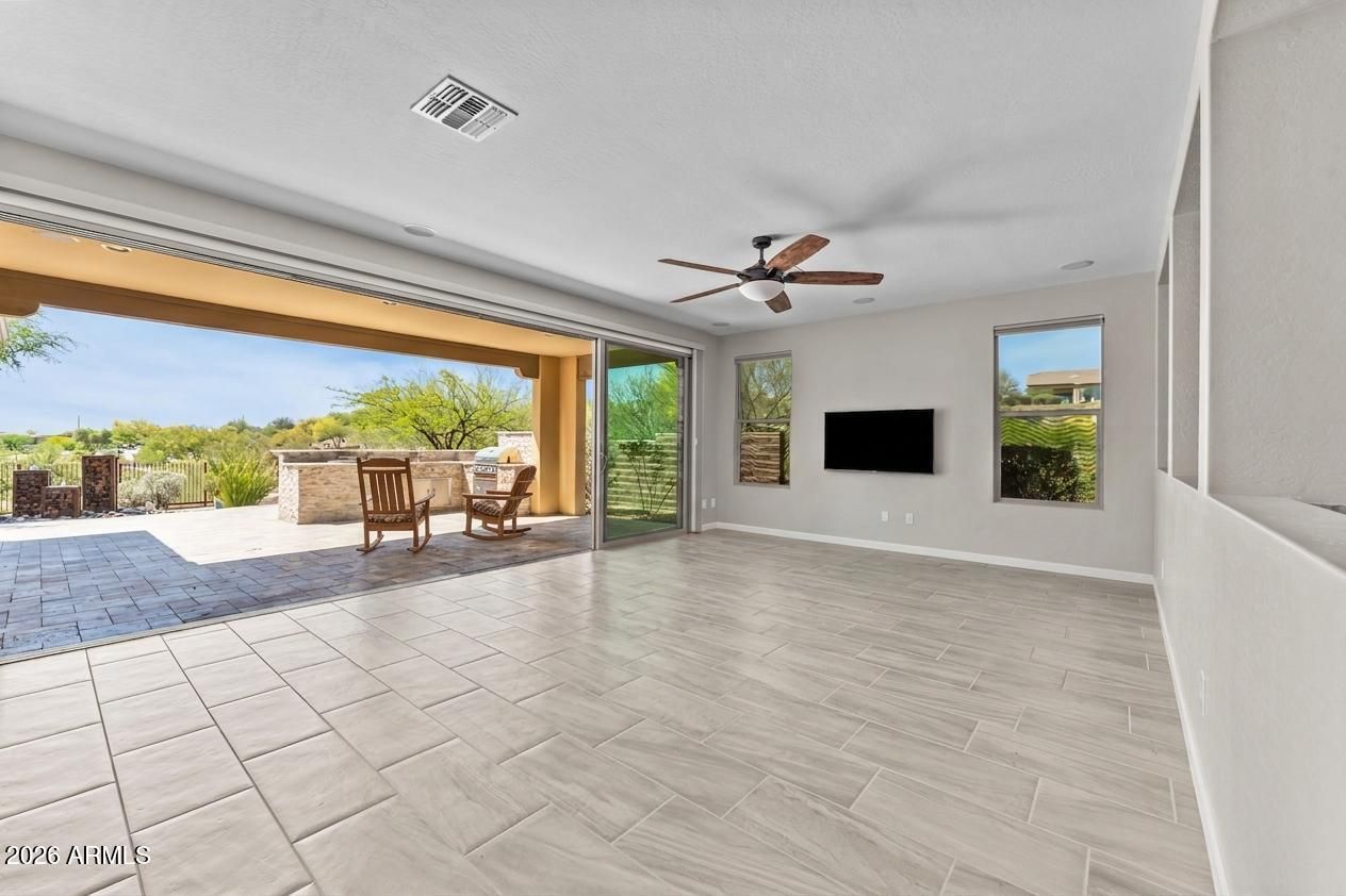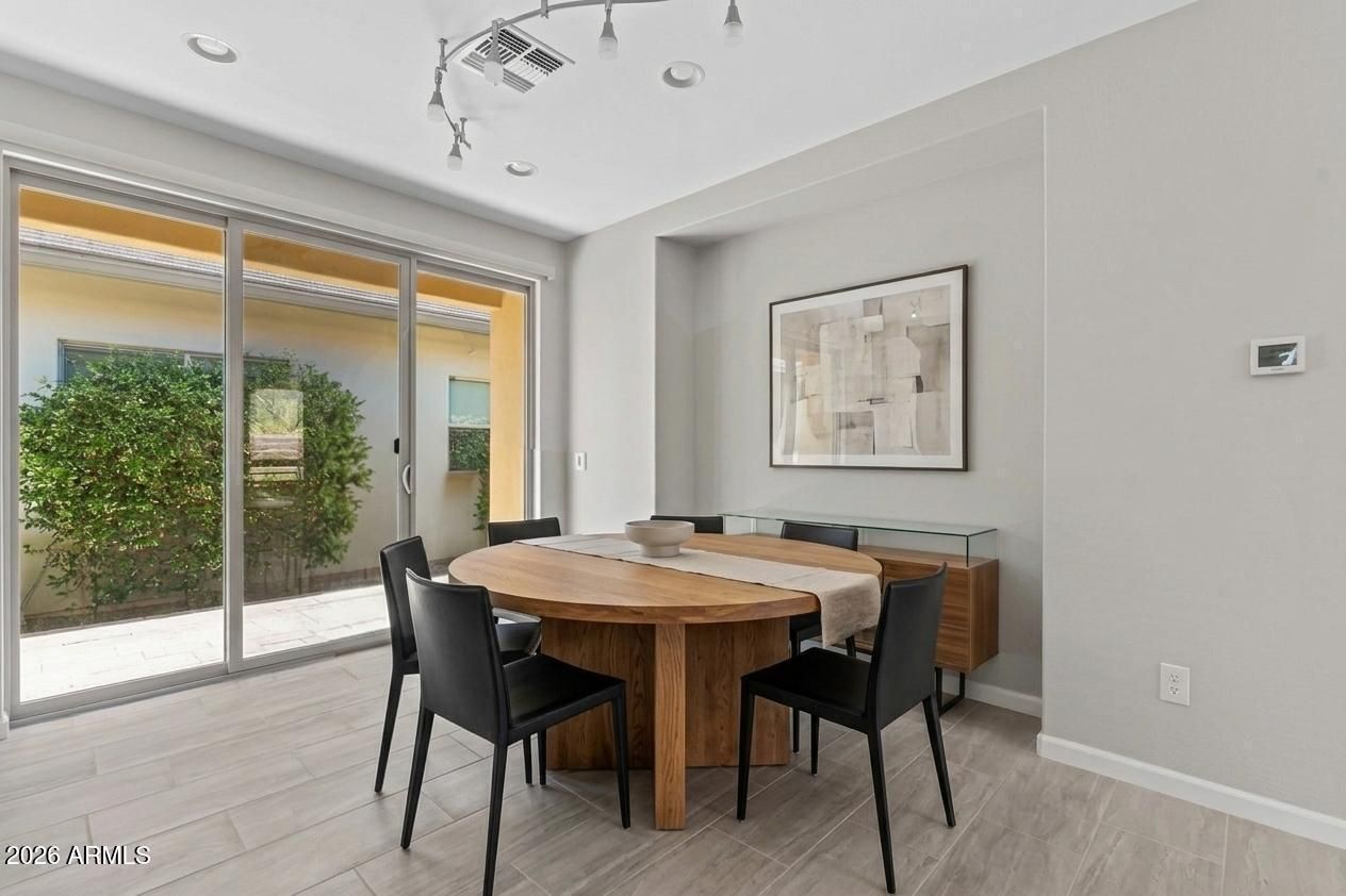 Experience the ultimate blend of luxury and efficiency in this beautifully designed 2-bedroom, 2-bathroom home, set in the heart of Wickenburg Ranch. The open-concept floor plan flows effortlessly, anchored by a show-stopping 15-foot rolling wall of glass that blurs the line between indoor and outdoor living. Whether you're entertaining or enjoying a quiet evening, this unique feature allows you to fully embrace the beauty of the surrounding desert from your living room. The kitchen is a culinary masterpiece, complete with high-end stainless steel appliances, a large island with seating, and sleek countertops. Adjacent to the kitchen, a dedicated bar area creates the perfect space for hosting gatherings with friends and family. In addition, the den provides flexible space that can be customized to suit your needs, whether as a library, home office, or hobby room. Step outside to the expansive covered patio, where you'll find stunning desert views that create a peaceful backdrop for outdoor dining or relaxation.The 2-car garage offers ample space for vehicles and built in cabinet offer ample storage.With thoughtful upgrades throughout and a focus on indoor-outdoor living, this home is a perfect blend of comfort and sophistication.