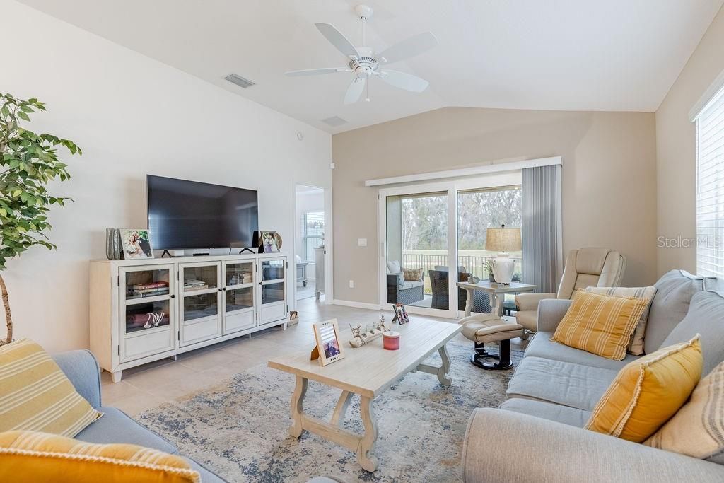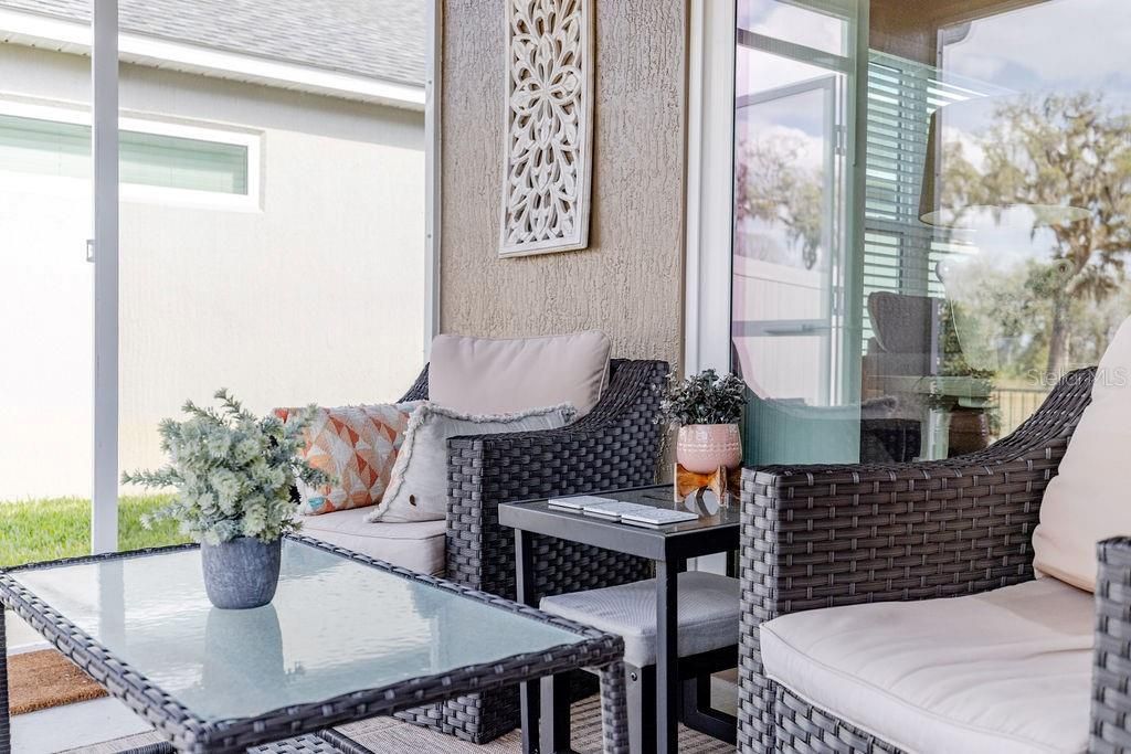 WELCOME HOME to one of the most desirable courtyard villas in the Village of DeLuna — perfectly positioned on a premium WATERFRONT homesite showcasing tranquil water, a preserve backdrop, and a breathtaking canopy of mature Live Oak trees cascading overhead. This exceptional 3-Bedroom, 2-Bath Charlotte BUNGALOW VILLA offers a rare blend of privacy, scenery, and convenience. The fully fenced private courtyard yard, private patio, and screened lanai create a peaceful outdoor setting ideal for relaxing, entertaining, and enjoying the natural landscape. A standout feature of this property is its location along a quiet multimodal path with no golf cart traffic, enhancing the sense of serenity while maintaining easy connectivity to The Villages lifestyle. Enjoy morning coffee overlooking the water and evening views across the preserve in a setting that feels private yet central. Inside, the home showcases a bright open floor plan with vaulted ceilings, crown and baseboard molding, and tile flooring throughout for a cohesive, low-maintenance interior. Sliding glass doors seamlessly connect indoor living spaces to the lanai and courtyard, maximizing natural light and views. The well-appointed kitchen is thoughtfully designed with: • Hi Definition countertops • Stainless steel appliances • Gas range • Pull-out shelving • Pantry closet • Breakfast bar The primary suite offers a comfortable retreat with lanai access, tray ceiling, custom walk-in closet, and an ensuite bath featuring dual vanities and a glassed Roman walk-in shower. Guest accommodations are versatile and well positioned. The front bedroom easily serves as an office, den, or sitting room, while the second guest bedroom is tucked behind a pocket door creating a private guest wing alongside a guest bath with tub-shower combination. Additional highlights include: • Interior laundry with mud sink and extra-deep cabinetry • Ceiling fans throughout • Blinds on all windows • Added garage storage • Enclosed lanai extending the living space while capturing water and preserve views This home is offered with high-quality, COMPLETELY TURNKEY furnishings, creating an effortless move-in experience ideal for full-time living, seasonal use, or investment. Furnishings are thoughtfully selected to complement the home’s style and setting. Golf cart available separately. Location is outstanding — just .4 miles to the DeLuna Recreation Center and Postal Station, minutes to Fenney Recreation Center and trails, the Everglades Regional Recreation Center, and multiple championship golf courses including Lowlands, Loblolly, Longleaf, Red Fox, and Gray Fox. Conveniently positioned between Brownwood Paddock Square and the new Eastport Town Center for dining, shopping, and entertainment. Premium homesites offering water views, preserved natural landscape, mature Live Oaks, private fenced courtyard living, and multimodal path frontage are limited — especially in the highly popular Charlotte model. A rare opportunity to own a turnkey villa where the setting, privacy, and lifestyle truly stand apart. Schedule your showing and experience it in person.