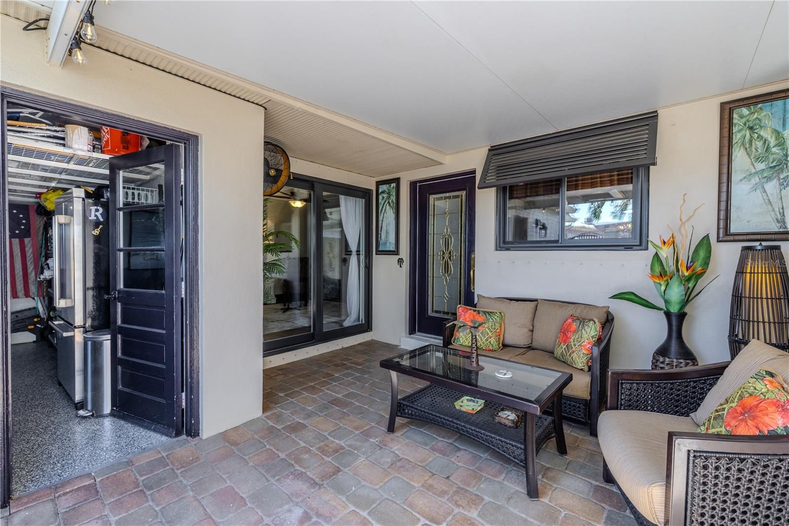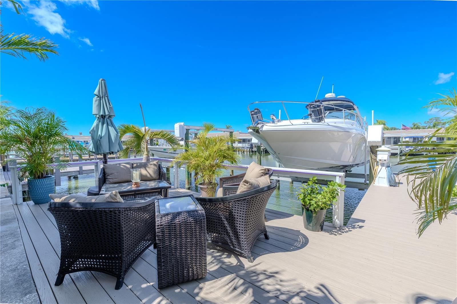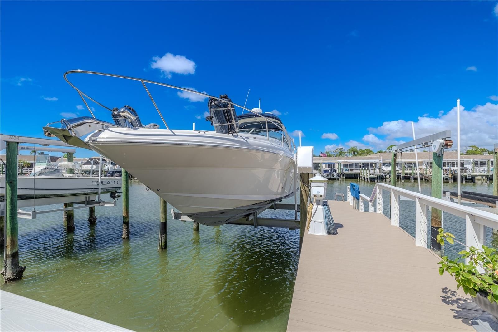 STUNNING WATERFRONT VILLA! Welcome to this beautifully upgraded villa that embodies the ease and charm of coastal Florida living. Designed with care and attention to detail, it provides a perfect balance of comfort, elegance, and function. A private brick-paver courtyard surrounded by tropical landscaping welcomes you home. The space feels peaceful and inviting, with room for a grill or café table and a wall-mounted fan to keep the air cool while you relax outdoors. The decorative glass front door opens to a bright, open-concept interior filled with natural light and a warm coastal feel. Ceramic tile floors flow throughout, creating a polished and cohesive look. Crown molding adds subtle character, and recessed lighting gives each room a soft, even glow. A kitchen window overlooks the courtyard, connecting the indoor and outdoor spaces beautifully. The kitchen blends timeless design with modern convenience. A large granite island provides seating, storage, apron sink with garbage disposal (2020), touch faucet (2025) and built-in outlets. Custom cabinetry and under-cabinet lighting highlight the craftsmanship. The Dacor refrigerator (2020), Sharp under-counter microwave (2025), double built-in oven (2025), dishwasher (2025), and induction range (2021) create a kitchen ready for both everyday living and entertaining. The sleek range hood, pot filler, and dual-zone wine and beverage refrigerator add thoughtful touches, while the built-in TV nook keeps the space relaxed and functional. The dining area flows naturally into the living room, where wide sliding glass doors open to the canal and fill the space with light. The open layout feels spacious yet cozy, ideal for gatherings or quiet evenings at home. The primary suite is a calm retreat with two closets, including one with custom built-ins. The ensuite bathroom feels like a spa with split vanities, stone counters, lighted mirrors, and custom water faucets that complete the designer look. The rainfall shower and jetted soaking tub create the perfect place to unwind, while the built-in linen storage and private water closet add convenience. The second bedroom is versatile, featuring both a walk-in and standard closet. Sliding glass doors installed in 2020 open to the front courtyard, and the retractable screen allows fresh air in during cooler months. The nearby bathroom continues the home’s cohesive style with a frameless shower, stone vanity with copper sink, and built-in storage. At the back of the home, the bonus room overlooks the canal and provides a comfortable space to read, relax, or entertain. Built-in shelving, a fireplace, a TV area, and a storage closet add flexibility. Through the glass doors, the composite deck completed in 2022 extends the living area outdoors, creating a peaceful place to enjoy canal views and breezes from sunrise to sunset. The private dock includes a 16,000-pound oversized boat lift for up to a 36-foot vessel, 50-amp shore power, remote color-changing railing lights, and a lighted pedestal that casts a soft glow across the water at night. Additional updates include a new roof (2025), leased water softener (2020), and water heater (2020). Located in the gated 55+ community of Boca Ciega Point, residents enjoy a friendly, active lifestyle with access to a clubhouse, shuffleboard, pool, tennis courts, and 24-hour security. Just minutes from the beaches, this home reflects the comfort, quality, and serenity that define the best of Florida living.