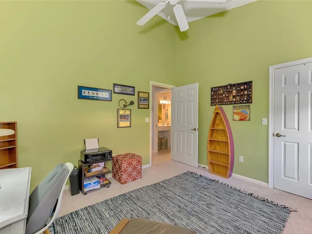 - Ceiling Fan(s), High Ceilings, Kitchen/Family Room Combo, Open Floorplan, Main Level Primary, Split Bedrooms, Stone Counters, Walk-In Closet(s), Window Treatments