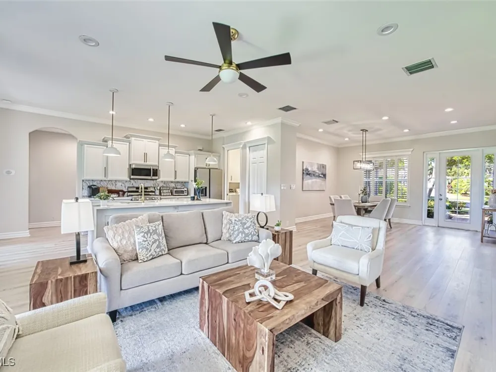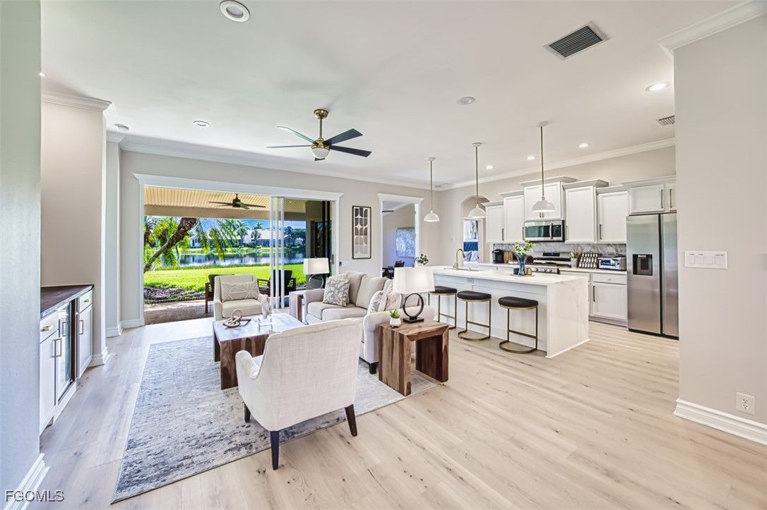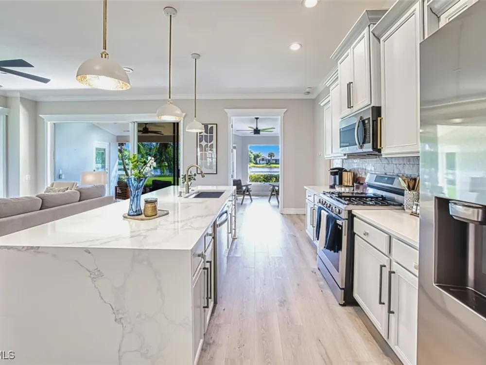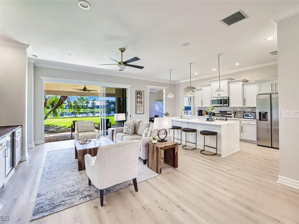 REDUCED PRICE - Lakefront Arthur Rutenberg home on large lot in prestigious Verandah. 4 bedrooms + a sitting room/office/breakfast nook. 3 full baths, including a custom ensuite bath for guests. Completely renovated from top to bottom - new flooring, chef’s kitchen with new stainless-steel appliances, waterfall quartz countertops, freestanding bar area with wine fridge, crown molding, plantation shutters, and natural gas. Professionally decorated and turnkey. U-shaped driveway (plenty of parking) and an open-air lanai with stunning lake view and tons of room for pool/spa on one of the most sough-after streets in the community. Amenities: 36 holes of golf, tennis, pickleball, fitness center, bocce, kayaking, dog park, playground, restaurants, and full social calendar. Act fast opportunities like this don’t last!
