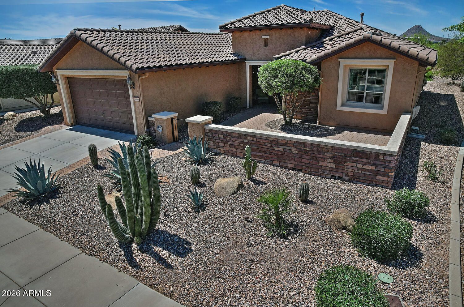This beautifully maintained Newport floorplan features 2 bedrooms, 2 bathrooms and versatile den. Situated on a desirable corner arroyo lot, this home offers added privacy and scenic surroundings. The inviting paver front courtyard creates the perfect space to enjoy Arizona's beautiful mornings, while the extended paver patio in the backyard provides plenty of room for relaxing or entertaining outdoors. The home is offered FULLY FURNISHED and showcases a well-appointed kitchen with granite countertops, stainless steel appliances, staggered maple cabinets and pull out trays. The open layout makes everyday living comfortable and welcoming. Additional highlights include a two ft. extended garage, offering extra space for storage, hobbies or larger vehicles. SIMPLY A MUST SEE HOME!