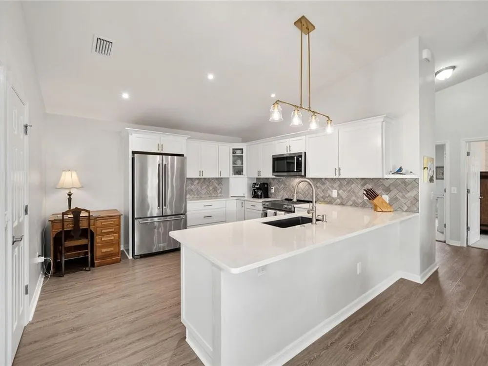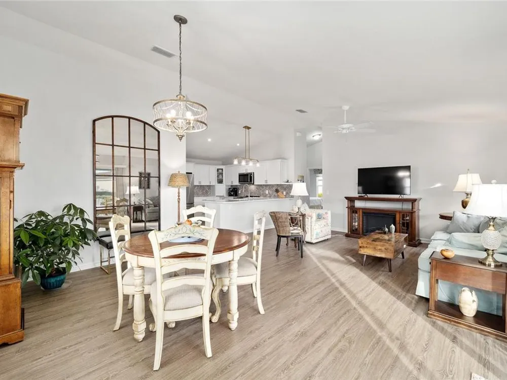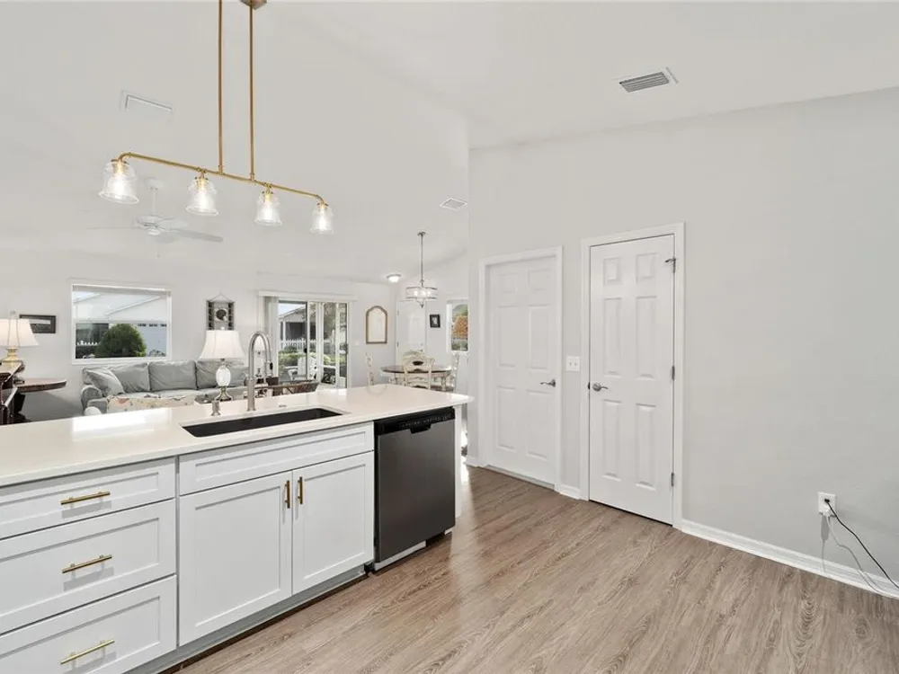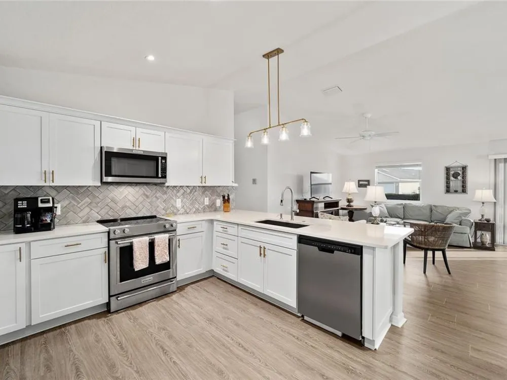 The Village of Collier – Carrabelle Villas – All Electric Colony Patio Villa with Vaulted Ceilings, Luxury Vinyl Plank, Ceiling Fans and Upgraded Lighting – CORNER LOT with ROOM FOR A POOL!! – Expanded Front Patio with a Covered Porch and Side Screened Lanai with NEWLY PAINTED FLOOR!! ** The Kitchen was Remodeled & Upgraded in 2022!! Stainless Steel Appliances (KitchenAid Refrigerator, Range, Microwave 2022), White Shaker Style Cabinets with Crown Molding, Soft Close, Pot Drawers, Upgraded Pulls, Corner Lazy Susan Cabinet, Corner Appliance Barn & Glass Front Display Cabinet, Upgraded Chandelier Light Over Kitchen Sink, Quartz Countertop (Breakfast Bar at Same Level), Tile Backsplash in Herringbone Pattern, Large Granite Composite Sink with Gooseneck Faucet, Mounted Sprayer & Mounted Push Button for Disposal, Closet Pantry with Mounted Rack on Door. NEW PLANTATION SHUTTERS in the Dining Room & Living Room!! -- 2 Bedrooms both with Ceiling Fans, Carpet, Windows and Vaulted Ceilings. Primary Bedroom with a Walk-in Closet -- Primary Bath with Vaulted Ceiling, Recessed Light, Sconce Lighting, Exhaust Fan, Single Vanity with Laminate Top, Medicine Cabinet, All in One Step-in Shower with Grab Bar & Handheld Showerhead -- Guest Bath with Vaulted Ceiling, Recessed Light, Sconce Lighting, Single Vanity with Laminate Top, Tub/Shower Combo All-in-one, Exhaust Fan -- Garage with LG Top-Load Washer & LG Electric Dryer, NEWLY PAINTED FLOOR, Utility Sink, Attic Access and HVAC/Water Heater Closet - - Tastefully Remodeled and in a GREAT LOCATION!! Don’t miss this GEM of a home!!