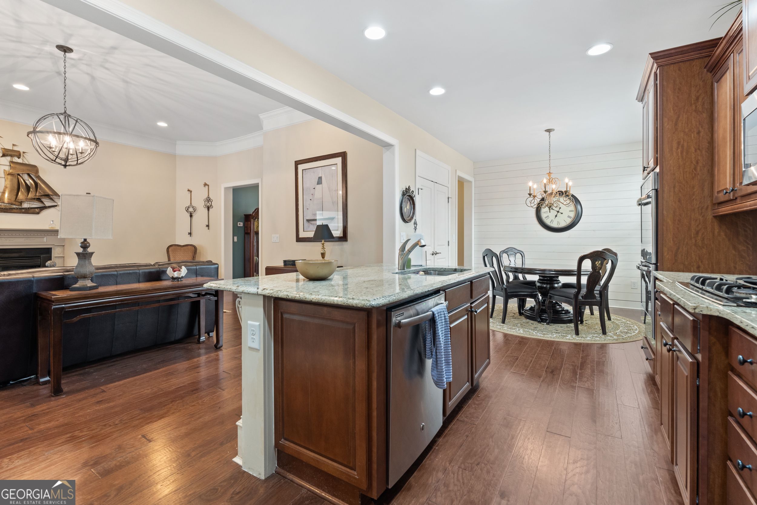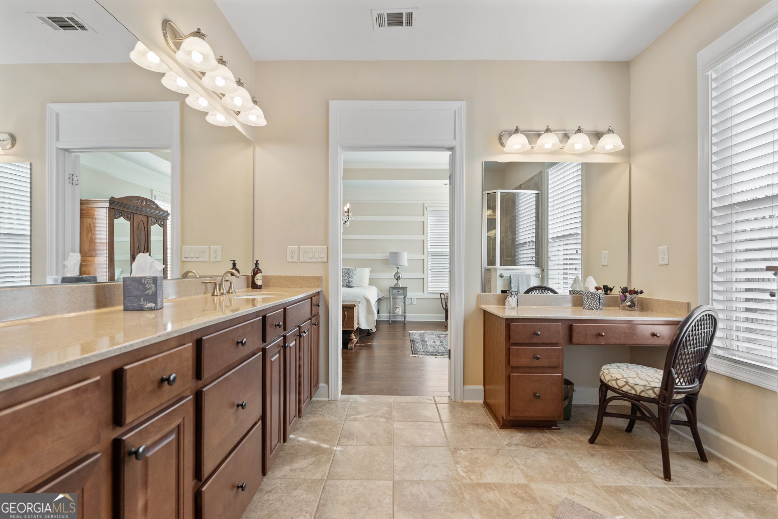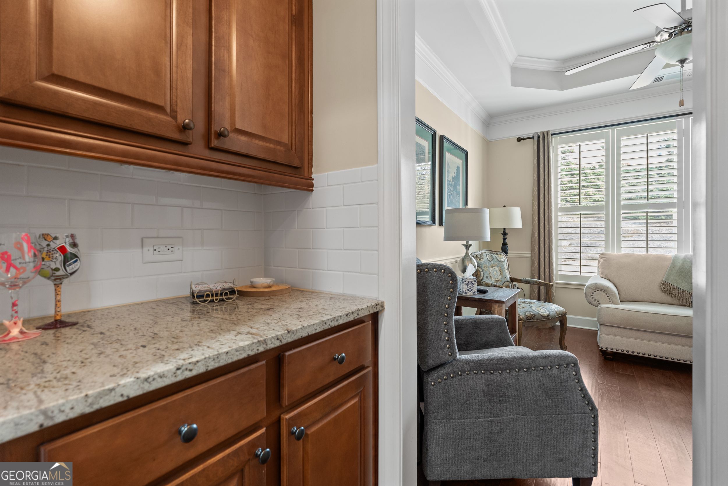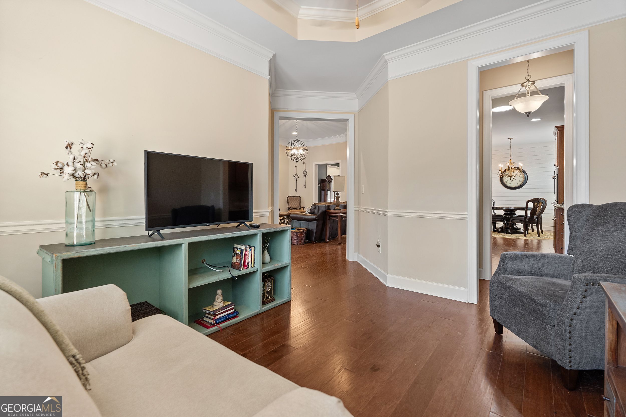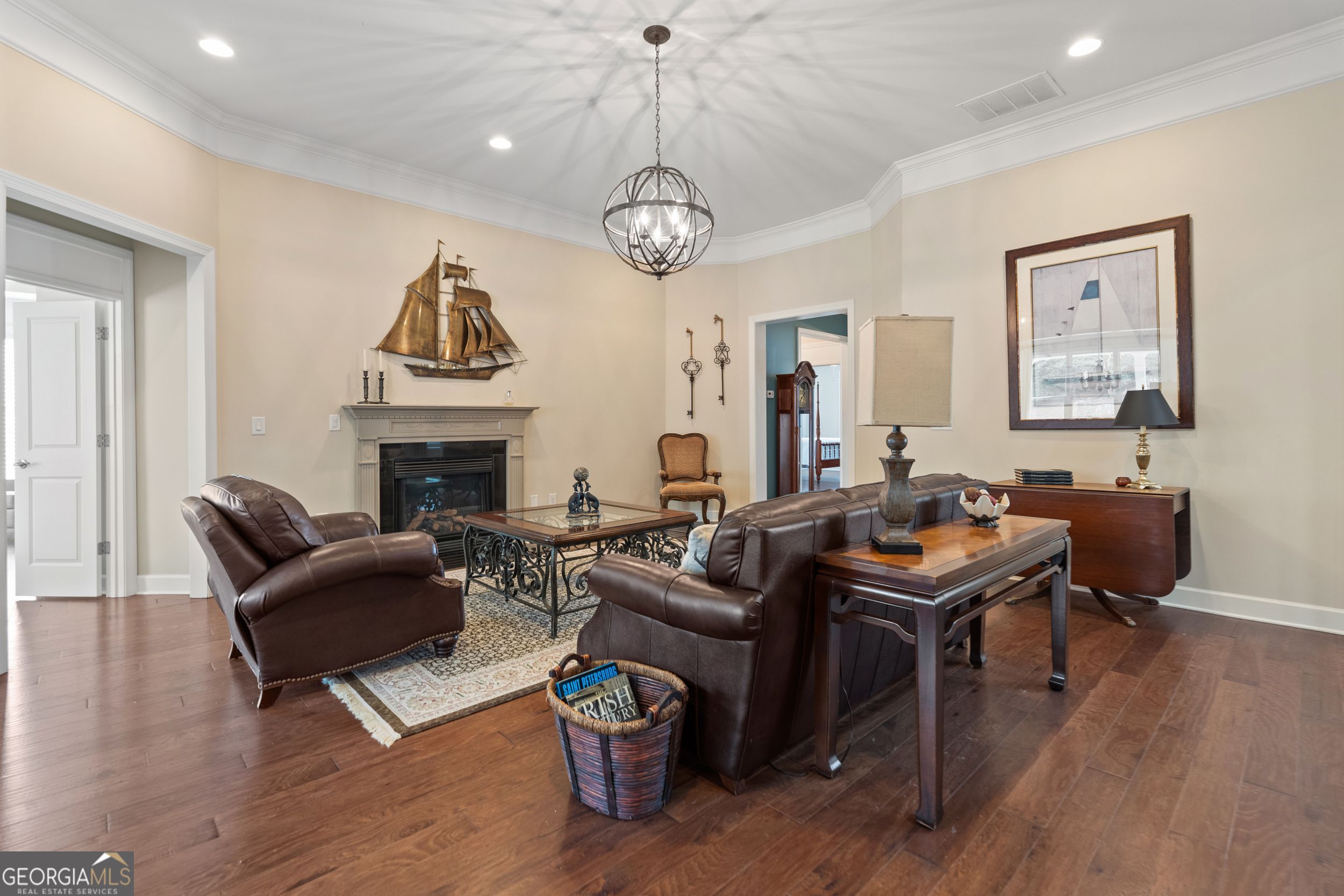 Nestled within the sought-after 55+ Cresswind at Lake Lanier community, this meticulously maintained home offers three bedrooms, 2.5 bathrooms, and 2350 square feet of thoughtfully designed living space, plus an unfinished second floor ideal for future expansion or abundant storage. The interior showcases premium LVP flooring throughout the main living areas, with tile in the bathrooms, complemented by crown molding and recessed lighting. Designed for both comfort and entertaining, the open-concept great room features a cozy fireplace and flows seamlessly into the kitchen and sunroom. An expansive sunroom serves as a spacious dining area, comfortably accommodating larger parties. The well-appointed kitchen boasts stained cabinetry, granite countertops, a large island, stainless steel appliances, dual built-in ovens, a gas cooktop, counter depth SS Refrigerator, Pull out trash cans, and a wet bar-perfect for hosting gatherings. A Sun Tunnel is in the kitchen for added natural light. The Flex Room can be used as a home office, TV room, Game room and so much more. The primary suite offers a relaxing retreat with a tray ceiling, plantation shutters, a generous walk-in closet, dual vanities, a garden tub, and a walk-in shower. Secondary bedrooms share a Jack-and-Jill bathroom with a tub/shower combination. A main-level laundry room includes washer and dryer for added convenience. Outdoors, enjoy a covered, tile-floored patio overlooking a large, level backyard-ideal for relaxing or entertaining. An awning is also added to the back for more entertaining area. The home's exterior was freshly painted in 2025. Residents of Cresswind at Lake Lanier enjoy resort-style amenities with access to a spectacular 43,000-square-foot, three-story clubhouse featuring indoor and outdoor pools, fitness center, pickleball and tennis courts, arts and crafts studio, billiards, poker and game rooms, and a wide variety of clubs and classes. Additional amenities include kayaking, fishing, courtesy boat docks, concerts, dog park, community garden, and the support of an on-site activities director, property manager, and maintenance staff.