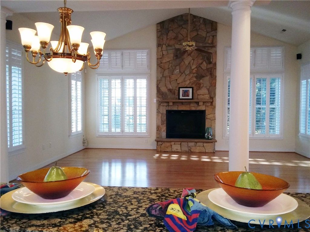 Embrace a Maintenance-Free Lifestyle living at The Manor at Hunton Park, Henrico's gated west end 55+ community. This beautifully maintained home on a premium lot, features bright, open-concept living with soaring ceilings, hardwood floors, plantation shutters throughout and a first floor primary suite. The kitchen has a tray ceiling and is equipped with stainless steel appliances, smooth top cooking, granite counters, tiled backsplash, center isle with prep sink and wine cooler, breakfast nook, pantry and plenty of cabinetry. The dining room with wainscot, tray ceiling, chandelier and doric columns leads way to the spacious living room with a stone surround gas fireplace, vaulted ceiling with ceiling fan and patio access. The intimate first floor primary suite features a tray ceiling with ceiling fan, fireplace with TV niche, two walk-in closets, patio access and a private en Suite with a huge walk-in shower, water closet, and double vanities. The second floor continues to impress with two additional bedrooms, a Jack N Jill bathroom and walk-up floored attic access. Enjoy the private outdoor patio featuring a remote retractable awning to keep you shaded on sunny days. A 1st floor laundry room with washer & dryer and direct access to the attached 2-car garage complete this home. Both HVAC units replaced 2020. New roof 2024. For peace of mind, seller to provide a one year First American Home Warranty. Conveniently located to shopping, eateries, medical facilities, libraries and interstates. Just 15 minutes from Short Pump Town Center.