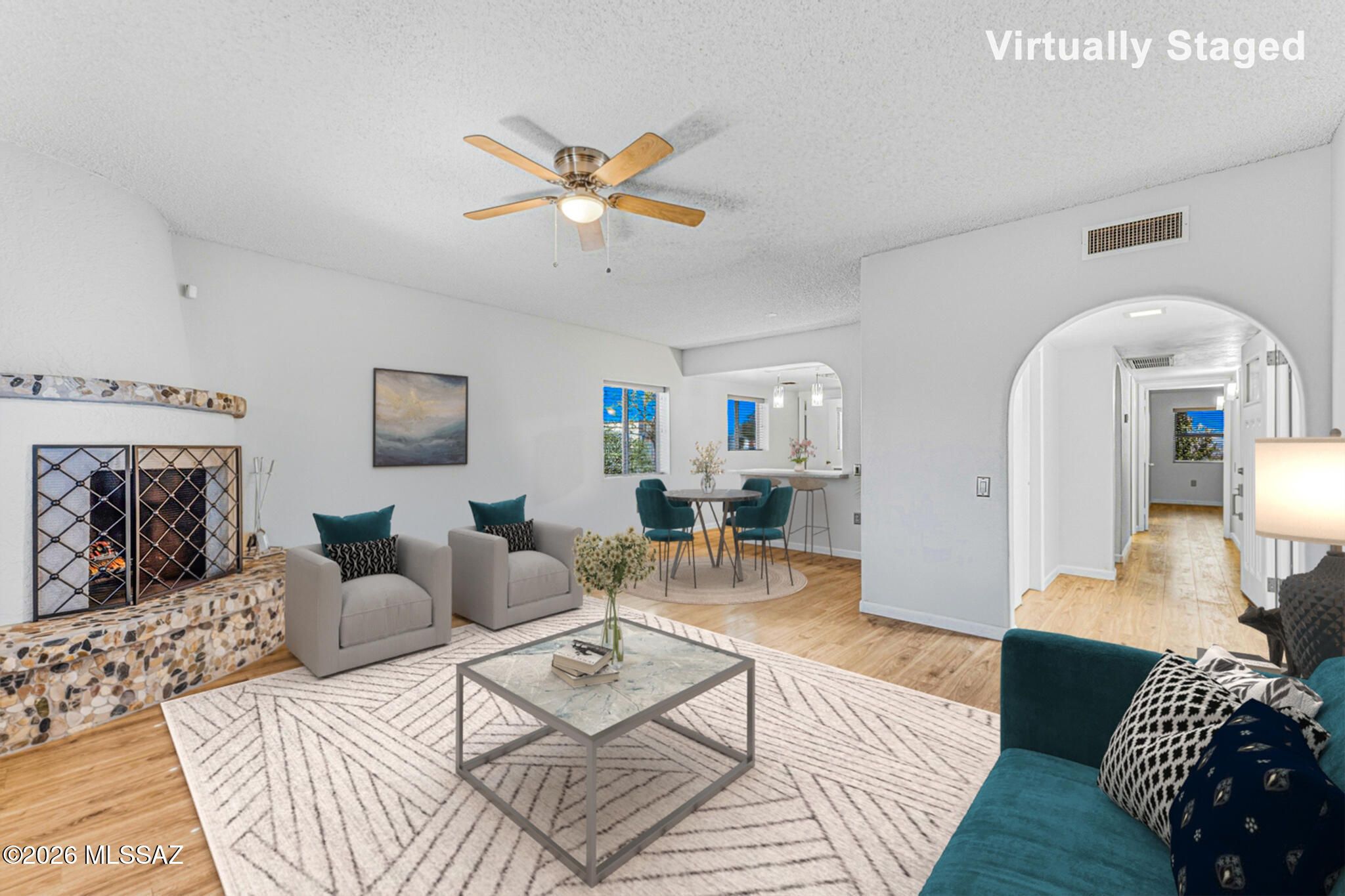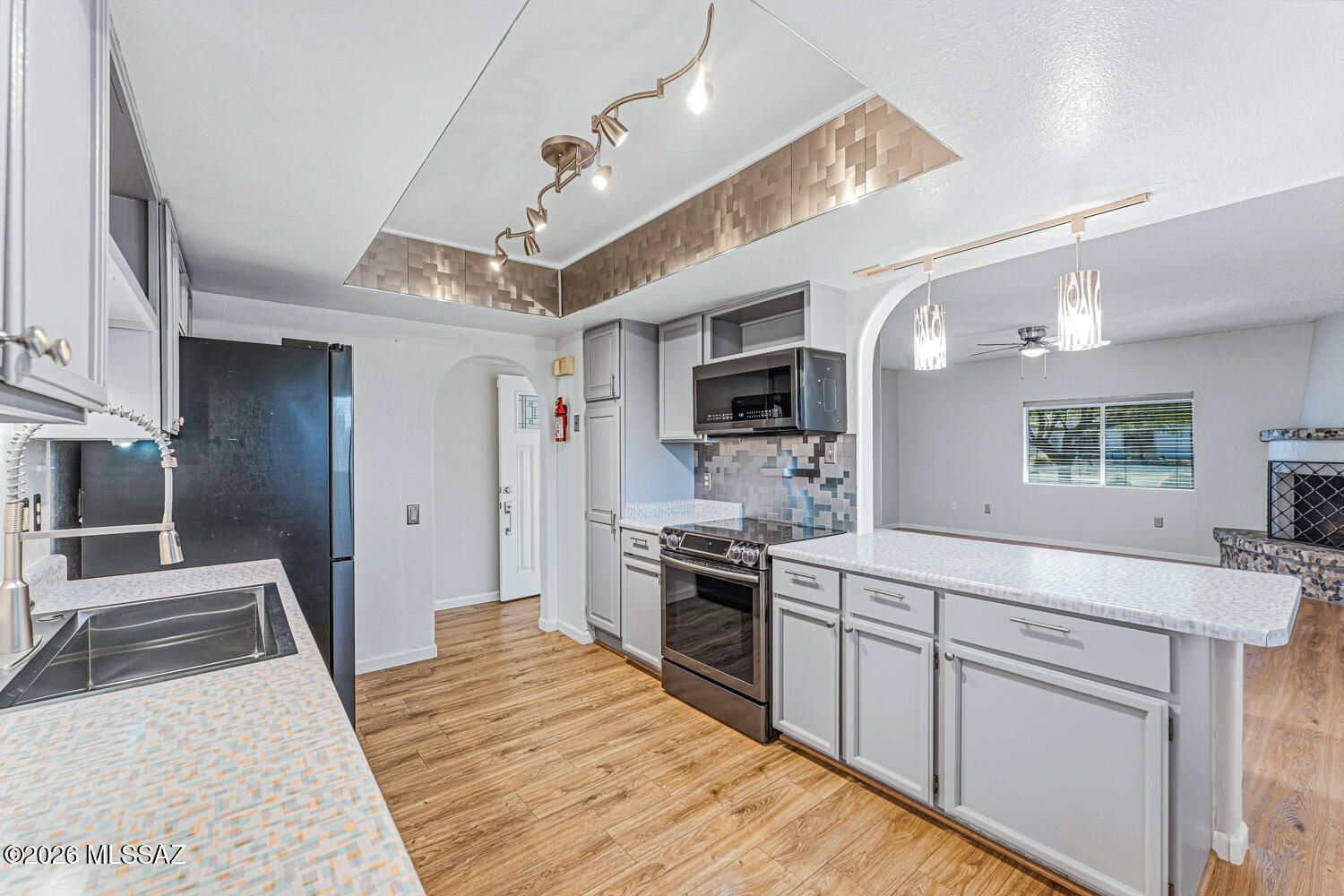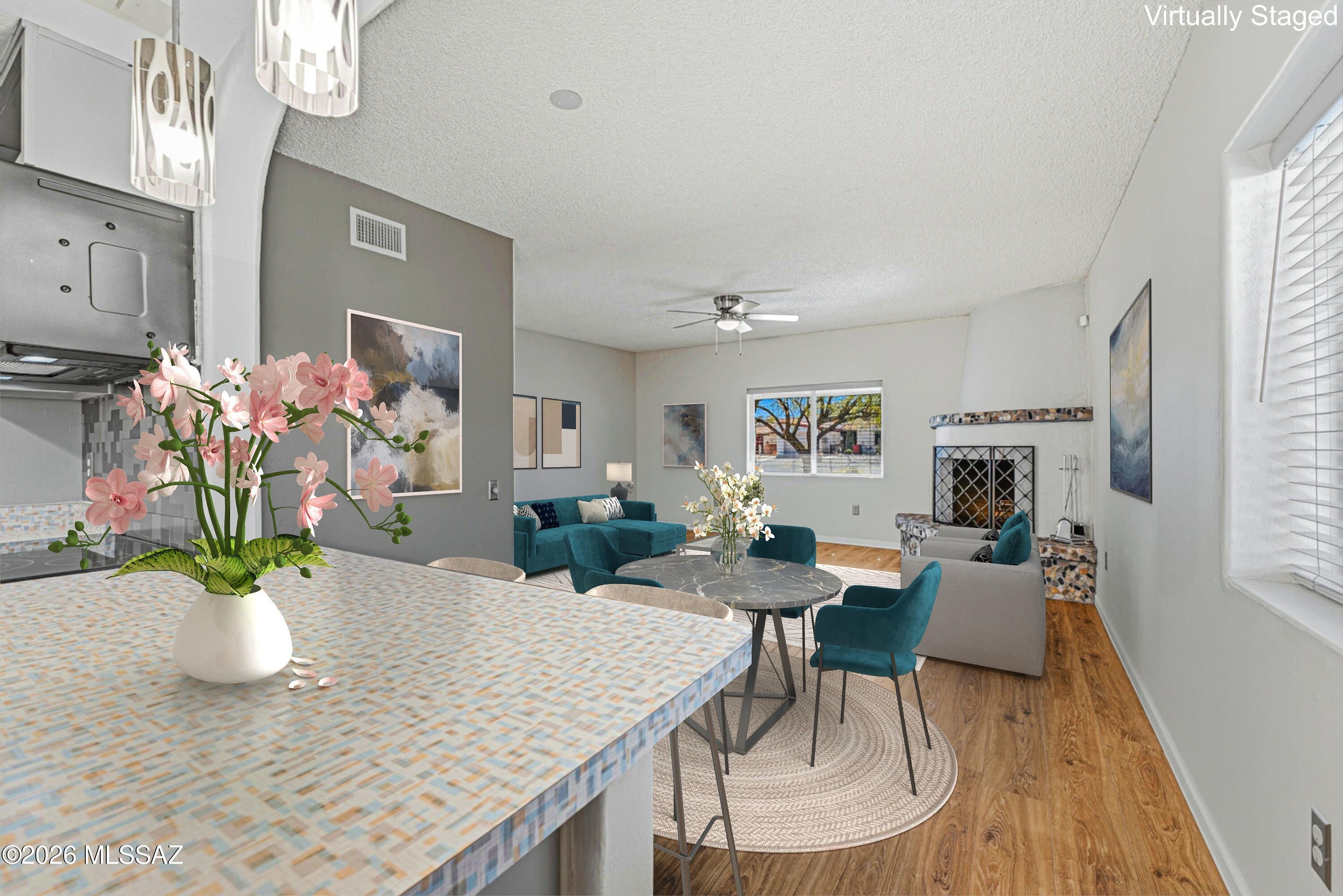 Find your perfect Arizona escape in this lovely 2-bedroom, 2-bath townhome with an Arizona room, ideally situated on a desirable corner lot! From the moment you step inside, you'll love the luxury vinyl plank flooring, cozy beehive fireplace, and updated lighting and ceiling fans that give the home a warm, modern vibe. The kitchen is both functional and fresh, featuring stainless steel appliances (2019), a stainless steel farmhouse sink with updated faucet, and newer laminate countertops. Peace of mind comes standard with a 5-year-old HVAC system, roof recoated in 2024 with high-quality materials, and a water heater replaced in 2020. Both bathrooms have been fully remodeled with sleek modern vanities, updated fixtures, new flooring and mirrors. The Arizona room offers incredible