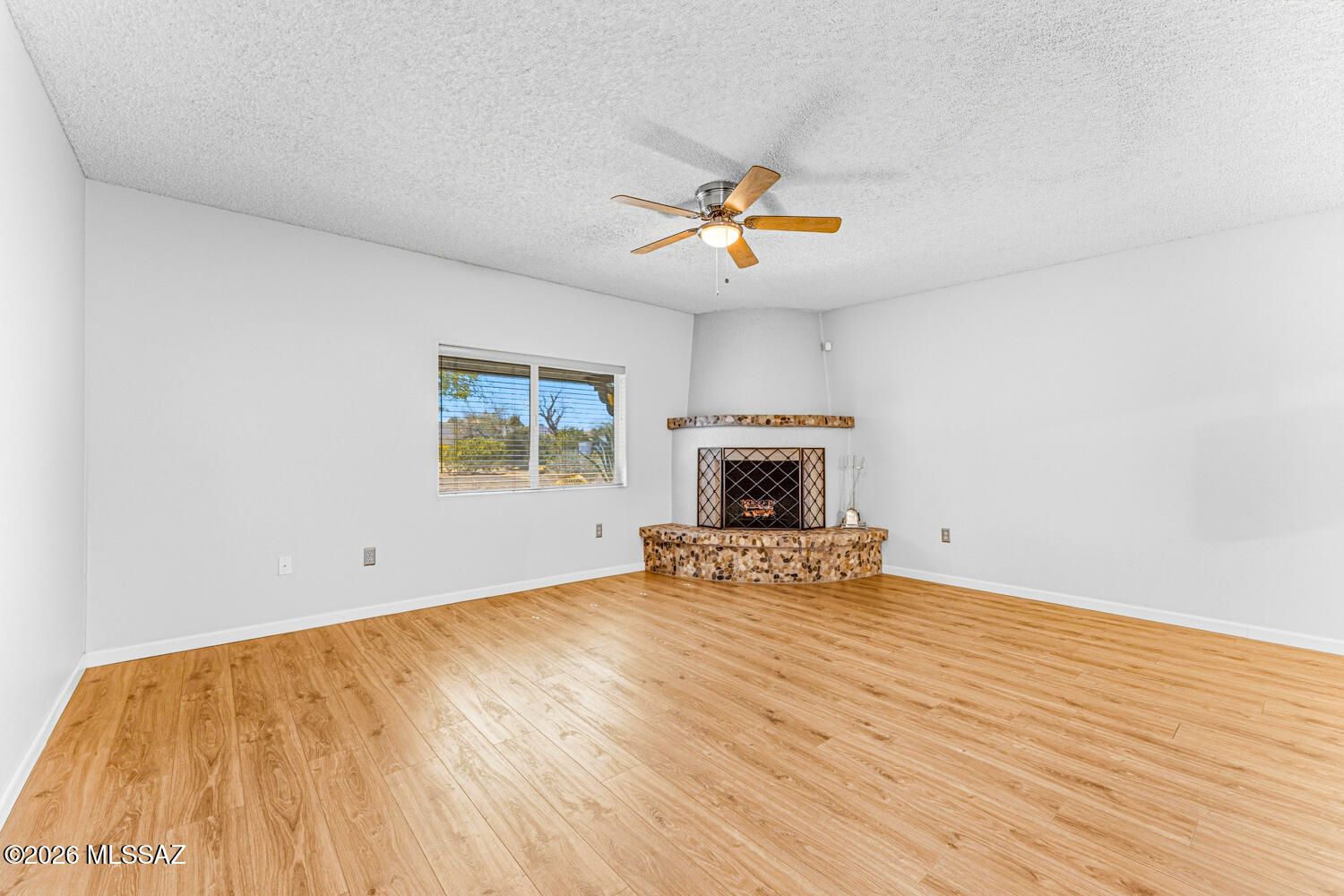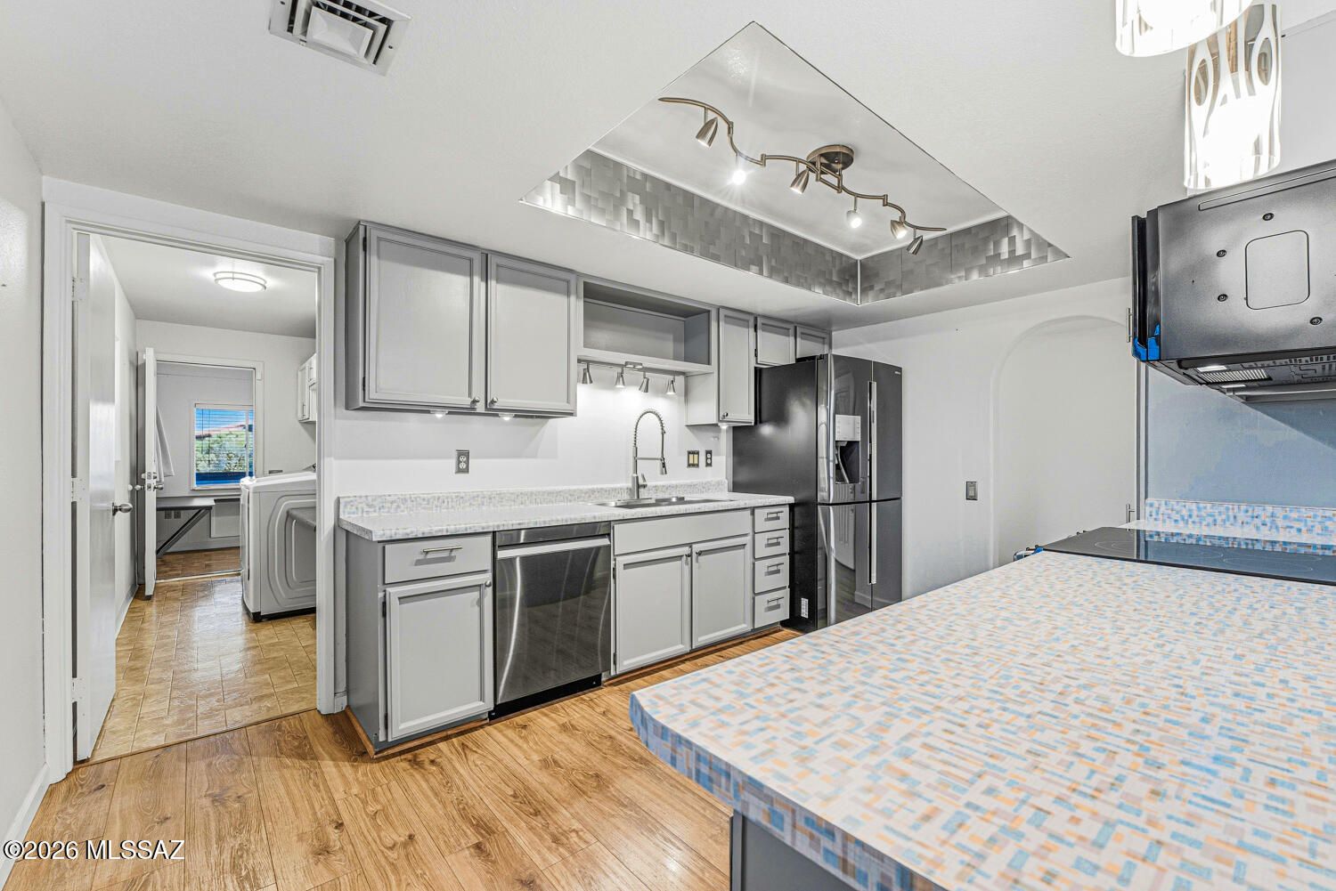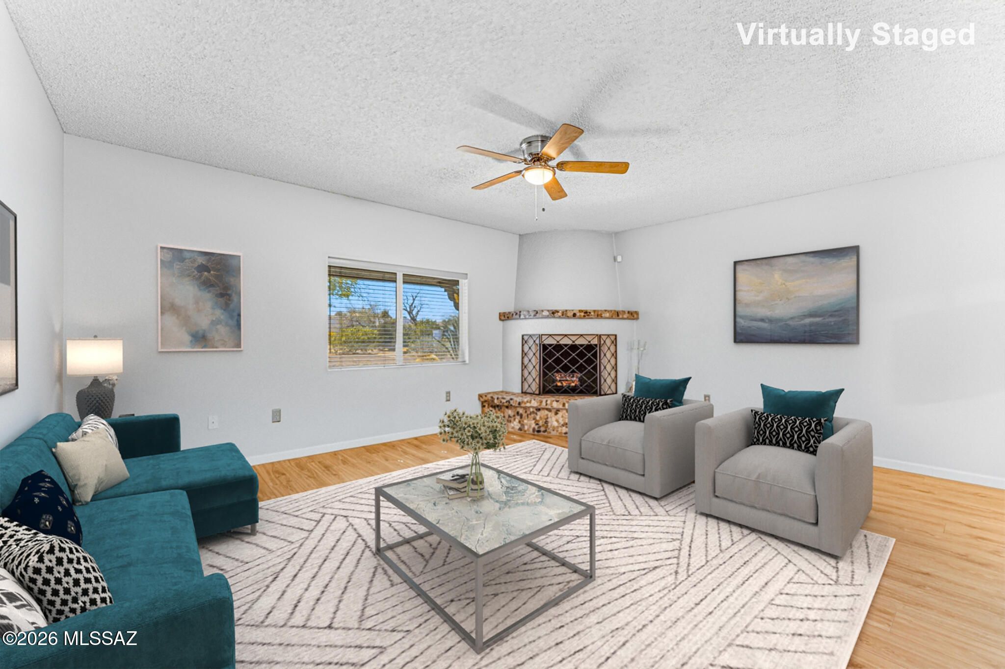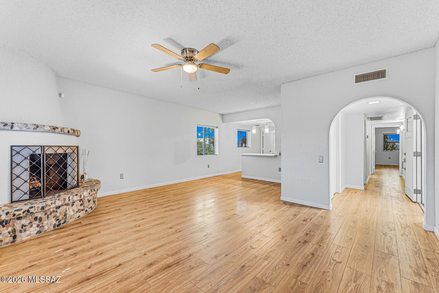 Find your perfect Arizona escape in this lovely 2-bedroom, 2-bath townhome with an Arizona room, ideally situated on a desirable corner lot! From the moment you step inside, you'll love the luxury vinyl plank flooring, cozy beehive fireplace, and updated lighting and ceiling fans that give the home a warm, modern vibe. The kitchen is both functional and fresh, featuring stainless steel appliances (2019), a stainless steel farmhouse sink with updated faucet, and newer laminate countertops. Peace of mind comes standard with a 5-year-old HVAC system, roof recoated in 2024 with high-quality materials, and a water heater replaced in 2020. Both bathrooms have been fully remodeled with sleek modern vanities, updated fixtures, new flooring and mirrors. The Arizona room offers incredible