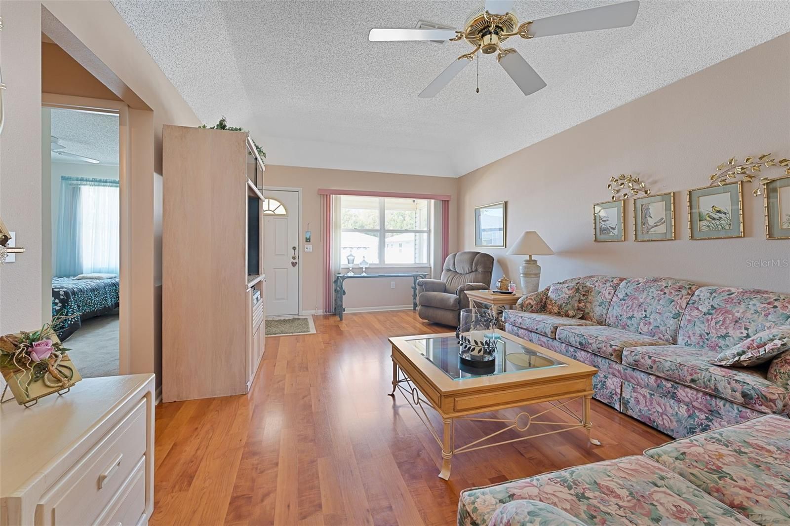 You will love this well-maintained, light and bright home in the highly desirable Highland Fairways 55+ golf community. A spacious kitchen, formal dining room, good size living room, and abundant storage make everyday living exceptionally comfortable. The inviting screened-in front porch is perfect for enjoying Florida weather and chatting with neighbors as they stroll by. Inside, the open floor plan flows seamlessly from the front entry through the living and dining areas and continues straight to the screened-in back porch—an ideal layout for both relaxing and entertaining. Interior highlights include laminate flooring in the living and dining areas, carpeted bedrooms, tile in the kitchen and laundry room, and an inside laundry room for added convenience. Furniture is optional and may remain. A new roof was installed in 2023, offering peace of mind for years to come. Highland Fairways offers an active outdoors lifestyle with amenities such as golf, a heated pool, tennis courts, shuffleboard, bocce ball, and a horseshoe pit. Inside, the clubhouse hosts dances, entertainers, dinners, potlucks, cards, games, clubs, an exercise room, and more—truly too many activities to list. You can be as active and social as you would like. This home is priced to sell and ready for you to enjoy the best of Florida’s active adult living. Take a look—this one won’t last long.