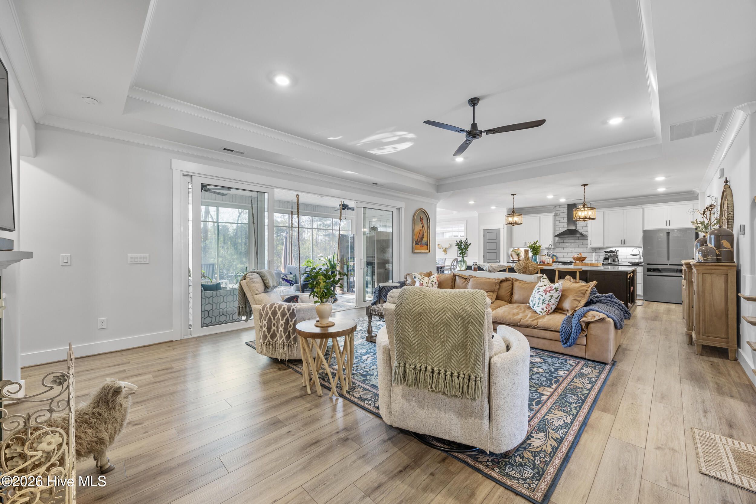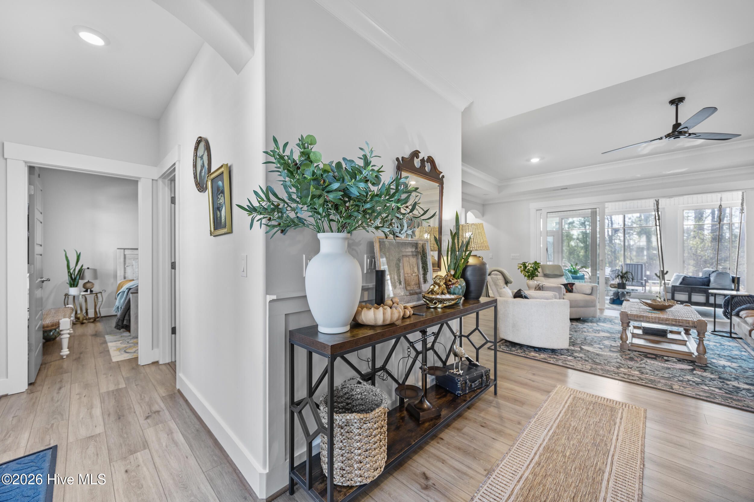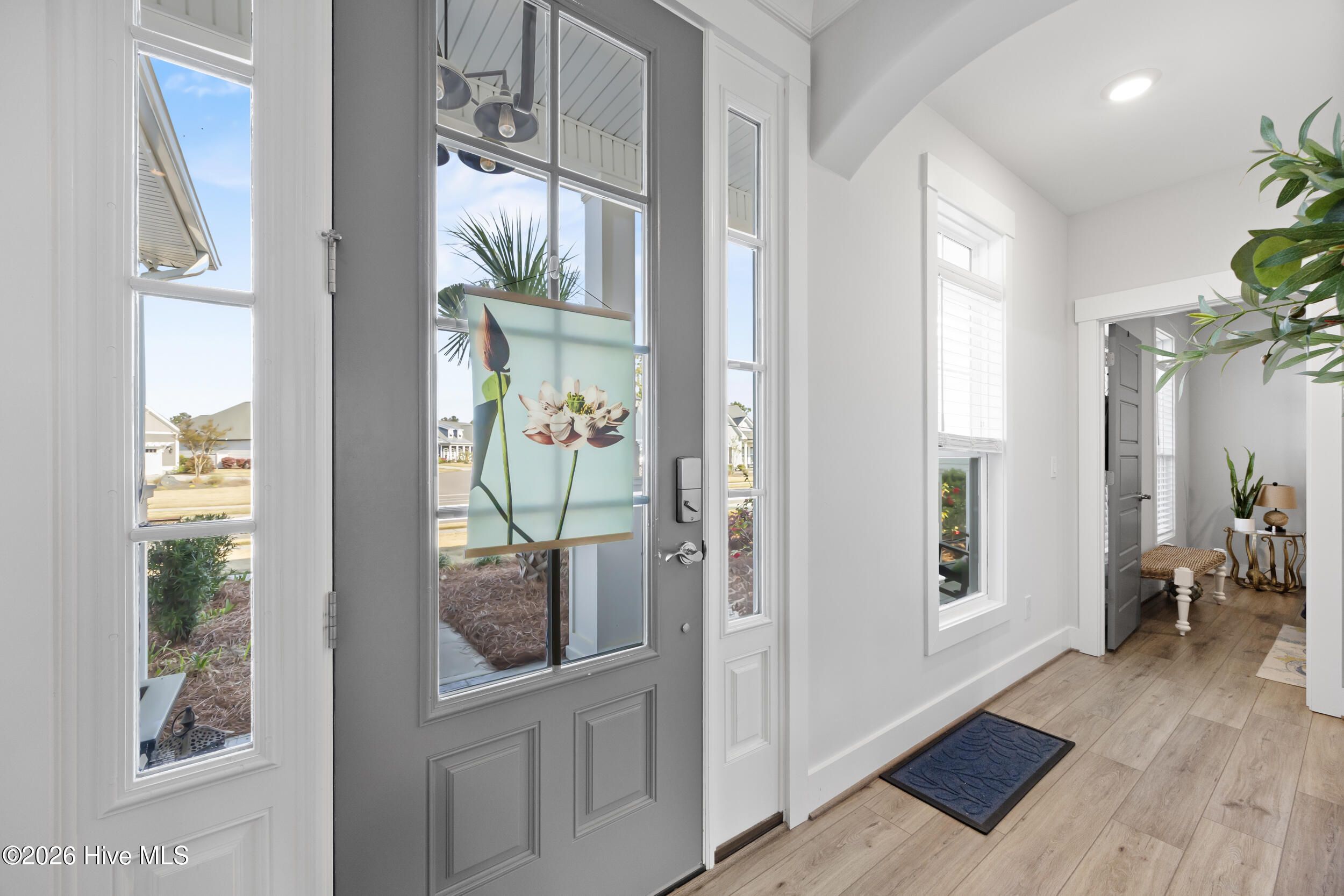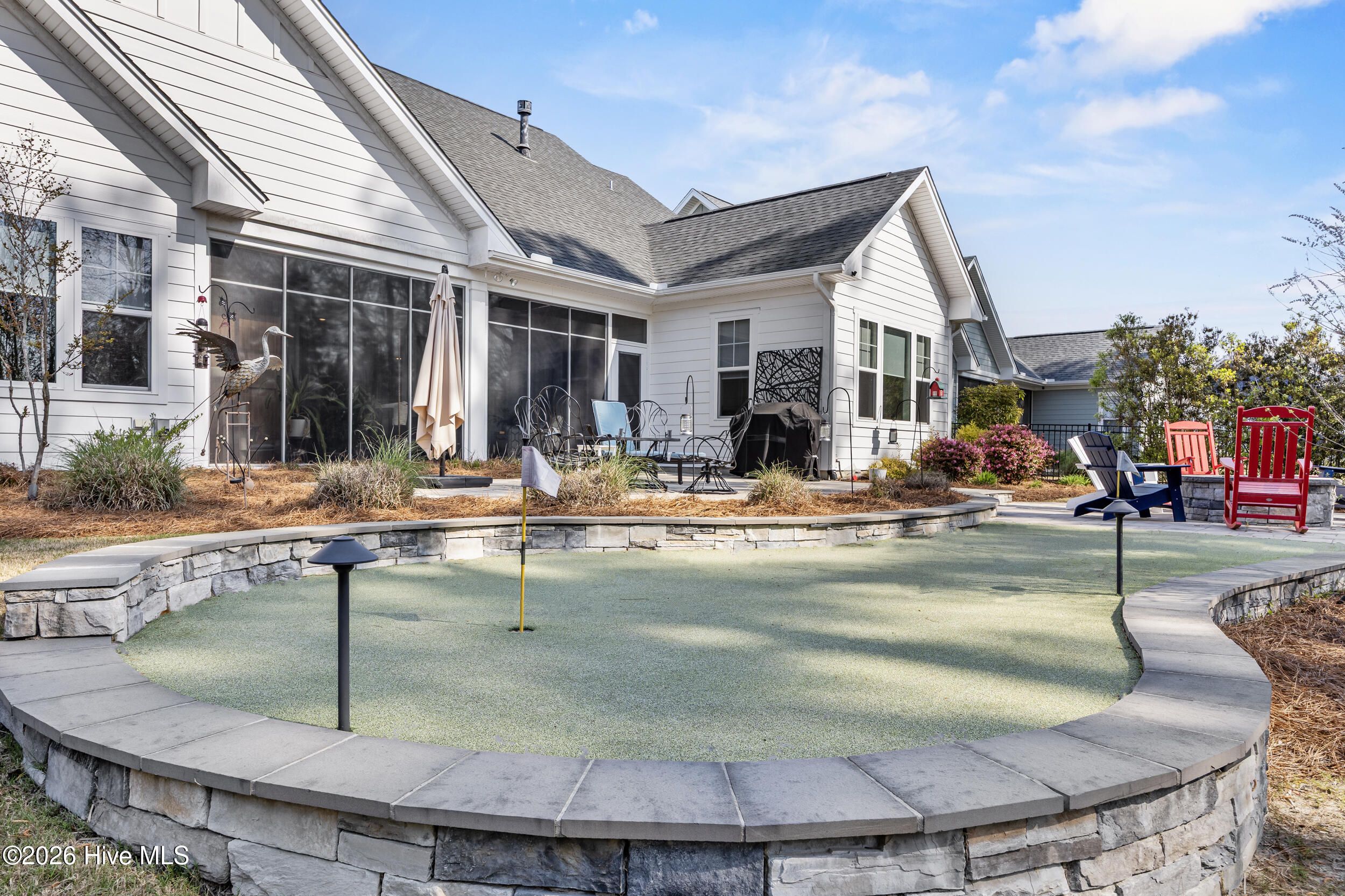 A standout in Egret Cove in Brunswick Forest, this striking white farmhouse with bold black trim offers a refreshing alternative to the typical cookie-cutter home, designed with character and thoughtful detail at every turn. Built in 2021, this nearly 2,500 sq ft residence features 3 bedrooms, 3 full bathrooms, and a spacious bonus room. From the moment you step inside, the foyer sets the tone with elevated finishes and a welcoming layout. A front bedroom with two closets sits just off the entry, with a full bathroom nearby showcasing colorful wallpaper. Throughout the home, you'll find wide plank LVP flooring (perfect for coastal living) paired with design elements like arched doorways, tray ceilings, wainscoting, barn doors, shiplap accents, and eye-catching wallpaper that add warmth and personality. The main living area is open and inviting, ideal for both everyday living and entertaining. The kitchen is a true centerpiece, featuring an expansive island with seating, built-in cabinetry and shelving, a microwave drawer, subway tile backsplash, and high-end appliances including a gas cooktop with vent hood. The adjoining living room offers a cozy gas log fireplace flanked by custom built-ins, accented with stylish wallpaper and lighting. Seamlessly extending the living space, a four-panel sliding glass door opens to a screened-in porch with EZ Breeze panels, creating the perfect year-round retreat. Whether you're relaxing on the daybed swing or catching a game, this space is made for unwinding. The primary suite is a serene escape with a shiplap accent wall, dual walk-in closets, and a spacious ensuite featuring dual vanities and a zero-entry walk-in shower. Upstairs, you'll find an additional bedroom, full bathroom, and a large bonus room that easily functions as a fourth bedroom, media room, or home office. Out back, the yard is ready for entertaining with a generous patio, fire pit area, and even a private putting green--bringing a touch of resort living right to your backyard. Additional highlights include a functional mudroom off the garage and a floored walk-in attic for ample storage. Located in the Egret Cove section of Brunswick Forest, this home offers access to one of the area's most amenity-rich communities. Residents enjoy multiple outdoor pools, an indoor pool, fitness centers, miles of walking and biking trails, tennis and pickleball courts, parks, and a full calendar of social events. The community also features convenient on-site shopping, dining, and medical offices, along with the renowned Cape Fear National Golf Course. Just minutes from downtown Wilmington, area beaches, and I-40, this home truly offers the best of coastal living.